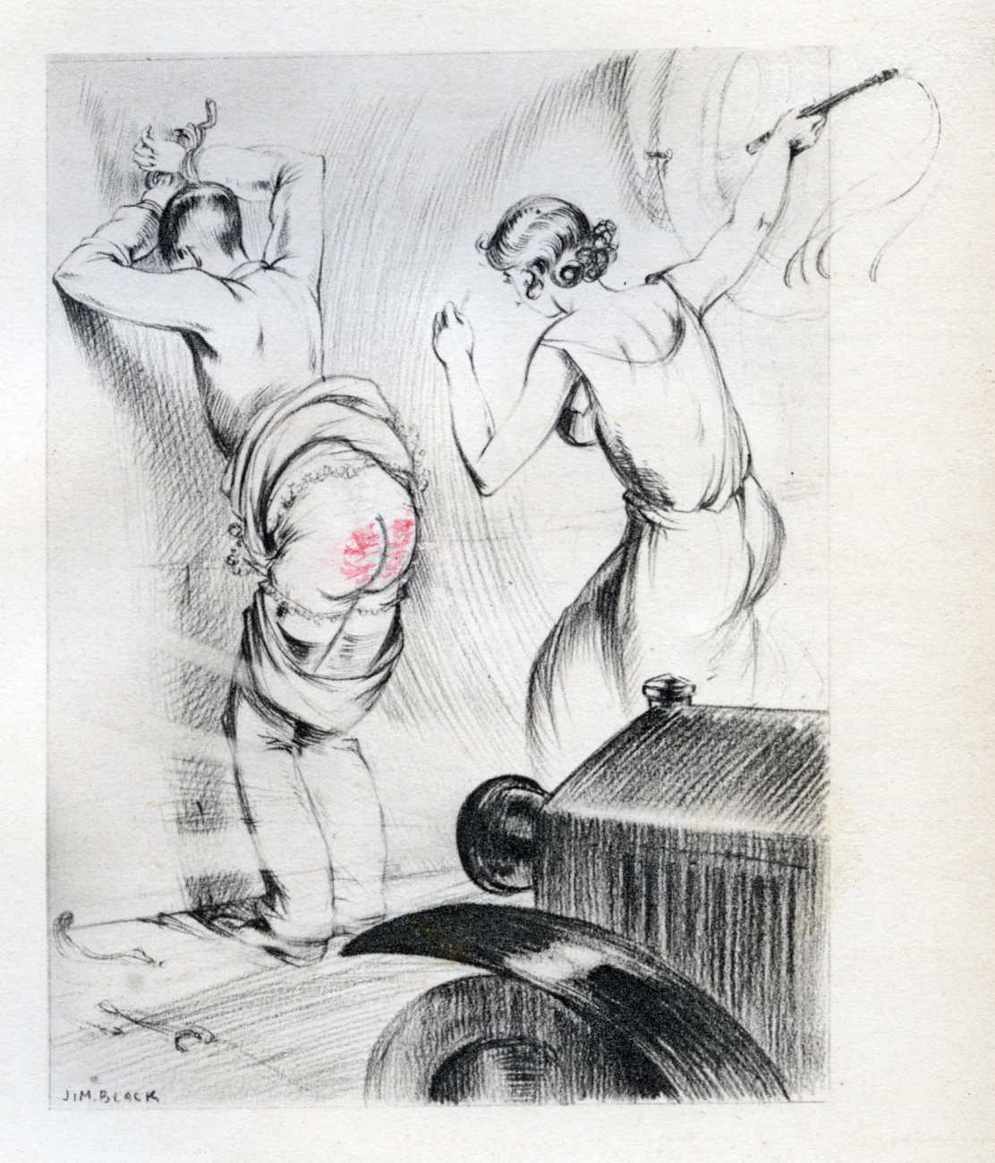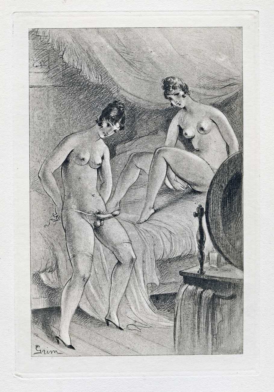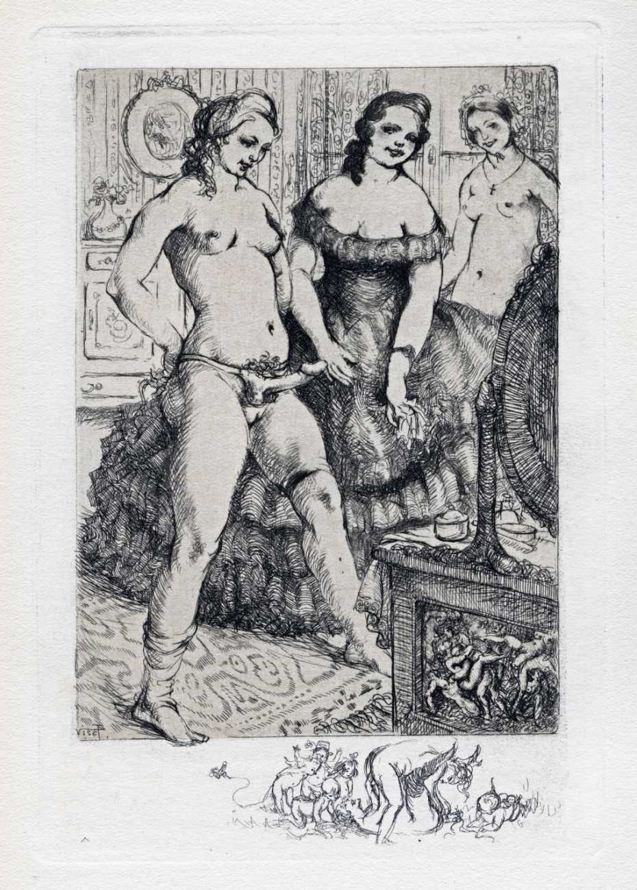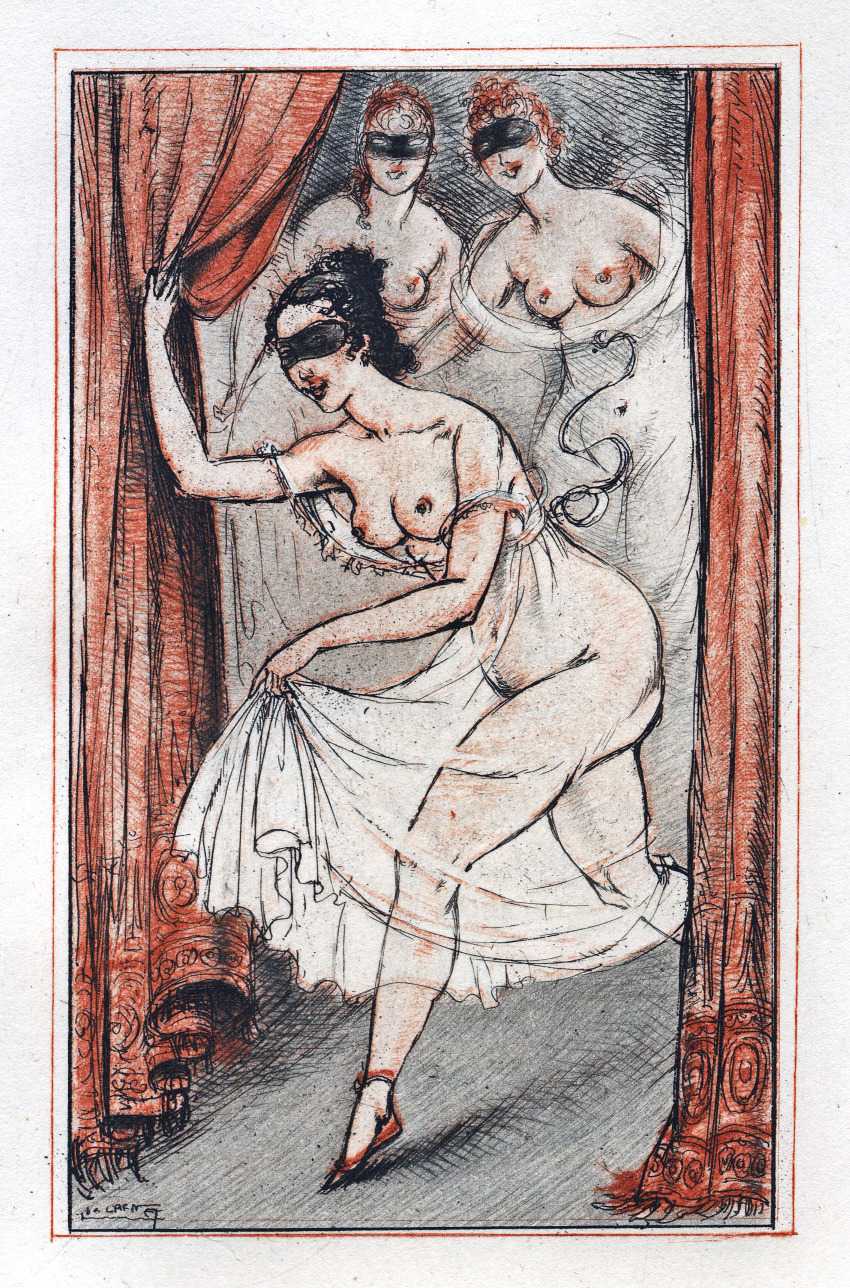 Luc Lafnet started producing book illustrations in the early 1920s, in a style clearly influenced by Heironymus Bosch and Martin van der Maele, often with grotesque and risqué comic elements. By 1927 he had been discovered by several well-known Parisian erotic publishers, including Georges Briffaut, Jean Fort and Maurice Duflou, but carefully distanced himself from immediate recognition by using a variety of pseudonyms, including ‘Jim Black’, ‘Viset’, ‘O. Lucas’, ‘Pol’, ‘Grim’, and ‘Luc’. His ability to produce quality work quickly was conducive to his success and popularity, and by the early 1930s he was producing engravings, paintings and comic strips in a flurry of creativity. As with his pioneering comic strip work, where he worked with Blanche Demoulin and Robert Velter to develop characters like the well-known Spirou, Lafnet’s erotic work was mostly known only to the select audience who recognised and valued his imaginative work. By the time he produced the illustrations to Lettres à la présidente, Zoloé et ses deux acolytes, and Les stations de l’amour, his unique erotic style was fully-formed. The fact that he was not averse to illustrating BDSM classics like Dresseuses d’hommes, Les geôles de dentelles and L’école des biches only added to his popularity in appreciative Parisian circles.