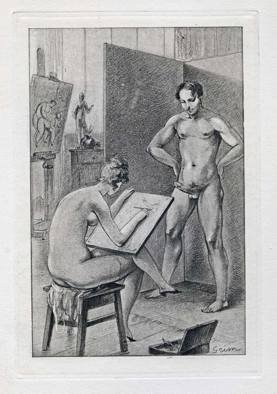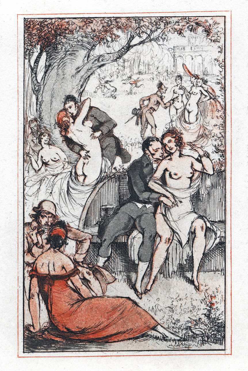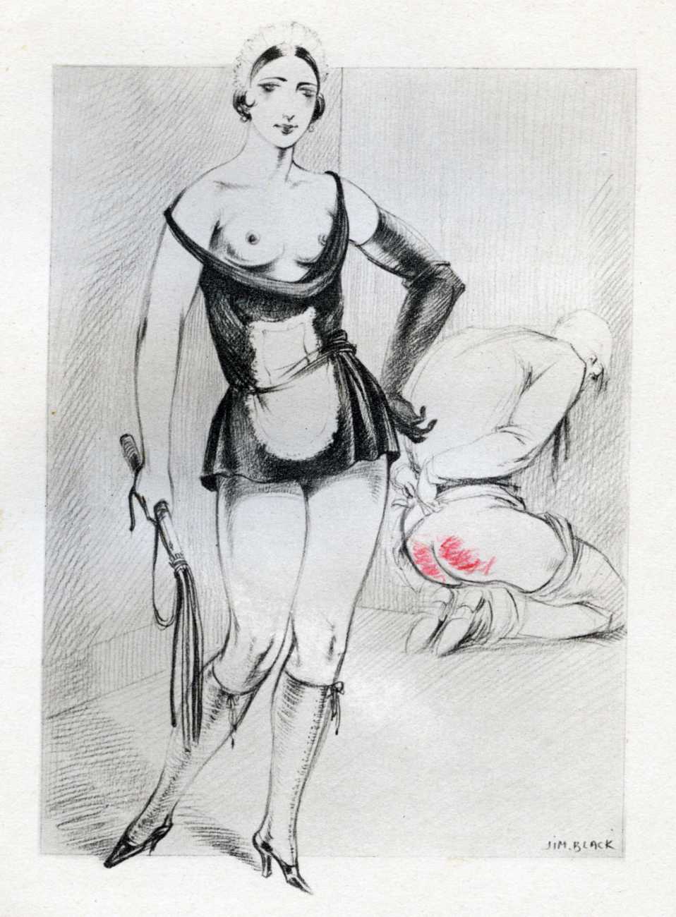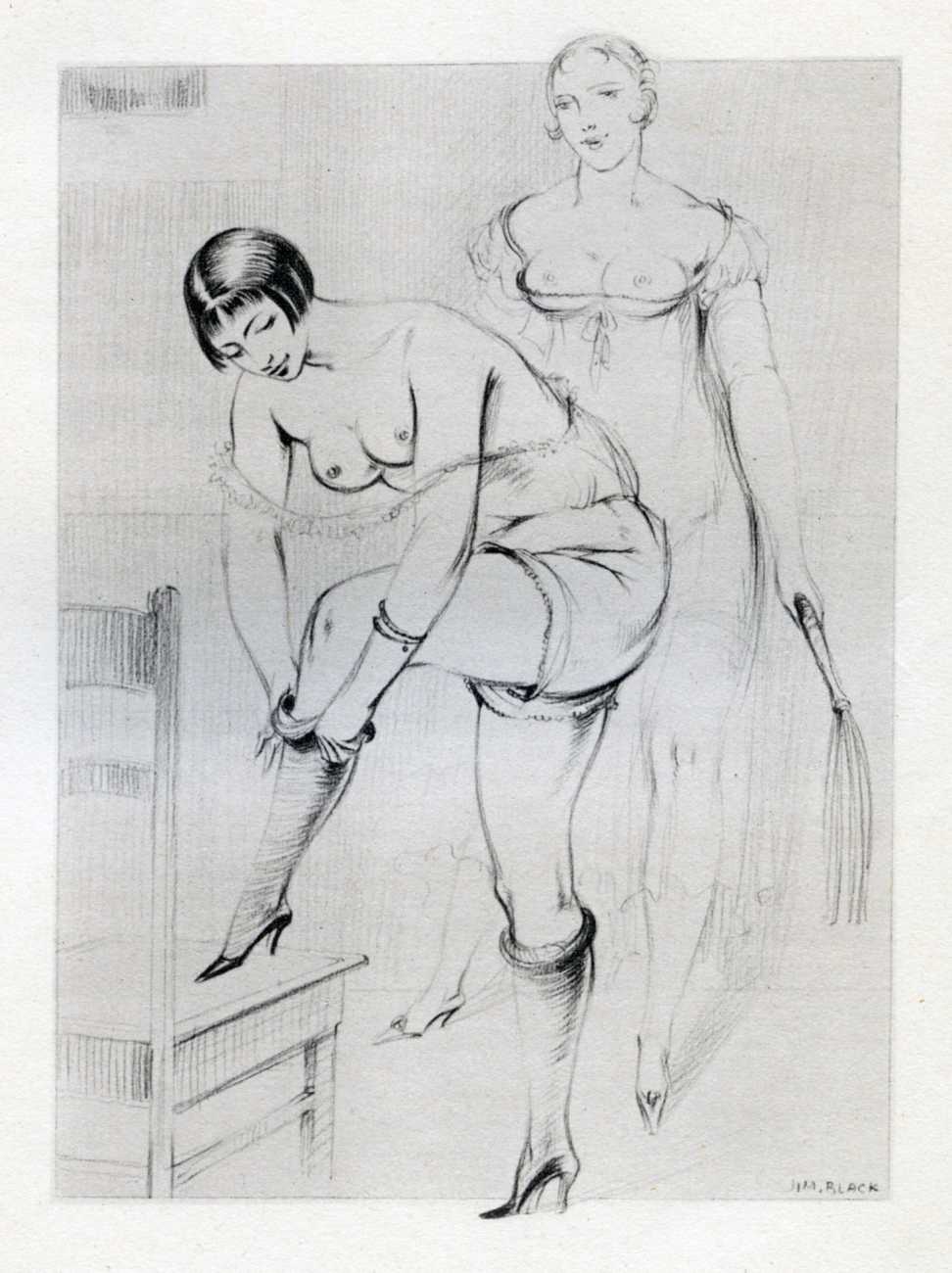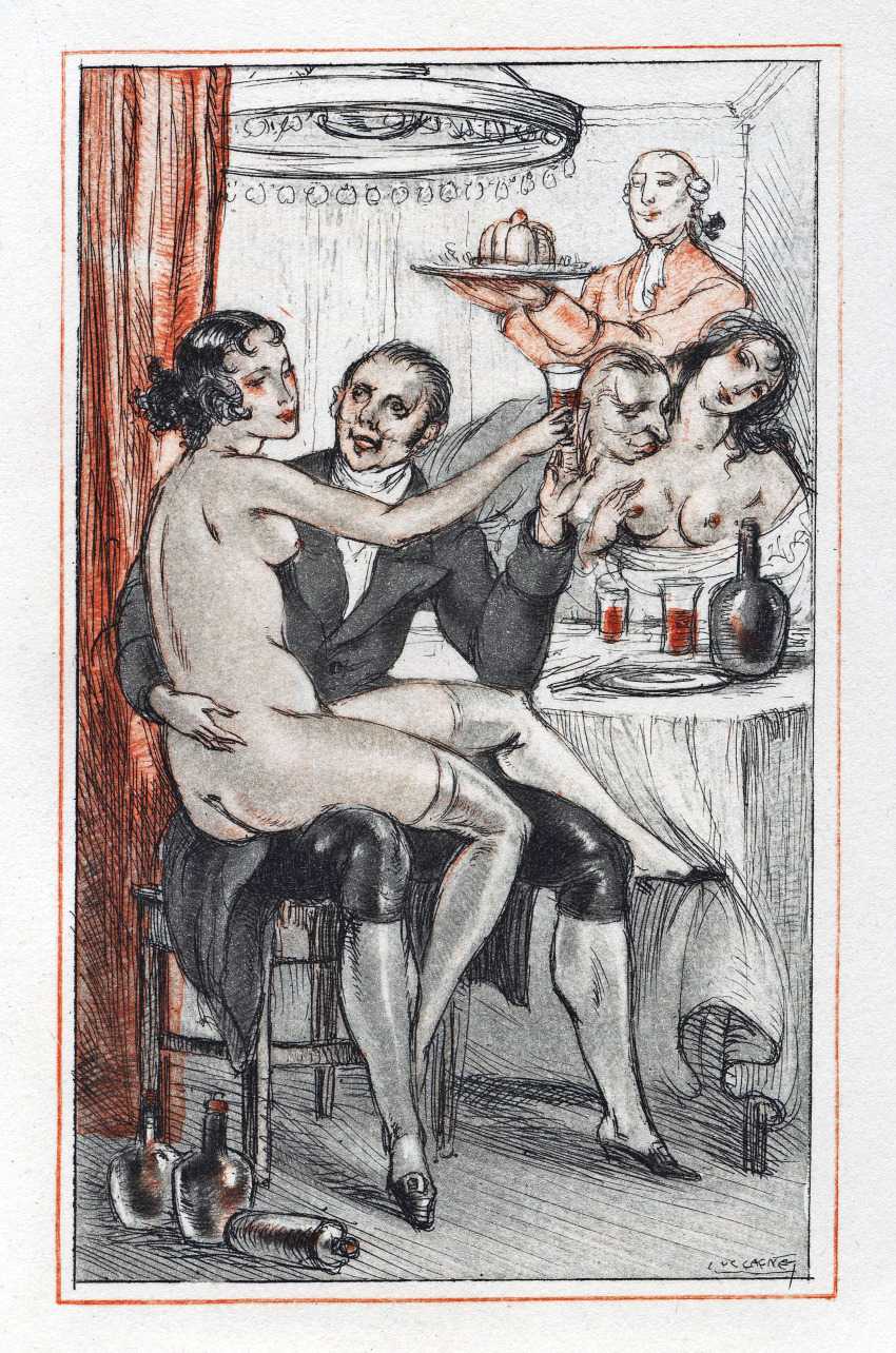 Luc Lafnet started producing book illustrations in the early 1920s, in a style clearly influenced by Heironymus Bosch and Martin van der Maele, often with grotesque and risqué comic elements. By 1927 he had been discovered by several well-known Parisian erotic publishers, including Georges Briffaut, Jean Fort and Maurice Duflou, but carefully distanced himself from immediate recognition by using a variety of pseudonyms, including ‘Jim Black’, ‘Viset’, ‘O. Lucas’, ‘Pol’, ‘Grim’, and ‘Luc’. His ability to produce quality work quickly was conducive to his success and popularity, and by the early 1930s he was producing engravings, paintings and comic strips in a flurry of creativity. As with his pioneering comic strip work, where he worked with Blanche Demoulin and Robert Velter to develop characters like the well-known Spirou, Lafnet’s erotic work was mostly known only to the select audience who recognised and valued his imaginative work. By the time he produced the illustrations to Lettres à la présidente, Zoloé et ses deux acolytes, and Les stations de l’amour, his unique erotic style was fully-formed. The fact that he was not averse to illustrating BDSM classics like Dresseuses d’hommes, Les geôles de dentelles and L’école des biches only added to his popularity in appreciative Parisian circles.