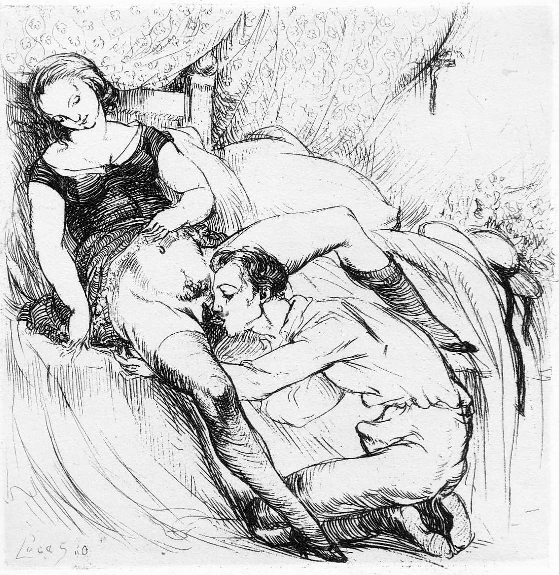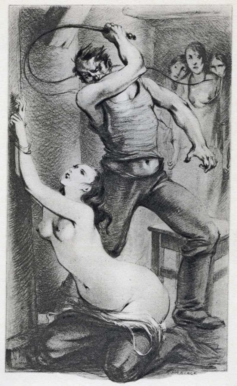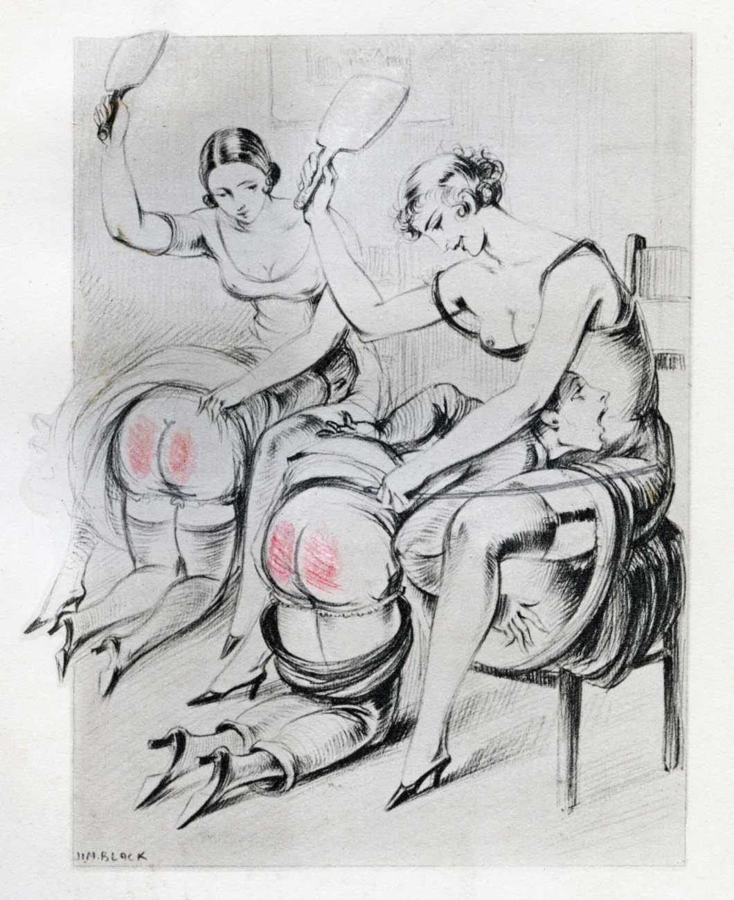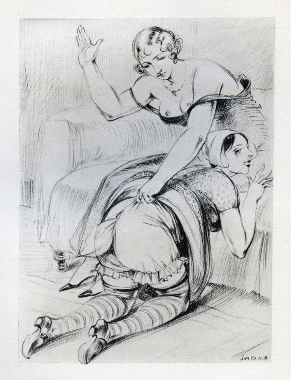 Luc Lafnet started producing book illustrations in the early 1920s, in a style clearly influenced by Heironymus Bosch and Martin van der Maele, often with grotesque and risqué comic elements. By 1927 he had been discovered by several well-known Parisian erotic publishers, including Georges Briffaut, Jean Fort and Maurice Duflou, but carefully distanced himself from immediate recognition by using a variety of pseudonyms, including ‘Jim Black’, ‘Viset’, ‘O. Lucas’, ‘Pol’, ‘Grim’, and ‘Luc’. His ability to produce quality work quickly was conducive to his success and popularity, and by the early 1930s he was producing engravings, paintings and comic strips in a flurry of creativity. As with his pioneering comic strip work, where he worked with Blanche Demoulin and Robert Velter to develop characters like the well-known Spirou, Lafnet’s erotic work was mostly known only to the select audience who recognised and valued his imaginative work. By the time he produced the illustrations to Lettres à la présidente, Zoloé et ses deux acolytes, and Les stations de l’amour, his unique erotic style was fully-formed. The fact that he was not averse to illustrating BDSM classics like Dresseuses d’hommes, Les geôles de dentelles and L’école des biches only added to his popularity in appreciative Parisian circles.