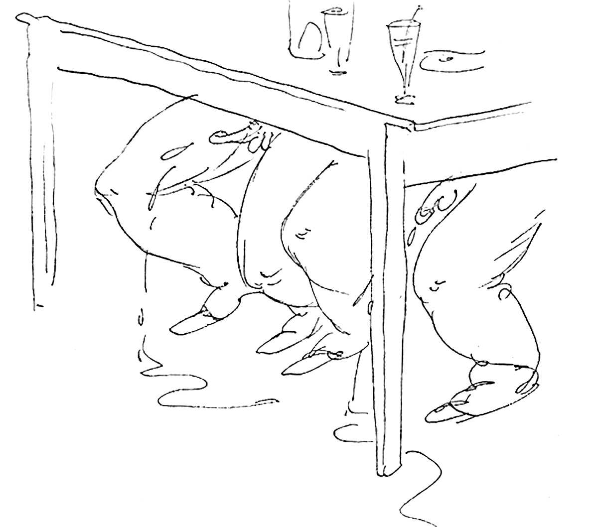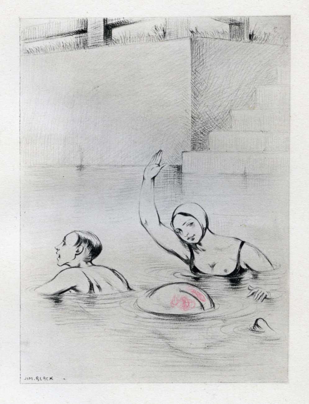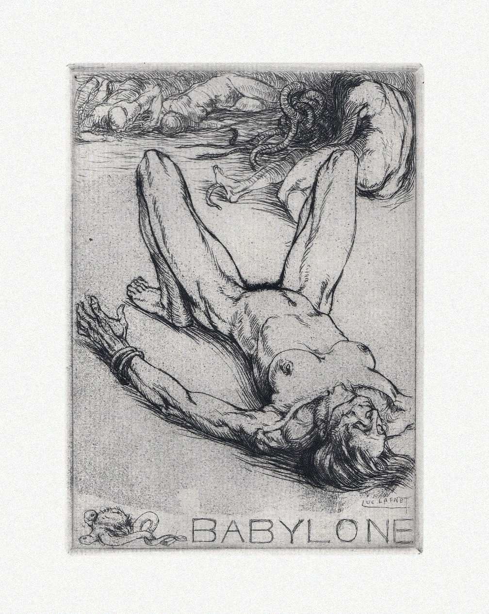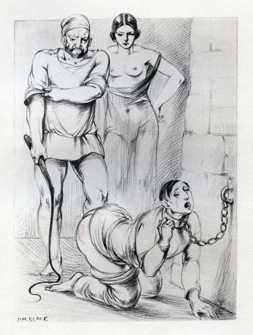 Luc Lafnet started producing book illustrations in the early 1920s, in a style clearly influenced by Heironymus Bosch and Martin van der Maele, often with grotesque and risqué comic elements. By 1927 he had been discovered by several well-known Parisian erotic publishers, including Georges Briffaut, Jean Fort and Maurice Duflou, but carefully distanced himself from immediate recognition by using a variety of pseudonyms, including ‘Jim Black’, ‘Viset’, ‘O. Lucas’, ‘Pol’, ‘Grim’, and ‘Luc’. His ability to produce quality work quickly was conducive to his success and popularity, and by the early 1930s he was producing engravings, paintings and comic strips in a flurry of creativity. As with his pioneering comic strip work, where he worked with Blanche Demoulin and Robert Velter to develop characters like the well-known Spirou, Lafnet’s erotic work was mostly known only to the select audience who recognised and valued his imaginative work. By the time he produced the illustrations to Lettres à la présidente, Zoloé et ses deux acolytes, and Les stations de l’amour, his unique erotic style was fully-formed. The fact that he was not averse to illustrating BDSM classics like Dresseuses d’hommes, Les geôles de dentelles and L’école des biches only added to his popularity in appreciative Parisian circles.
