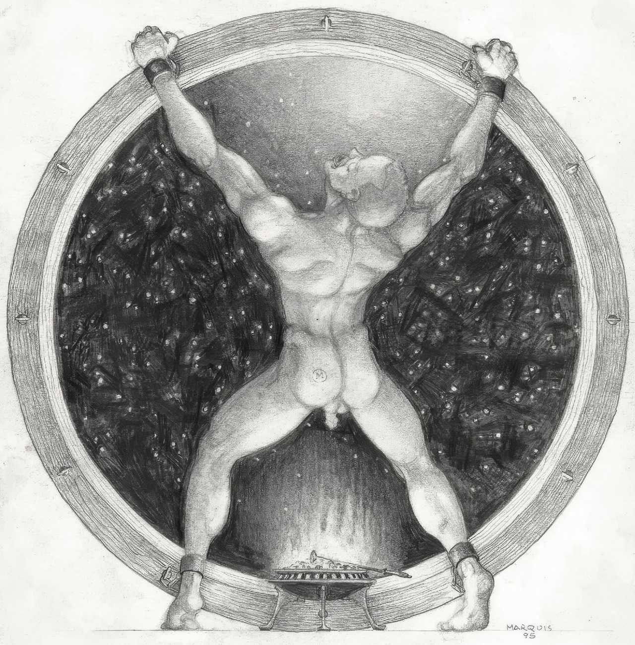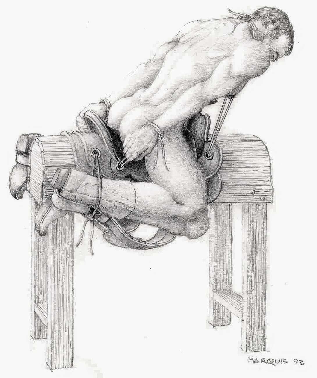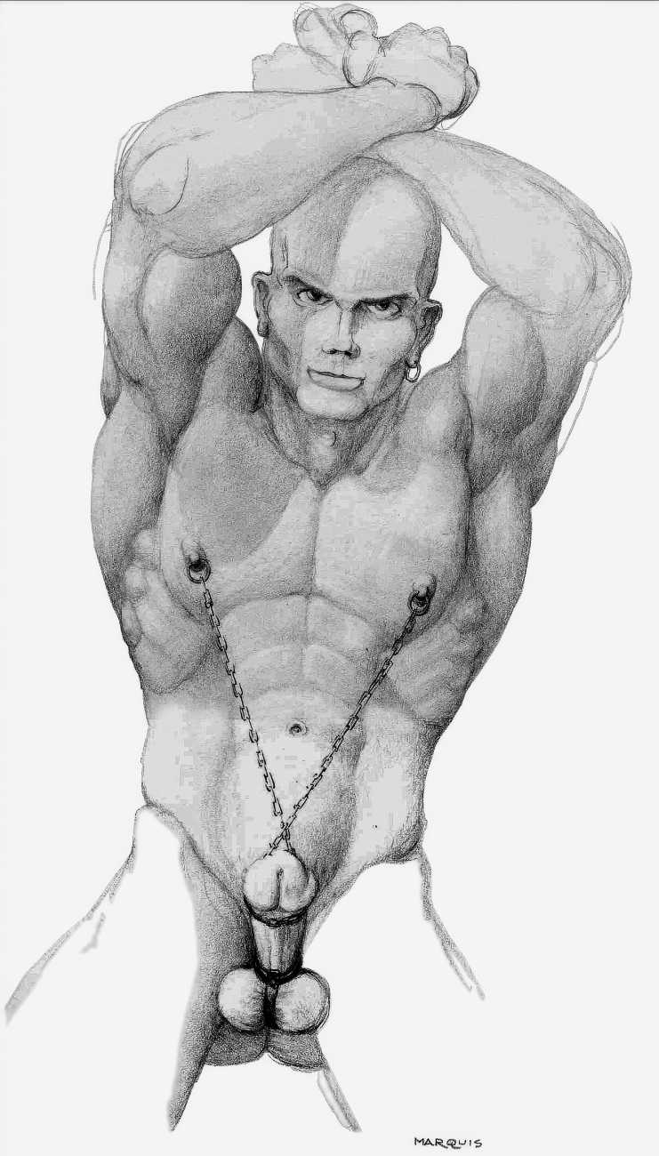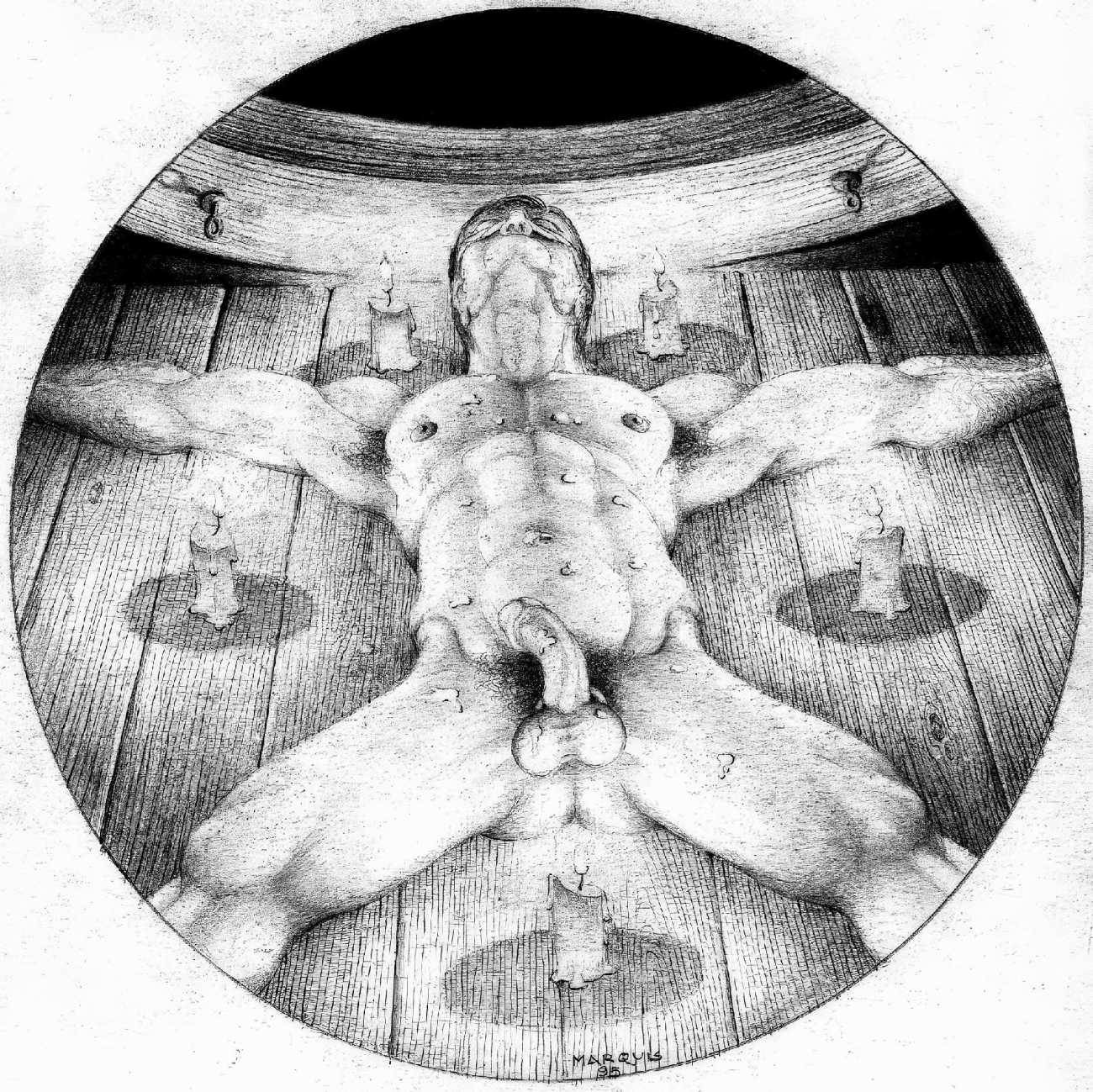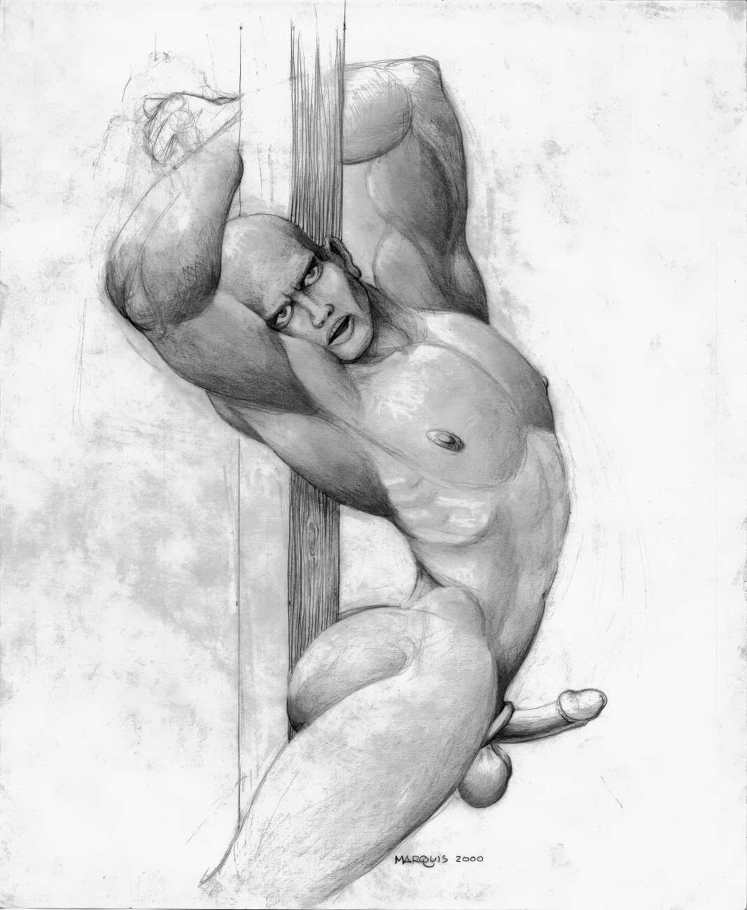 In November 2012 a Tumblr account was created by an artist who signed himself Marquis, and over the next five years around forty finely-detailed pencil drawings appeared there, mostly of naked men in a variety of BDSM settings. Those that are dated were created in the 1990s, with a high point in 1995.