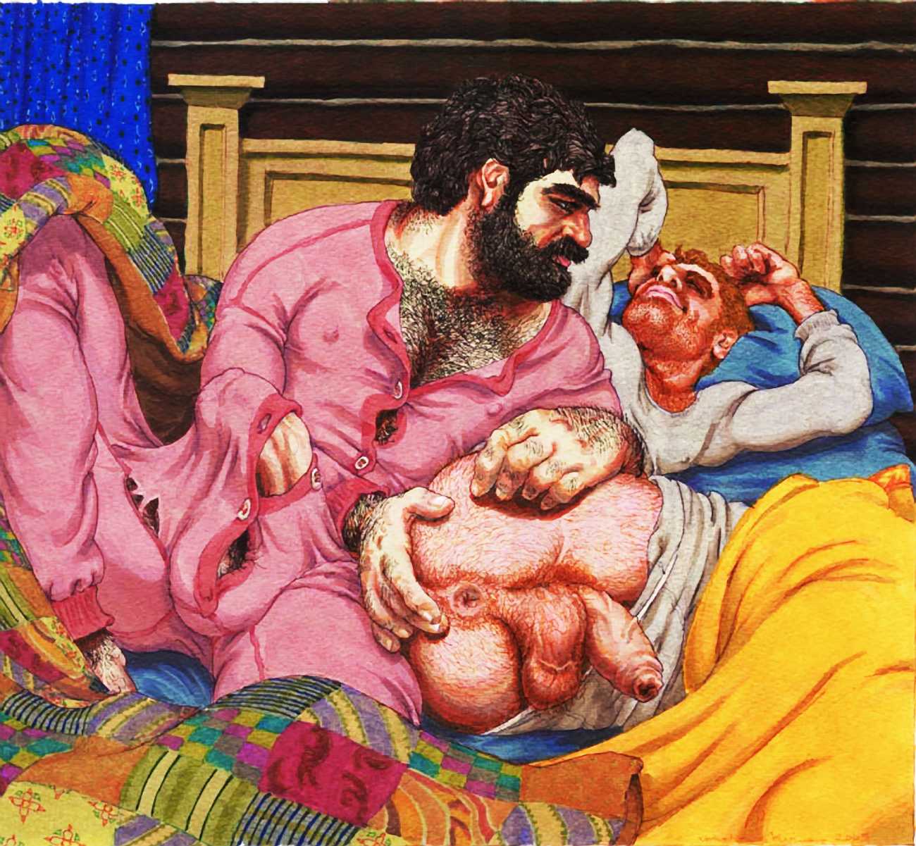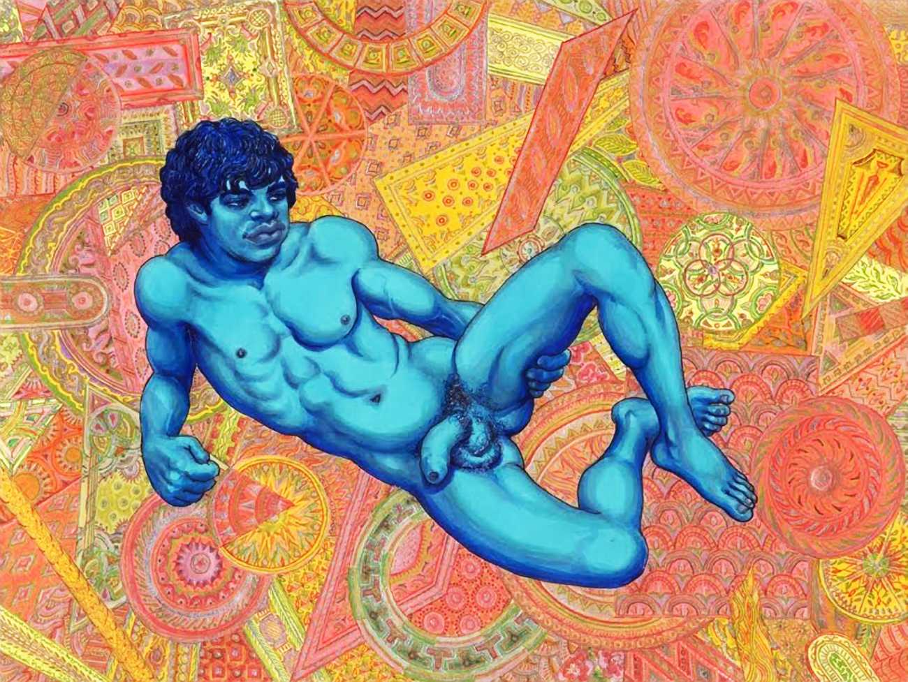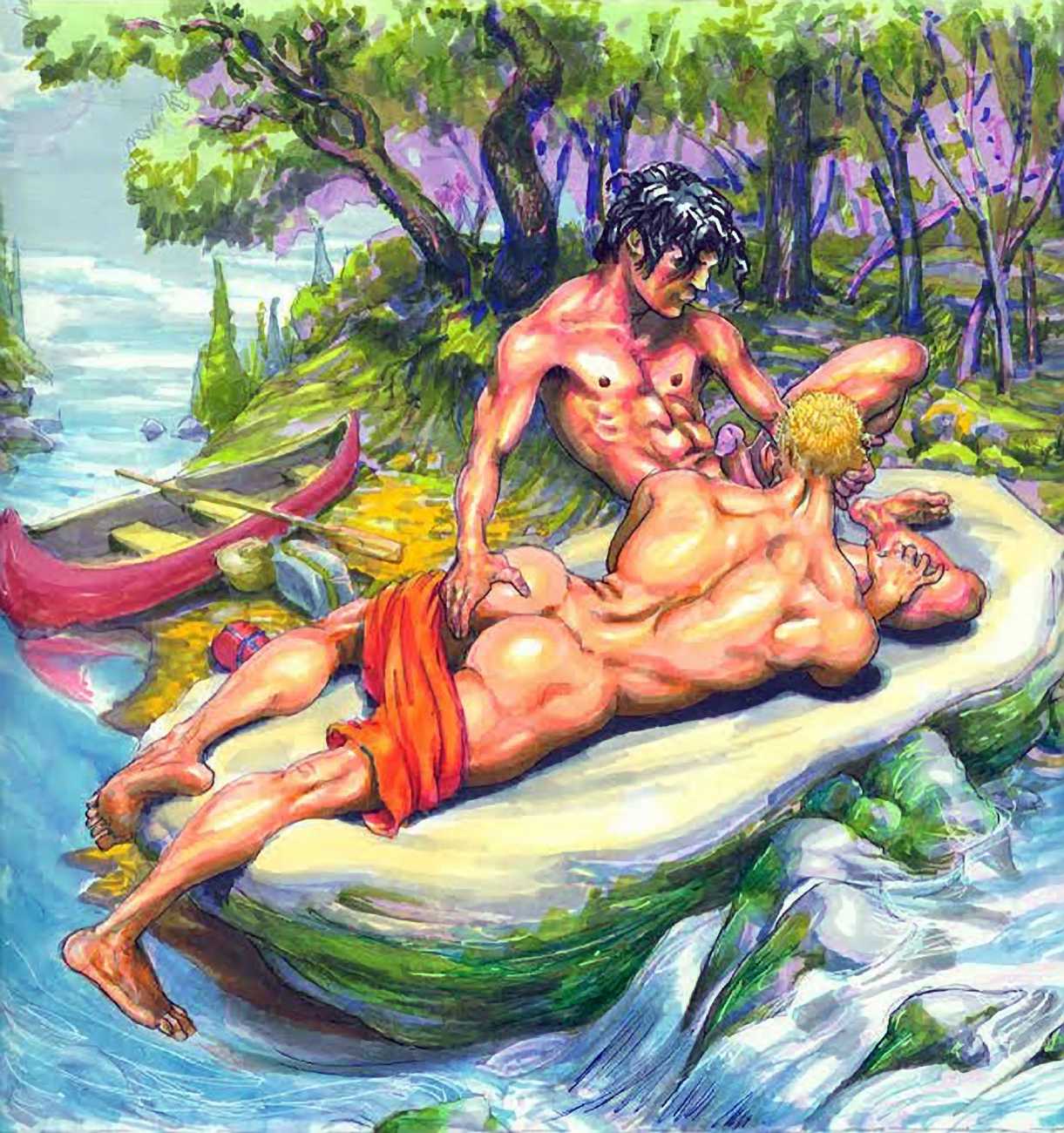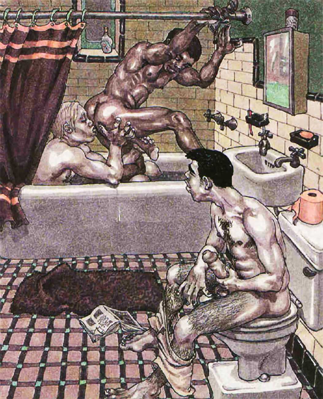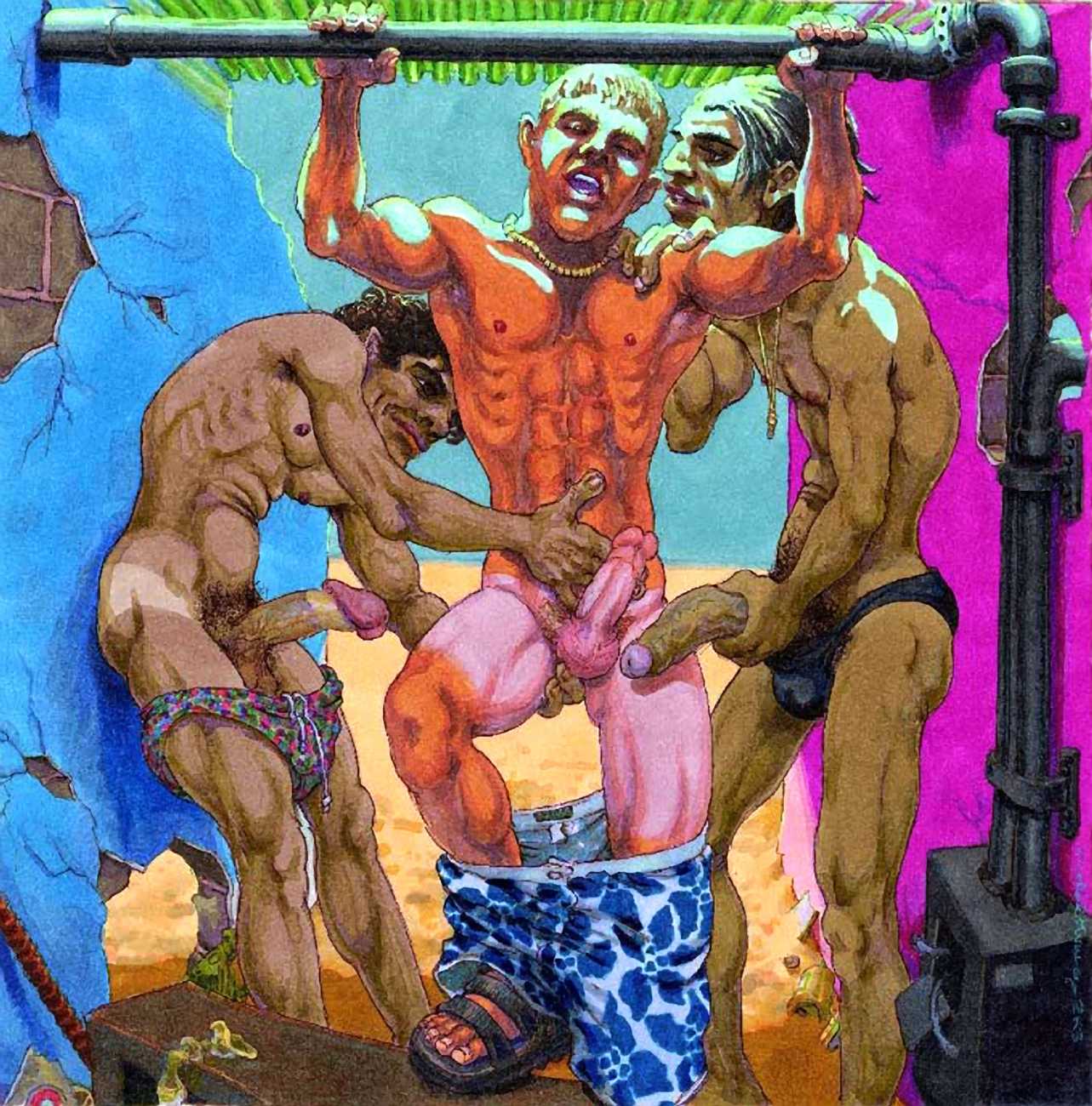 Michael Kirwan was one of the most productive, original and well-known artists of the American gay scene, his brightly-coloured and well-observed paintings capturing every aspect of the fantasy lives of men loving men. Though identifying as gay himself, he regularly drew scenes which included women, especially if they had plenty of flesh.