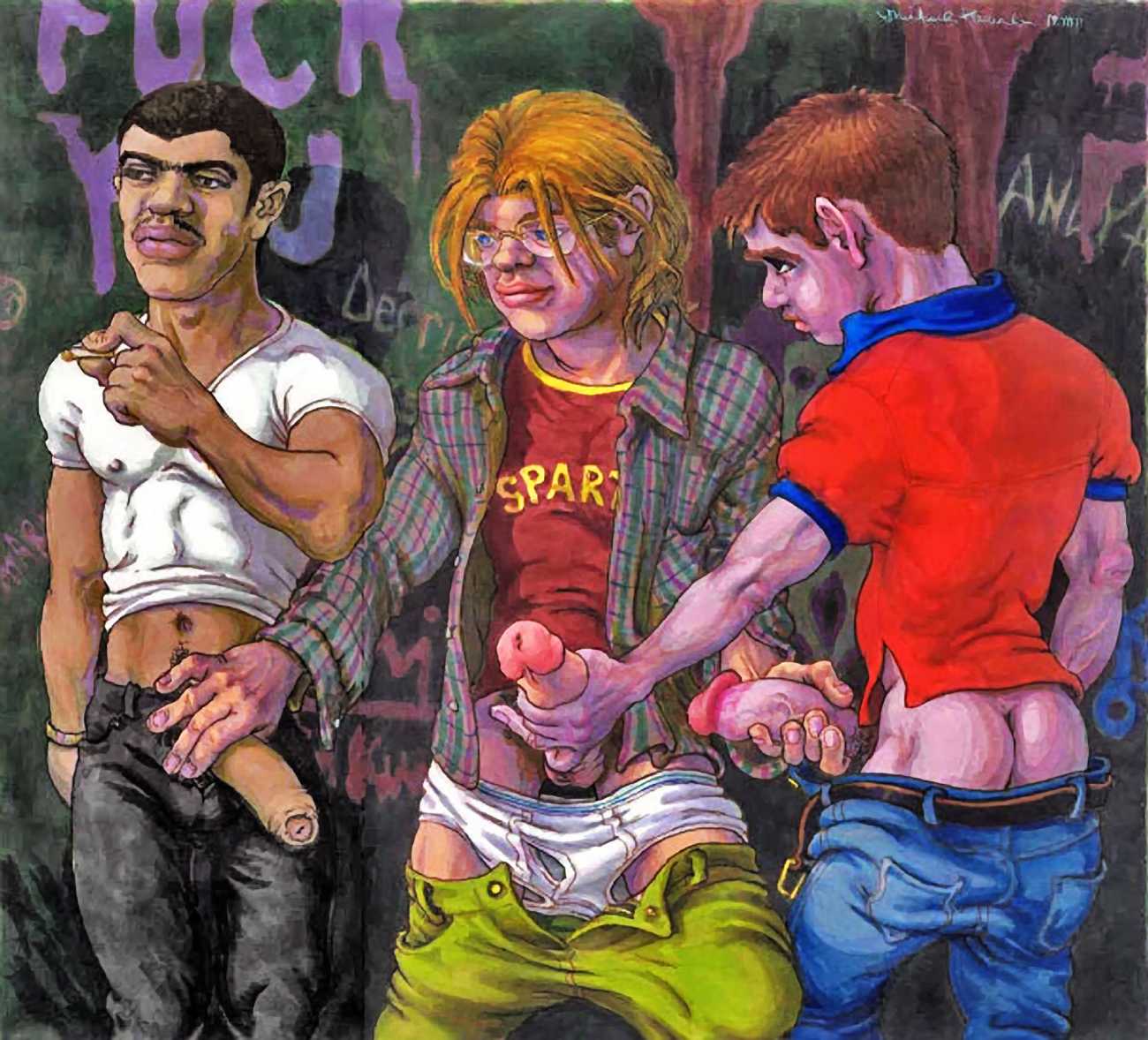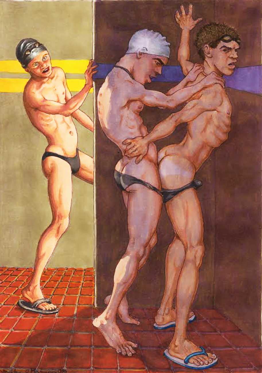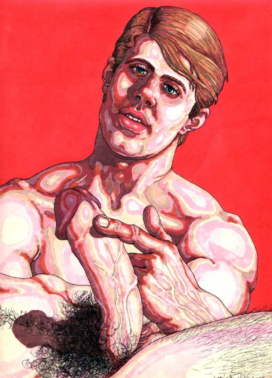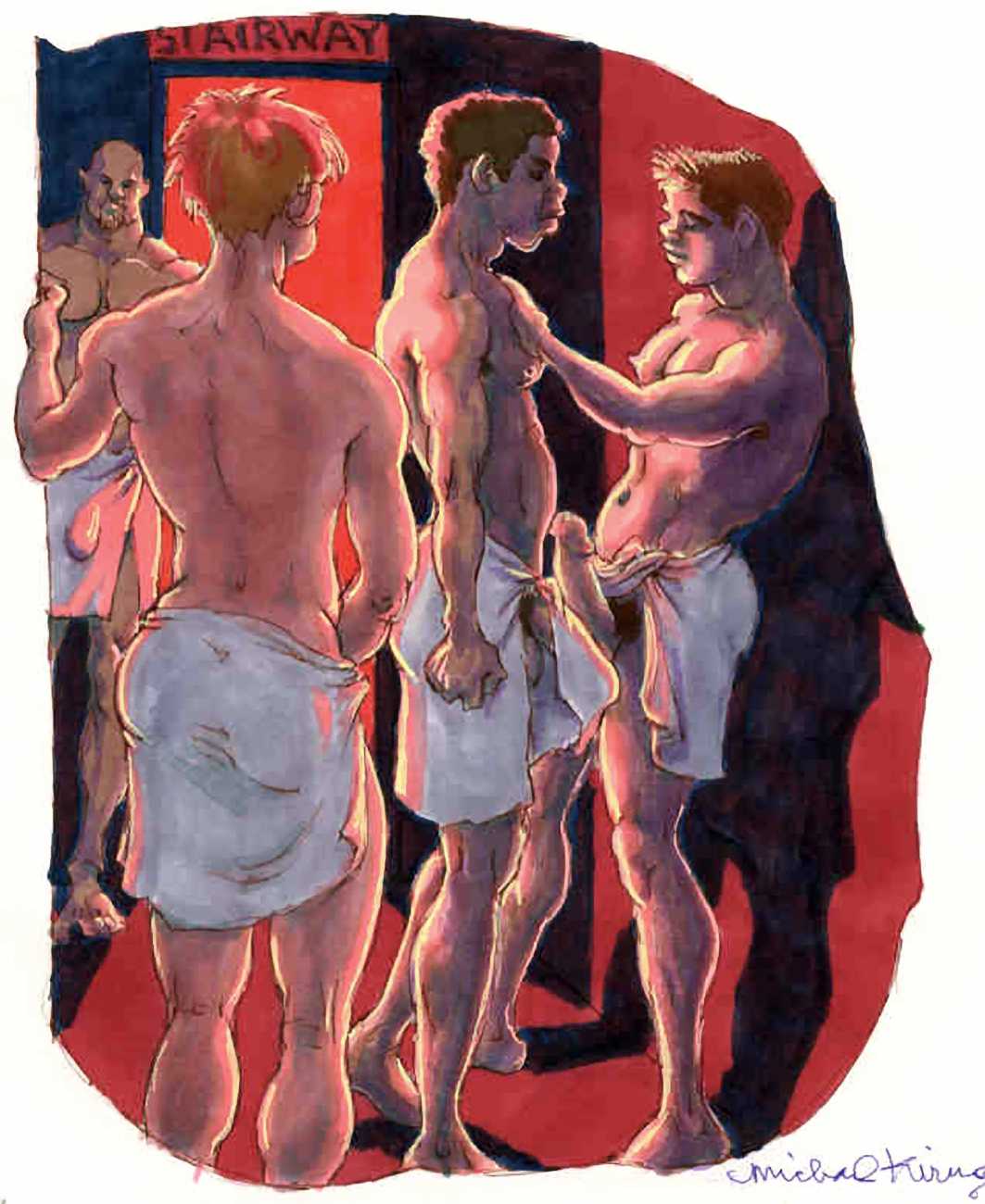 While still at Spellman, Michael married his high school sweetheart and six months later became a father. Later that year he was denied a diploma because he had hurled a jelly donut at the back of his religious instructor’s head (she was an ex-nun). With a family to support, Michael worked for six years in the shipping and receiving area at Gimbels department store. At the end of the 1970s his marriage dissolved under the combined weight of his irresponsible attitude and continuing homosexual shenanigans, and in 1980, embracing his newly found gay identity, he went to work at the St Mark’s Baths, a sperm-splashed institution in the East Village. Michael rose quickly through the ranks from laundry boy to management through being an inept but endearing presence. Encouraged by Bruce Mailman, owner of both the baths and the magnificent and historic Saint dance club, Michael rediscovered art and in particular his skill at drawing the naked men surrounding him at work. In 1986 Michael realised that the AIDS epidemic would soon end the heyday of the tubs. It was during this time that his works were first published in Stroke magazine. He next worked for two years at the GVC porn video distributorship, until the company profits vanished up the executive’s nostrils.
