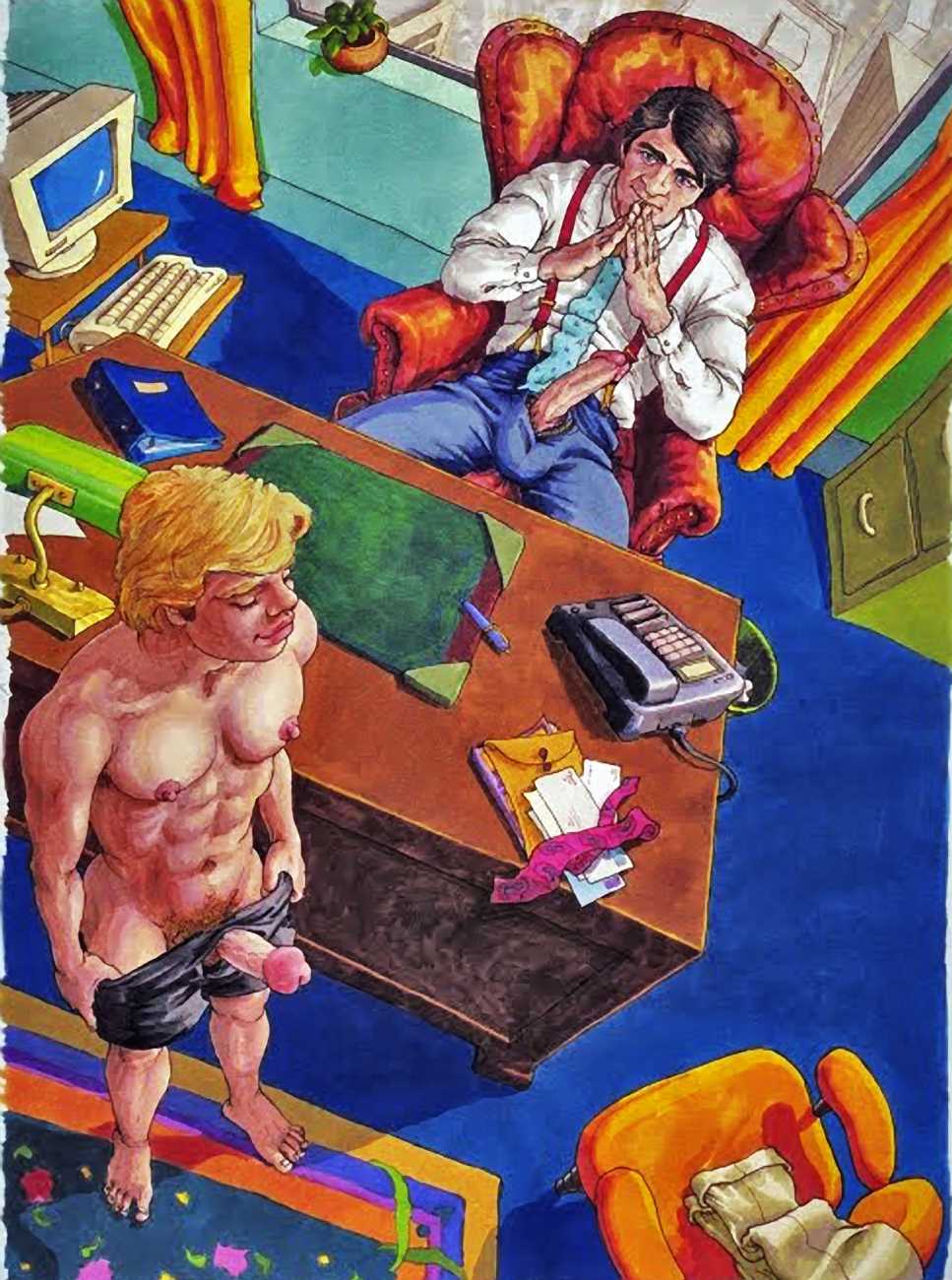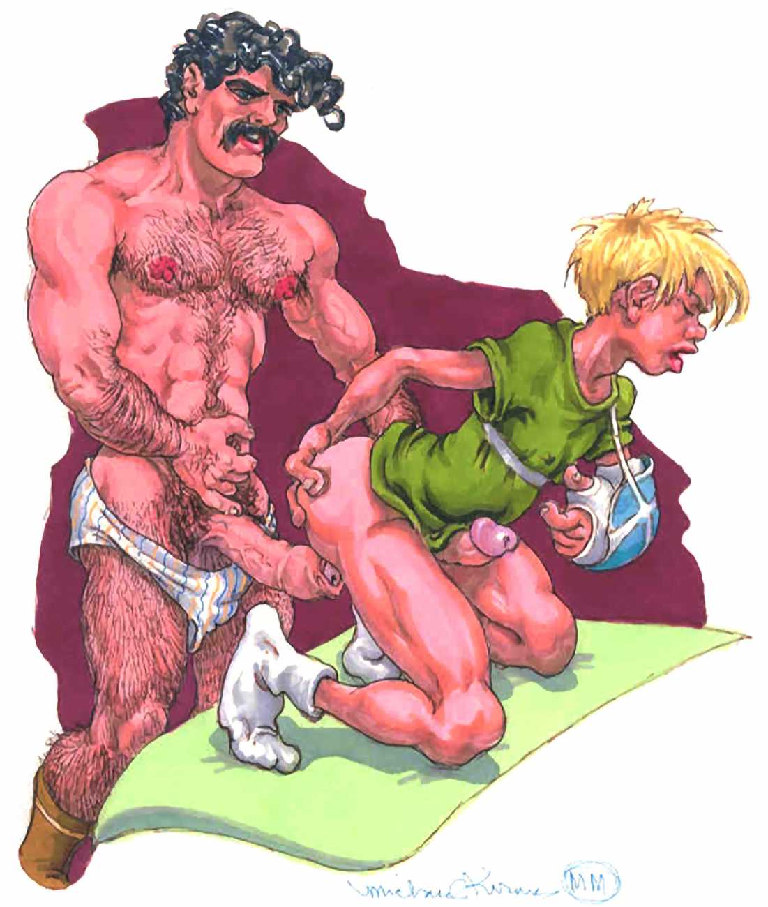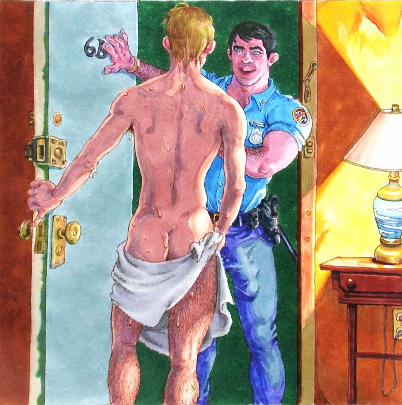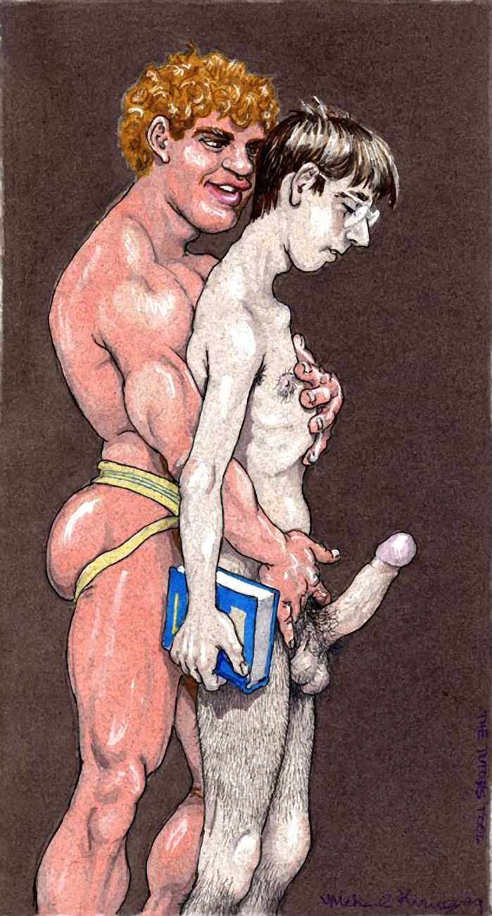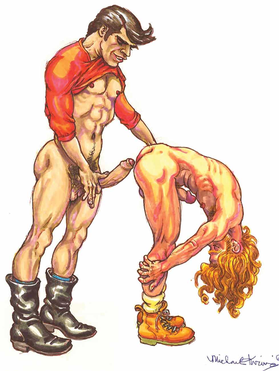 While still at Spellman, Michael married his high school sweetheart and six months later became a father. Later that year he was denied a diploma because he had hurled a jelly donut at the back of his religious instructor’s head (she was an ex-nun). With a family to support, Michael worked for six years in the shipping and receiving area at Gimbels department store. At the end of the 1970s his marriage dissolved under the combined weight of his irresponsible attitude and continuing homosexual shenanigans, and in 1980, embracing his newly found gay identity, he went to work at the St Mark’s Baths, a sperm-splashed institution in the East Village. Michael rose quickly through the ranks from laundry boy to management through being an inept but endearing presence. Encouraged by Bruce Mailman, owner of both the baths and the magnificent and historic Saint dance club, Michael rediscovered art and in particular his skill at drawing the naked men surrounding him at work. In 1986 Michael realised that the AIDS epidemic would soon end the heyday of the tubs. It was during this time that his works were first published in Stroke magazine. He next worked for two years at the GVC porn video distributorship, until the company profits vanished up the executive’s nostrils.