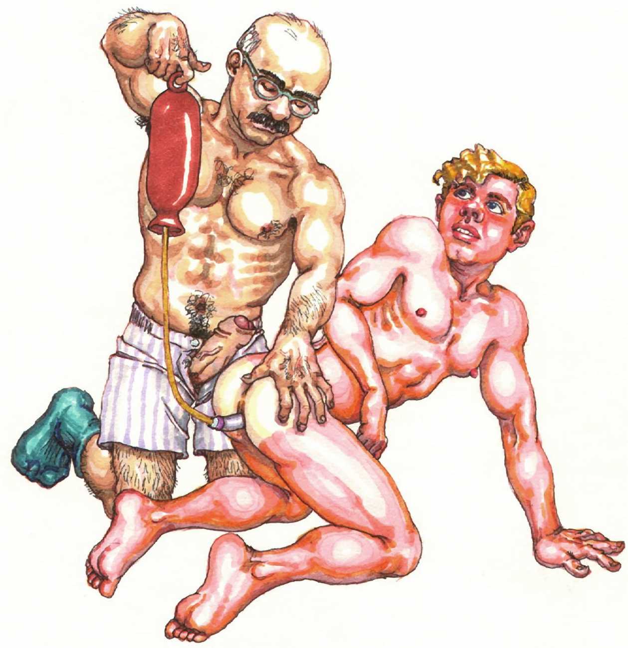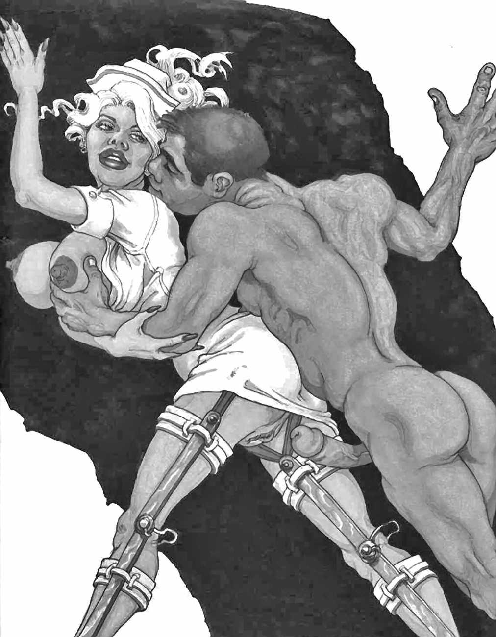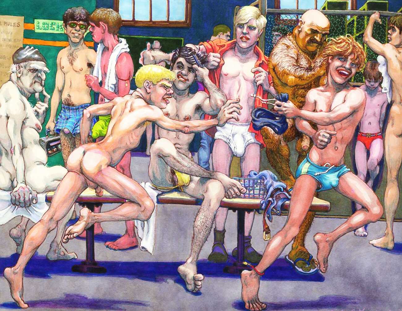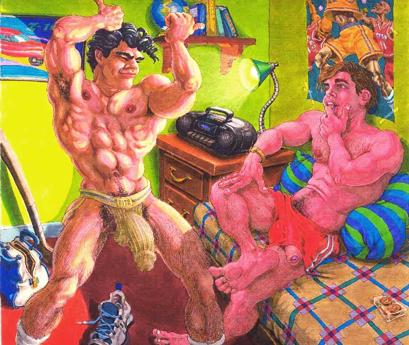While still at Spellman, Michael married his high school sweetheart and six months later became a father. Later that year he was denied a diploma because he had hurled a jelly donut at the back of his religious instructor’s head (she was an ex-nun). With a family to support, Michael worked for six years in the shipping and receiving area at Gimbels department store. At the end of the 1970s his marriage dissolved under the combined weight of his irresponsible attitude and continuing homosexual shenanigans, and in 1980, embracing his newly found gay identity, he went to work at the St Mark’s Baths, a sperm-splashed institution in the East Village. Michael rose quickly through the ranks from laundry boy to management through being an inept but endearing presence. Encouraged by Bruce Mailman, owner of both the baths and the magnificent and historic Saint dance club, Michael rediscovered art and in particular his skill at drawing the naked men surrounding him at work. In 1986 Michael realised that the AIDS epidemic would soon end the heyday of the tubs. It was during this time that his works were first published in Stroke magazine. He next worked for two years at the GVC porn video distributorship, until the company profits vanished up the executive’s nostrils.
