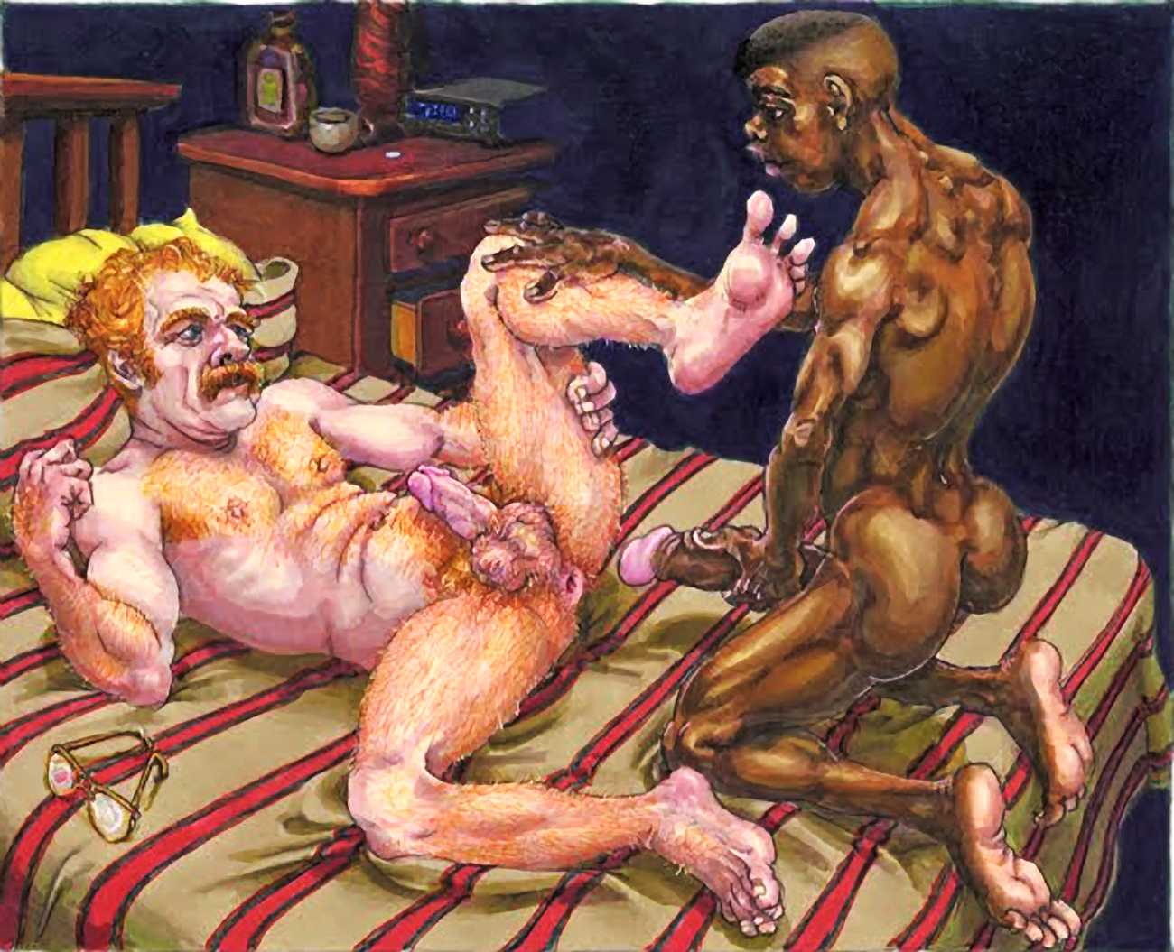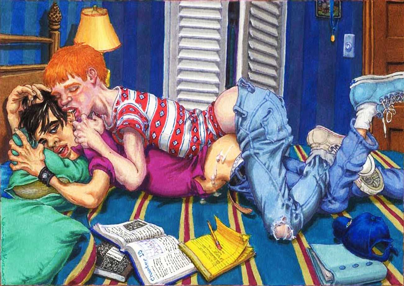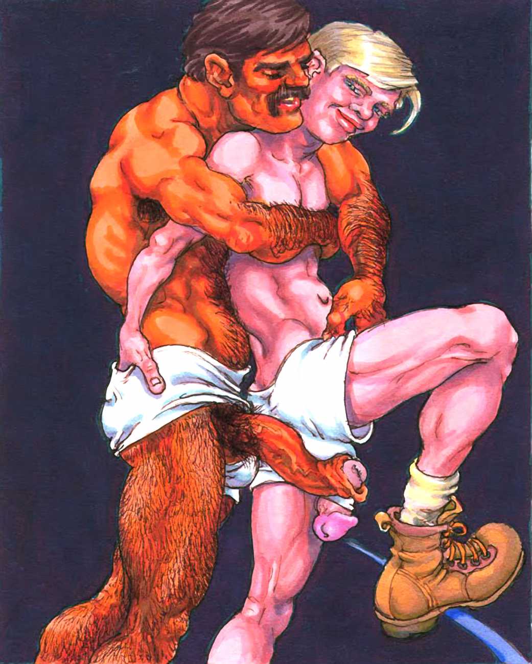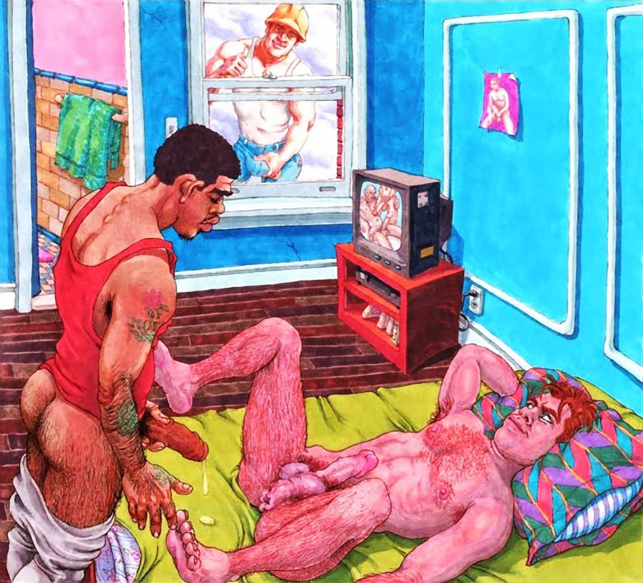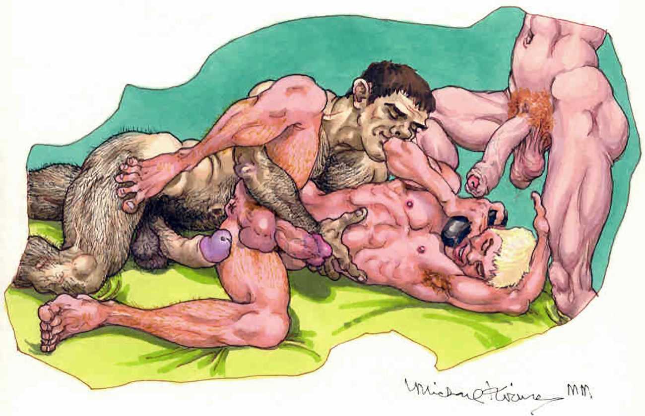 After moving to California in 2000, he spent a year as the Artist in Residence with the Tom of Finland Foundation. Michael enjoyed an inspirational relationship with the work and history of Tom, and maintained a supportive relationship with the Foundation, which is dedicated to the education and preservation of erotic art for all artists. These years would provide Michael with the most important friendships and partnerships, and saw him creating some of the best work of his life. He was now free to draw for his pleasure, to pay the rent, and for fans commissioning erotic scenes via his website. Michael always felt he was visually documenting every variety and scenario in gay and straight sexual activities. His inspirations for drawing his characters came from the everyday, regular people he encountered on the street, on the bus, in parks and markets, in seedy bars, and in dark alleys where names were not exchanged but furtive fun was found. Michael’s drawings exposed the fevered excitement and erotic beauty in every body and face; he always said he did not draw ‘pretty’ guys because he knew regular guys had better sex.