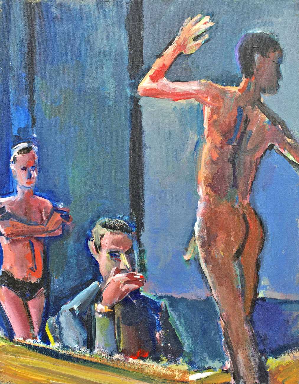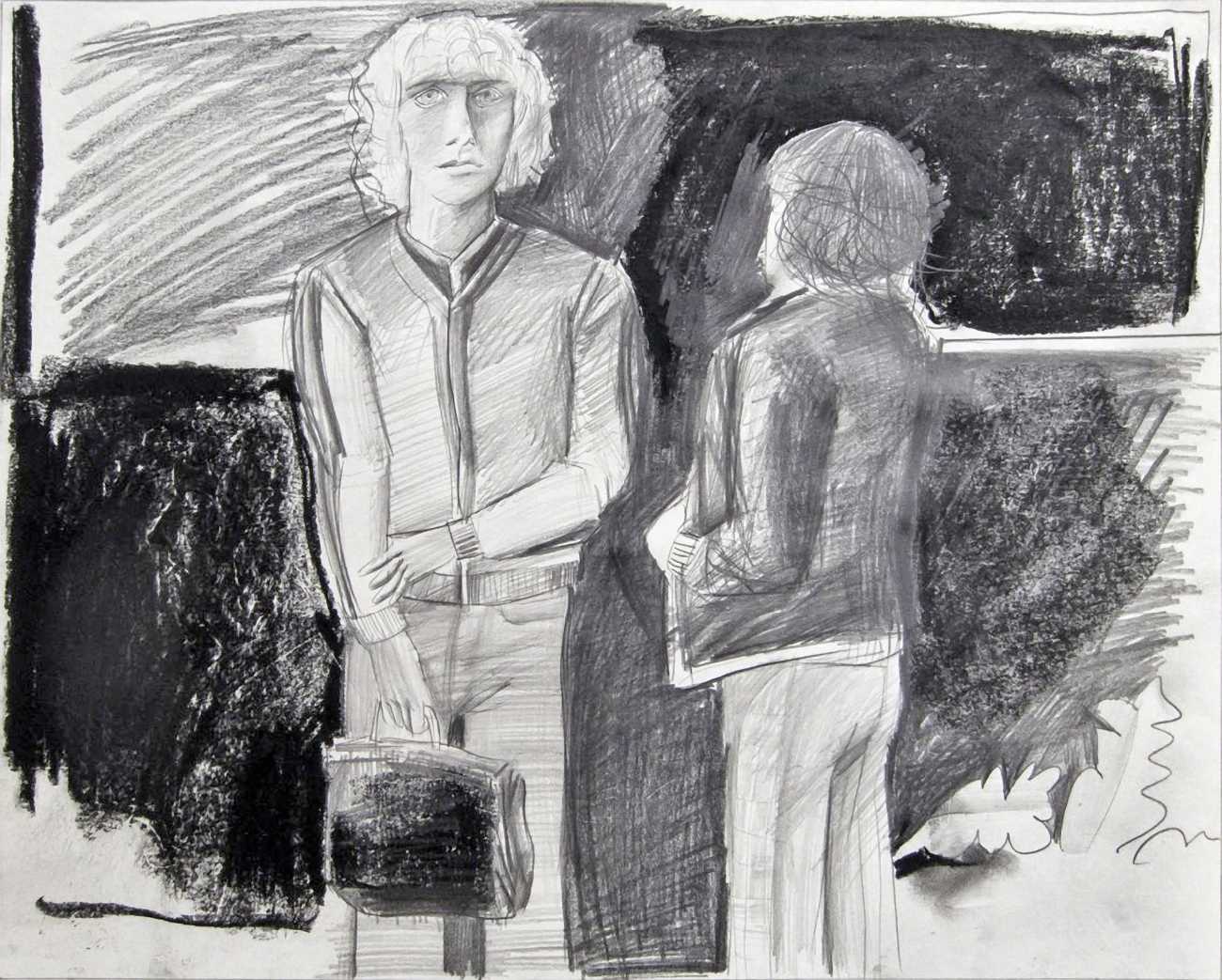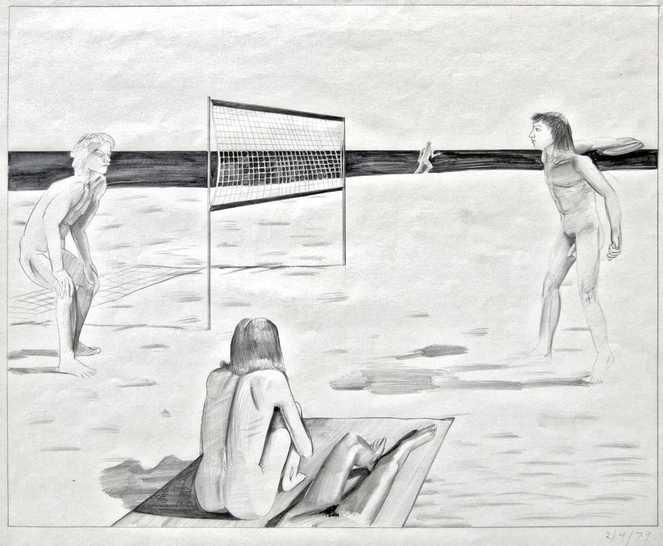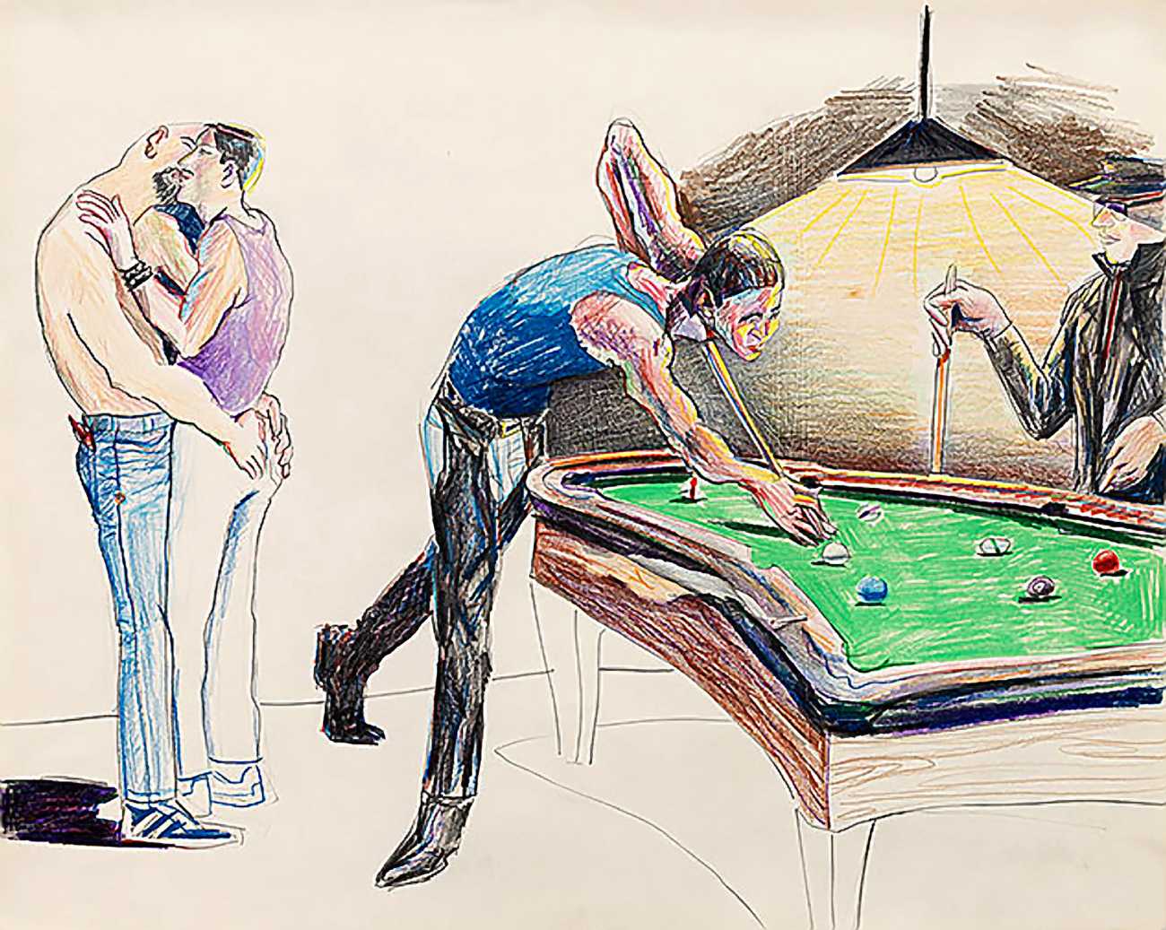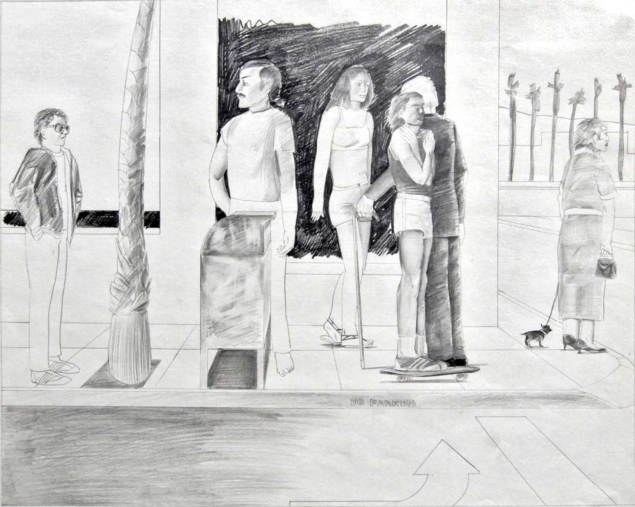 In 1974 a scholarship to the Santa Barbara Art Institute led him to discover the work of David Hockney, but when Angus moved to Hollywood in 1975 he discovered that the good gay life does not exist for poor people, ‘unless, of course they are beautiful’. Believing that he was sexually unattractive, he was hopelessly lonely. He made portraits of friends and acquaintances, and recorded with Hockney-like wit the Los Angeles scene around him, though mostly evading overtly gay subject matter.