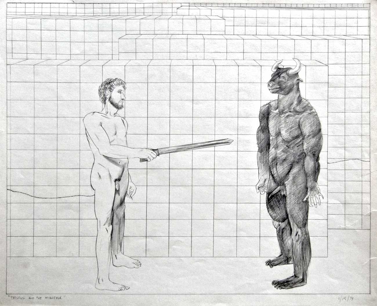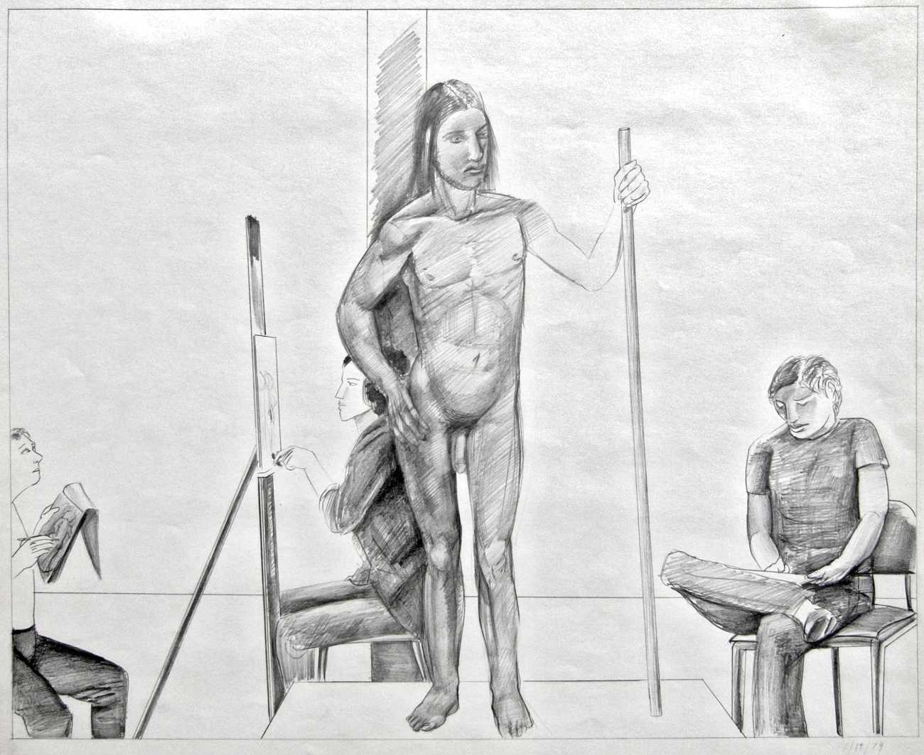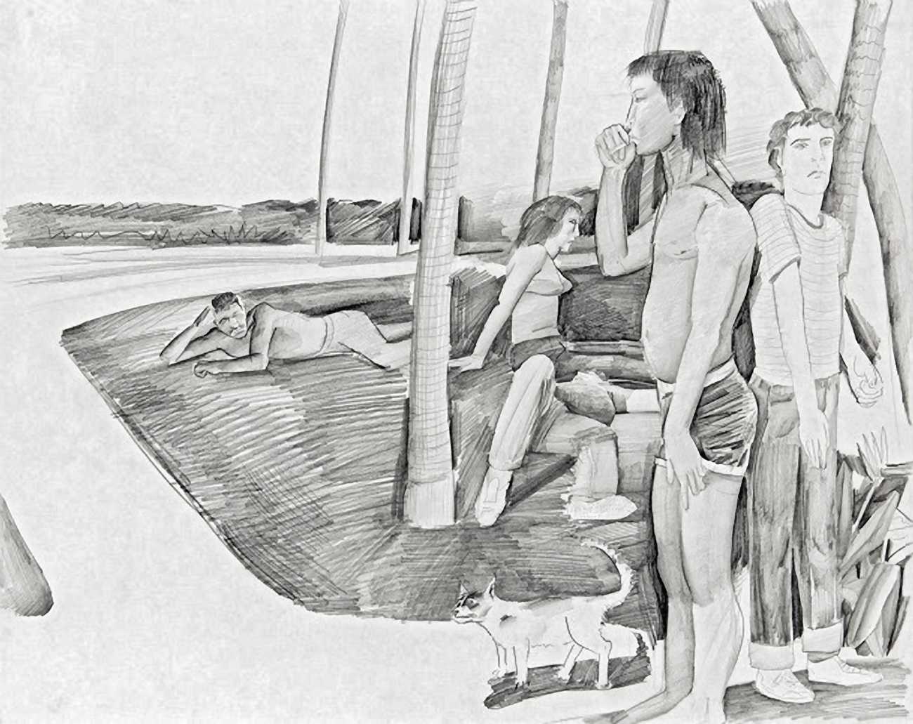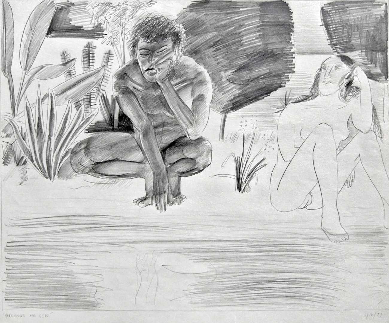 In 1974 a scholarship to the Santa Barbara Art Institute led him to discover the work of David Hockney, but when Angus moved to Hollywood in 1975 he discovered that the good gay life does not exist for poor people, ‘unless, of course they are beautiful’. Believing that he was sexually unattractive, he was hopelessly lonely. He made portraits of friends and acquaintances, and recorded with Hockney-like wit the Los Angeles scene around him, though mostly evading overtly gay subject matter.