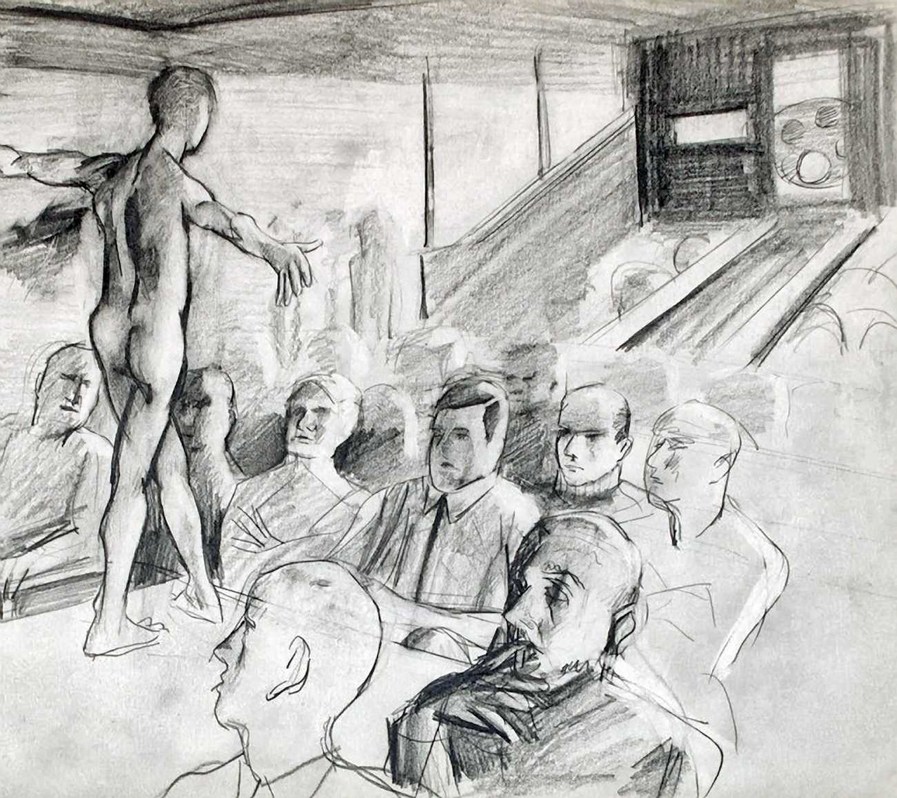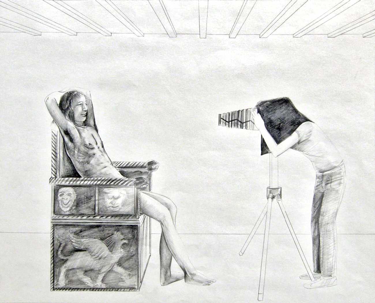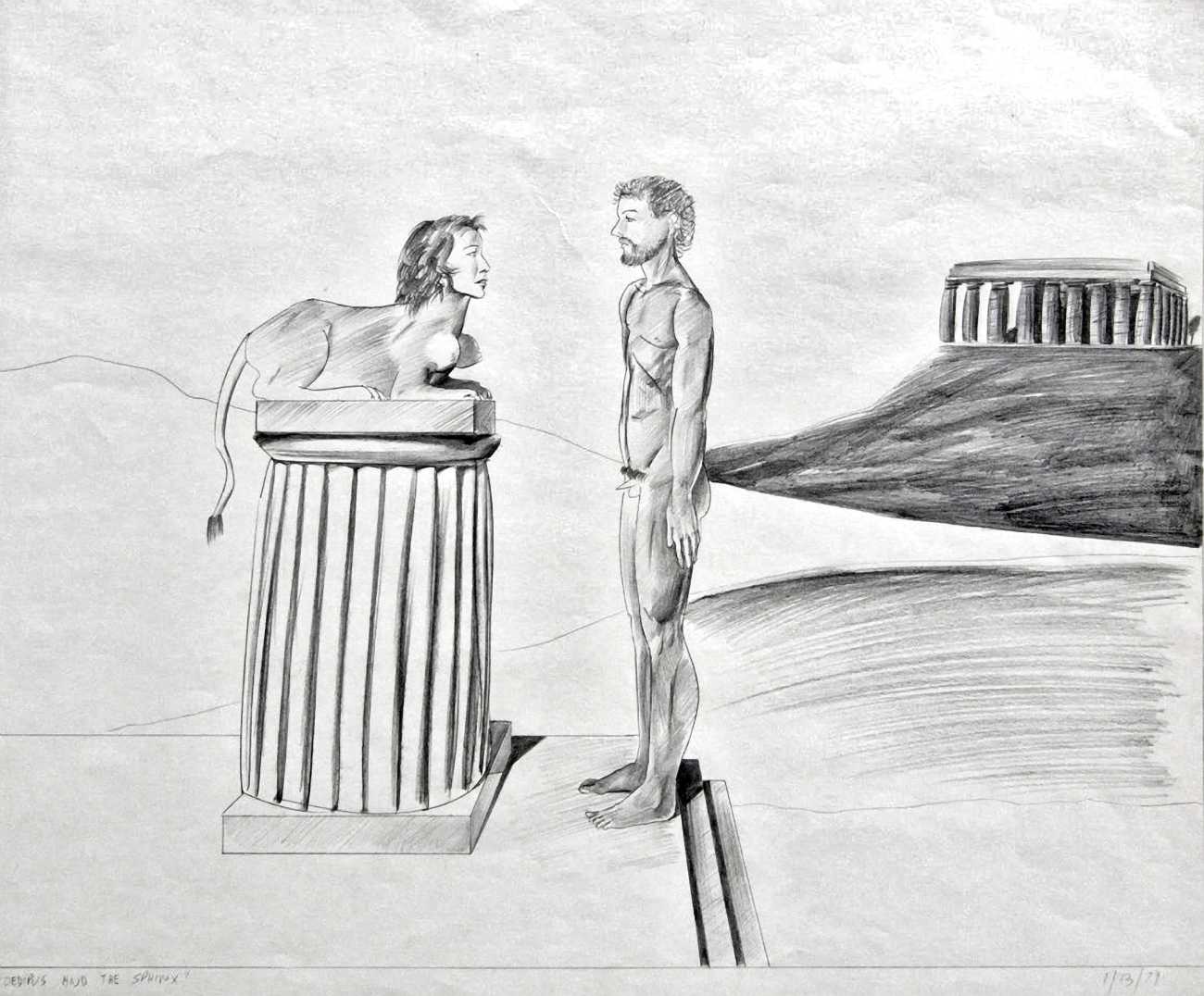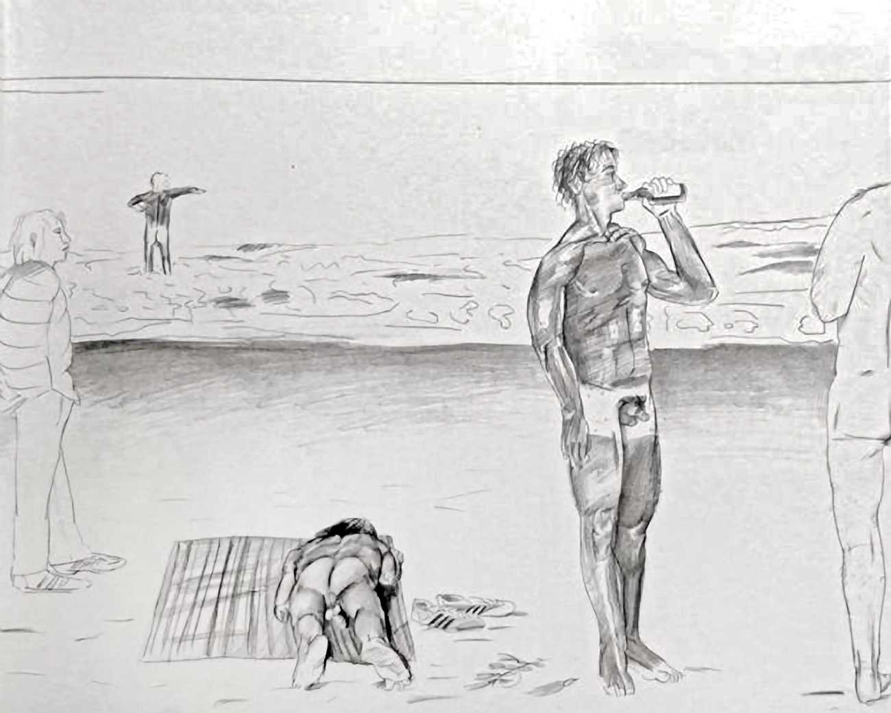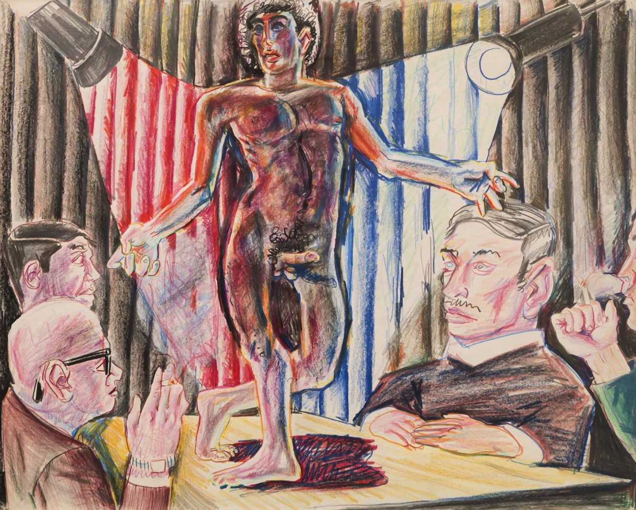 In 1974 a scholarship to the Santa Barbara Art Institute led him to discover the work of David Hockney, but when Angus moved to Hollywood in 1975 he discovered that the good gay life does not exist for poor people, ‘unless, of course they are beautiful’. Believing that he was sexually unattractive, he was hopelessly lonely. He made portraits of friends and acquaintances, and recorded with Hockney-like wit the Los Angeles scene around him, though mostly evading overtly gay subject matter.