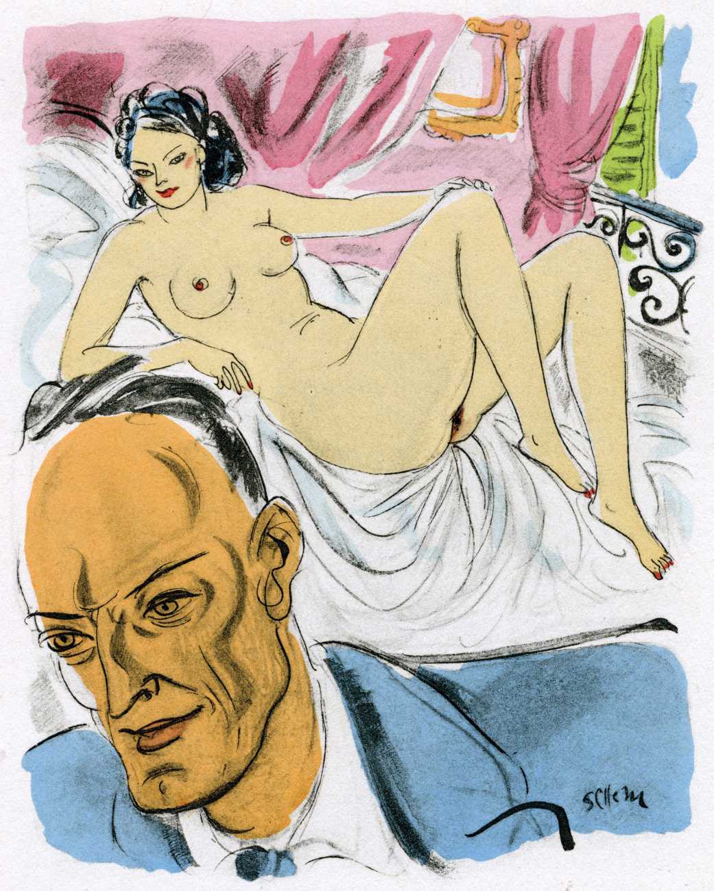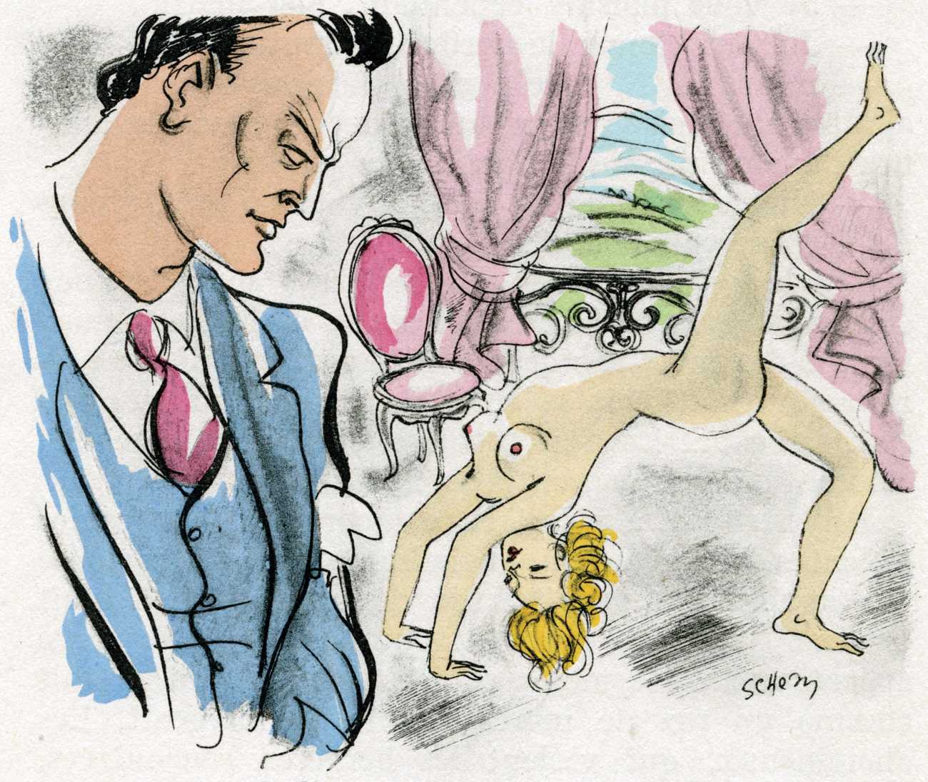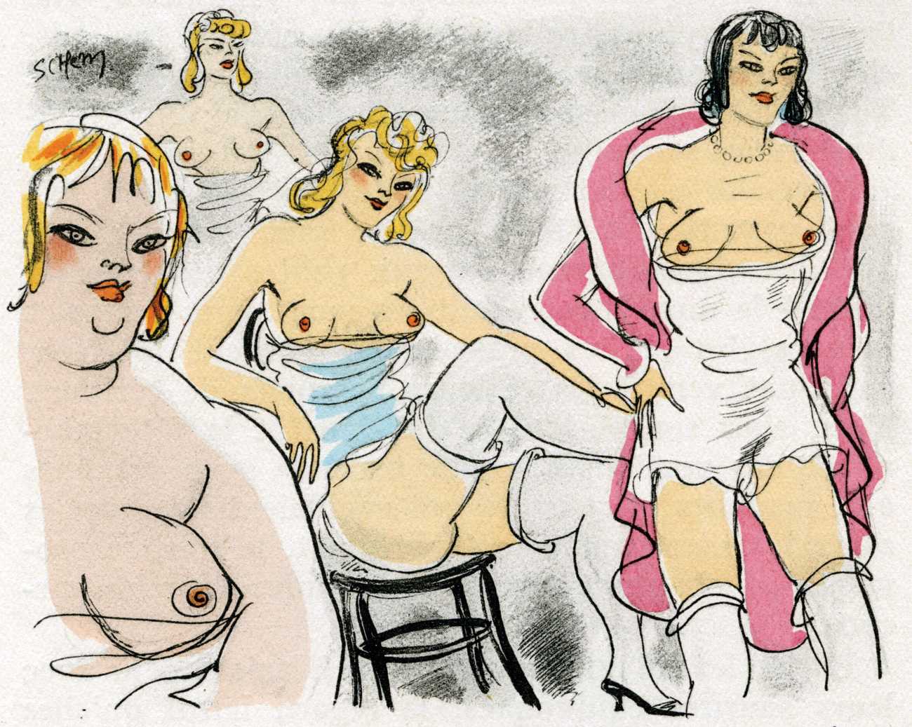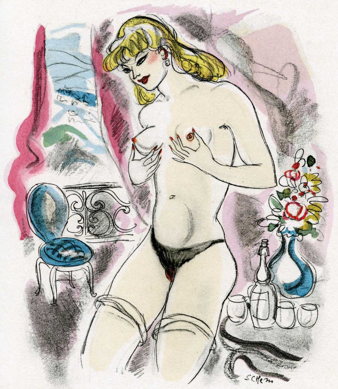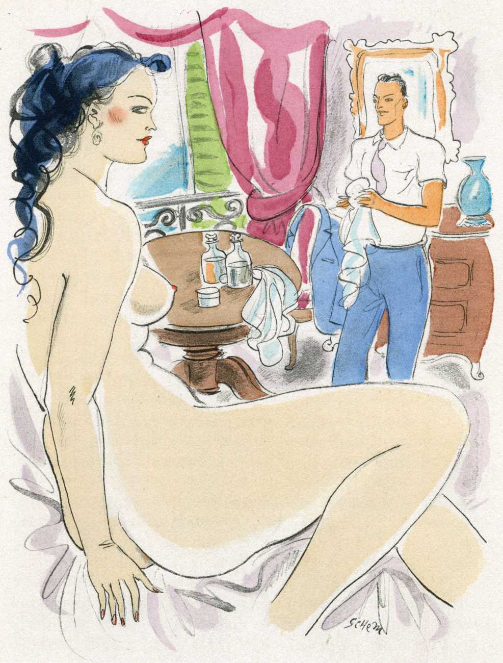 Among the mildly erotic titles illustrated by Schem are D.H. Lawrence’s Lady Chatterley (the French title for Lady Chatterley’s Lover), Le grant testament de Françoys Villon, Theophile Gautier’s Fortunio, and Paul Verlaine’s poetry. Apart from an edition of Pierre Louÿs’ Manuel de civilité, which may or may not be his work, we have only included here his illustrations for the 1936 L’histoire de Jérôme, the 1946 Le désir, the 1948 Petites cousines, Louÿs’ Roi Pausole, and Brantôme’s Les dames galantes, as his illustrations, while accomplished, tend to be very similar in style and rather characterless.