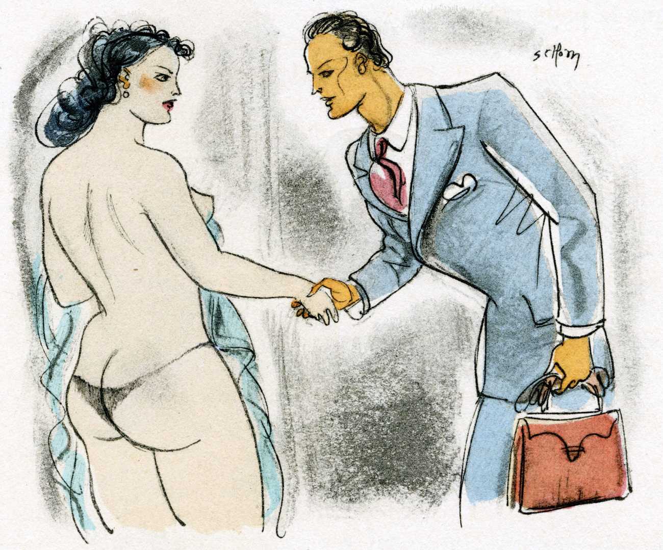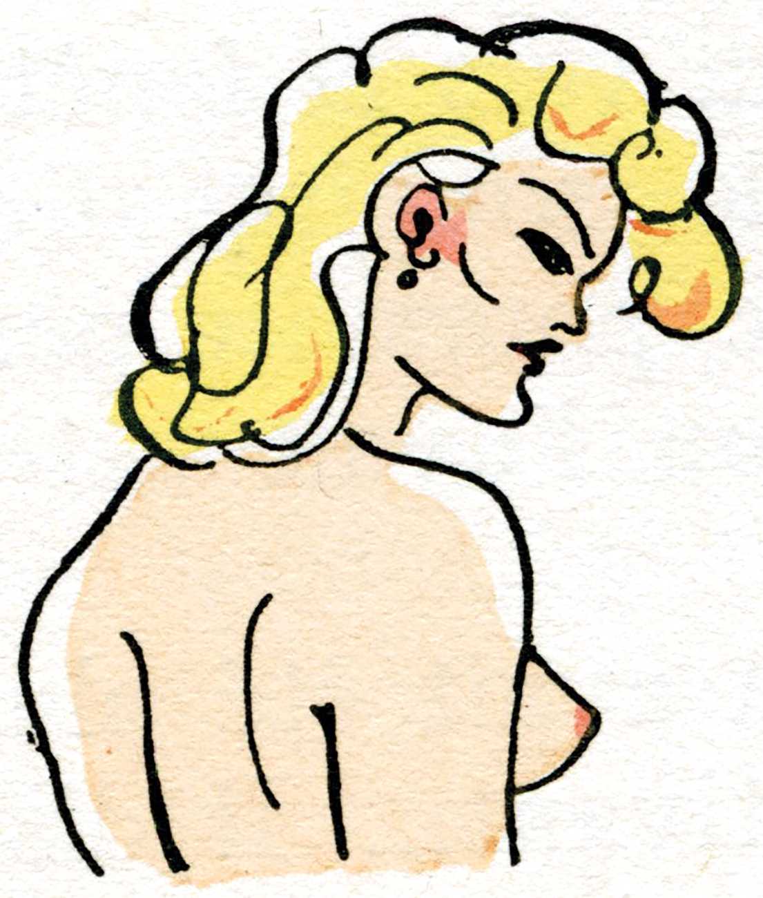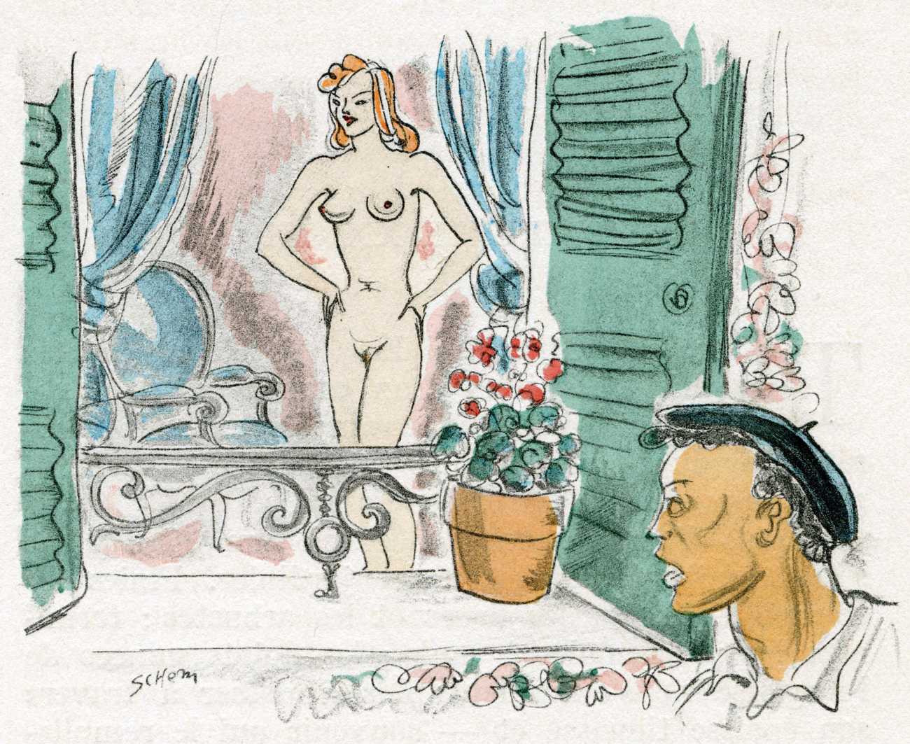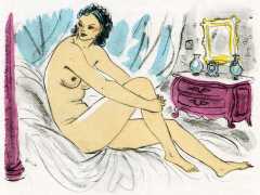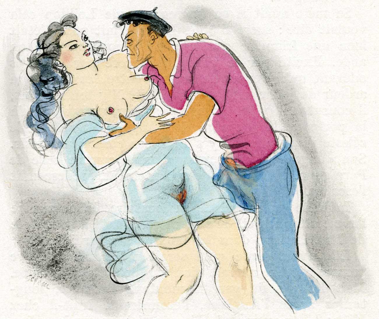 Among the mildly erotic titles illustrated by Schem are D.H. Lawrence’s Lady Chatterley (the French title for Lady Chatterley’s Lover), Le grant testament de Françoys Villon, Theophile Gautier’s Fortunio, and Paul Verlaine’s poetry. Apart from an edition of Pierre Louÿs’ Manuel de civilité, which may or may not be his work, we have only included here his illustrations for the 1936 L’histoire de Jérôme, the 1946 Le désir, the 1948 Petites cousines, Louÿs’ Roi Pausole, and Brantôme’s Les dames galantes, as his illustrations, while accomplished, tend to be very similar in style and rather characterless.