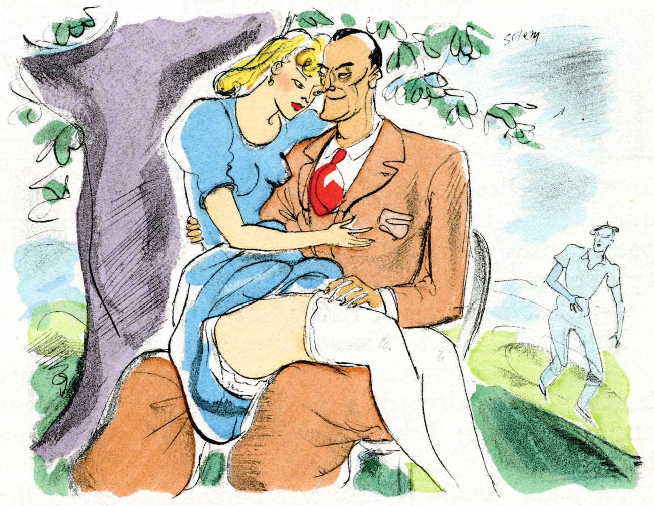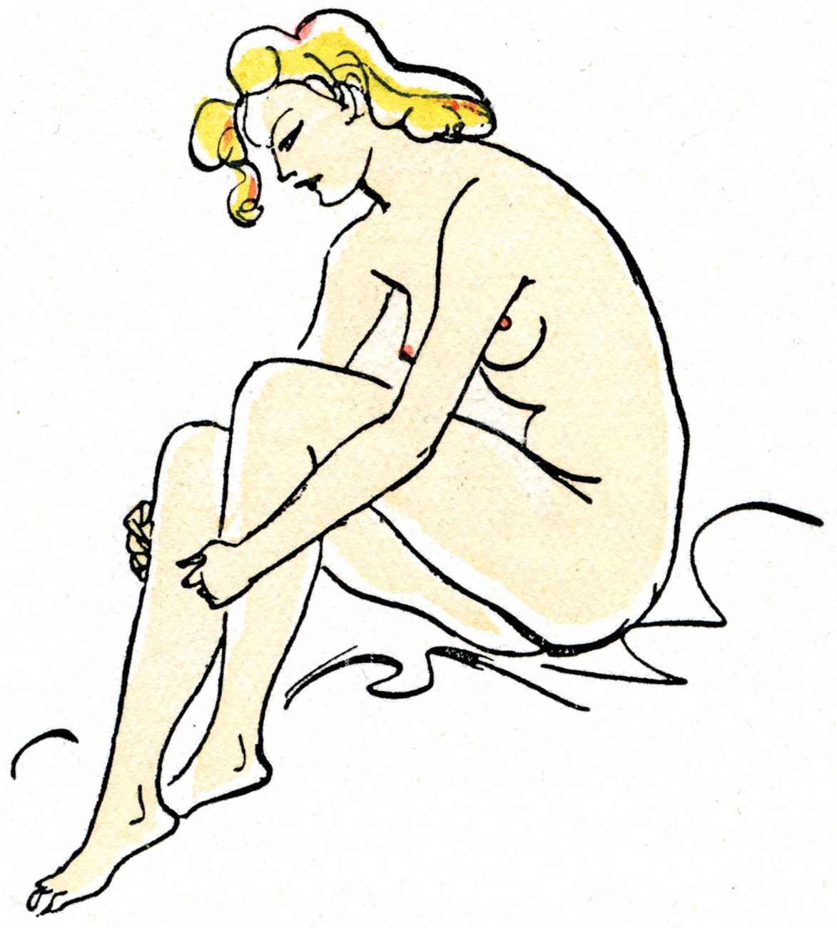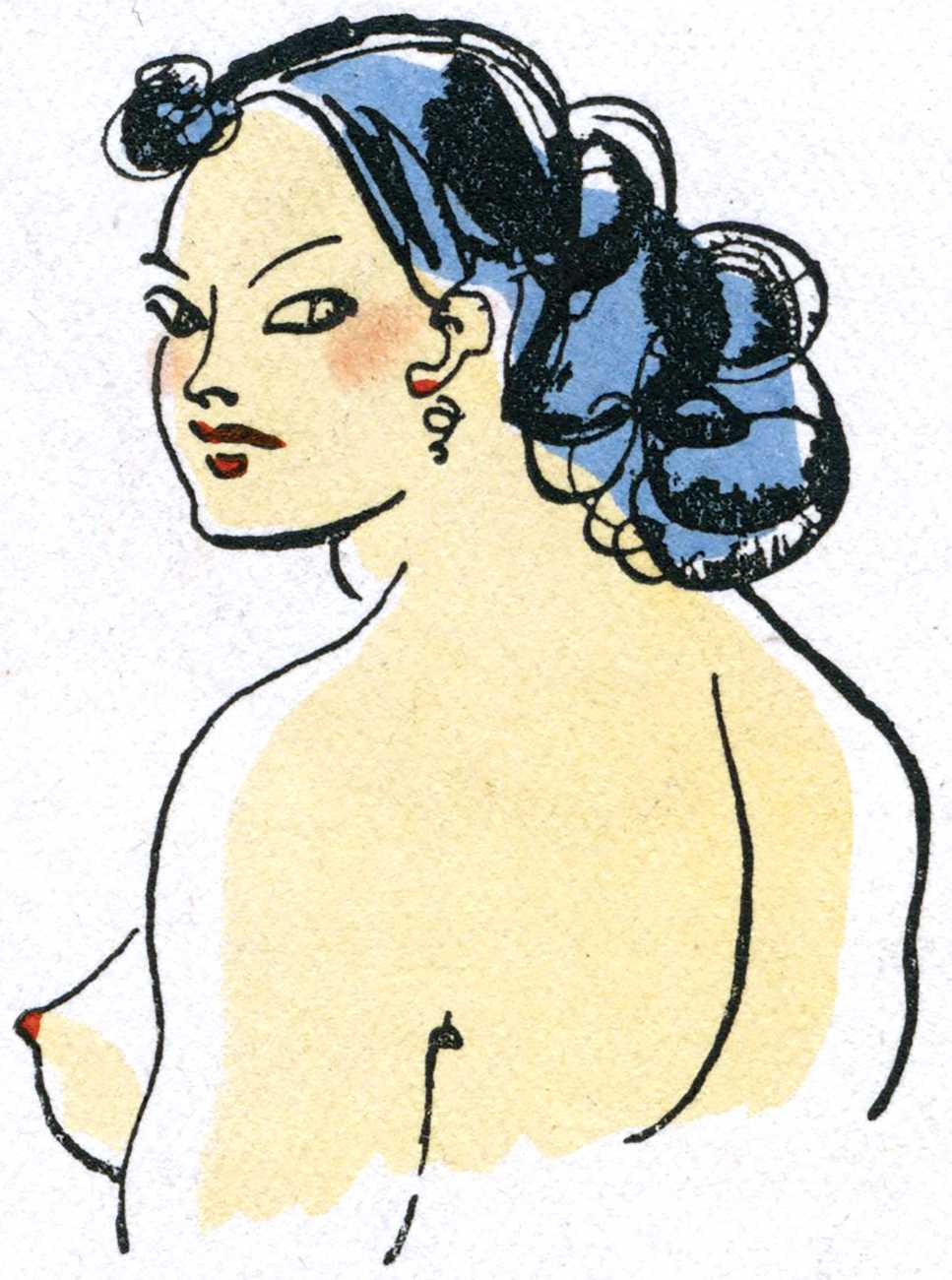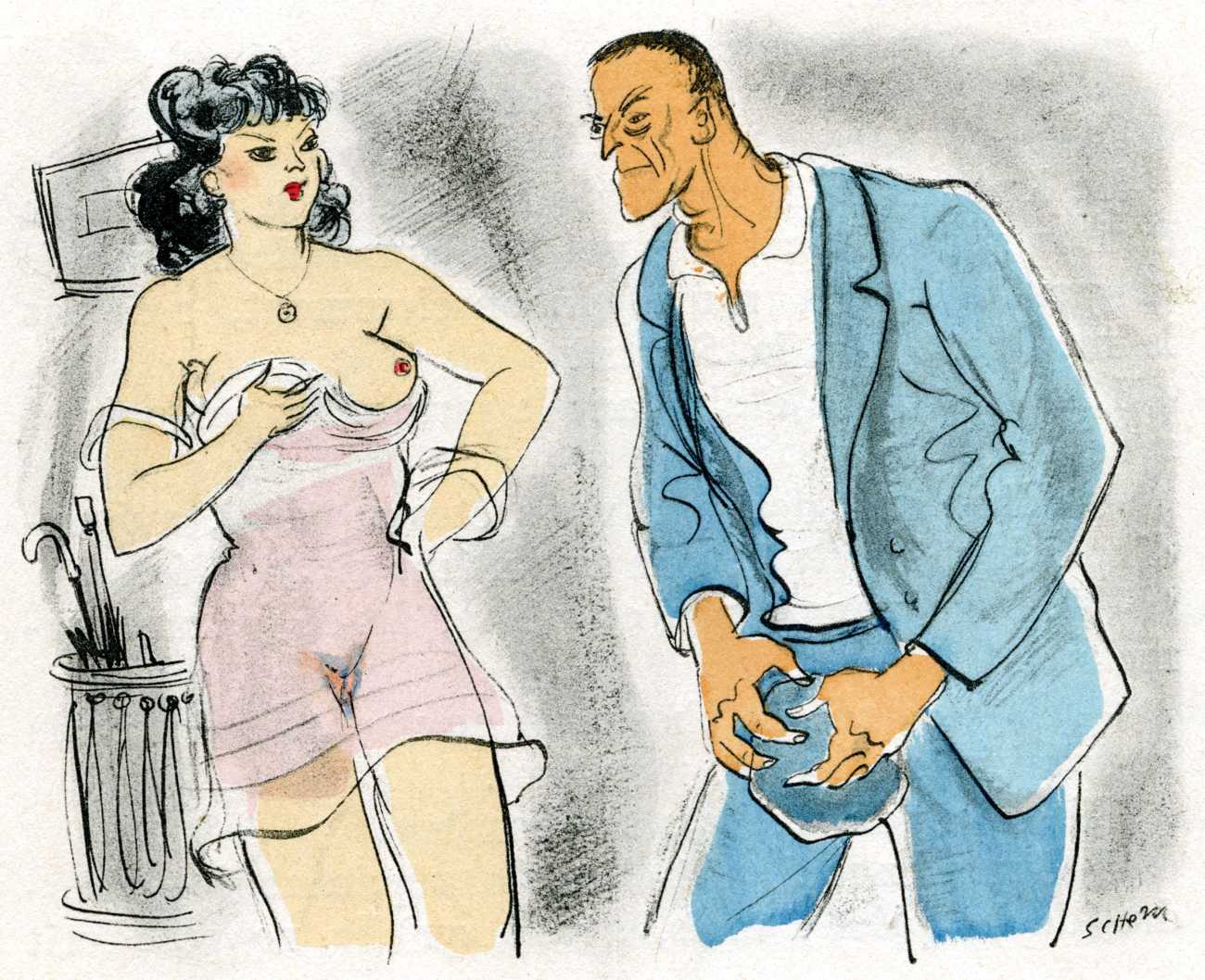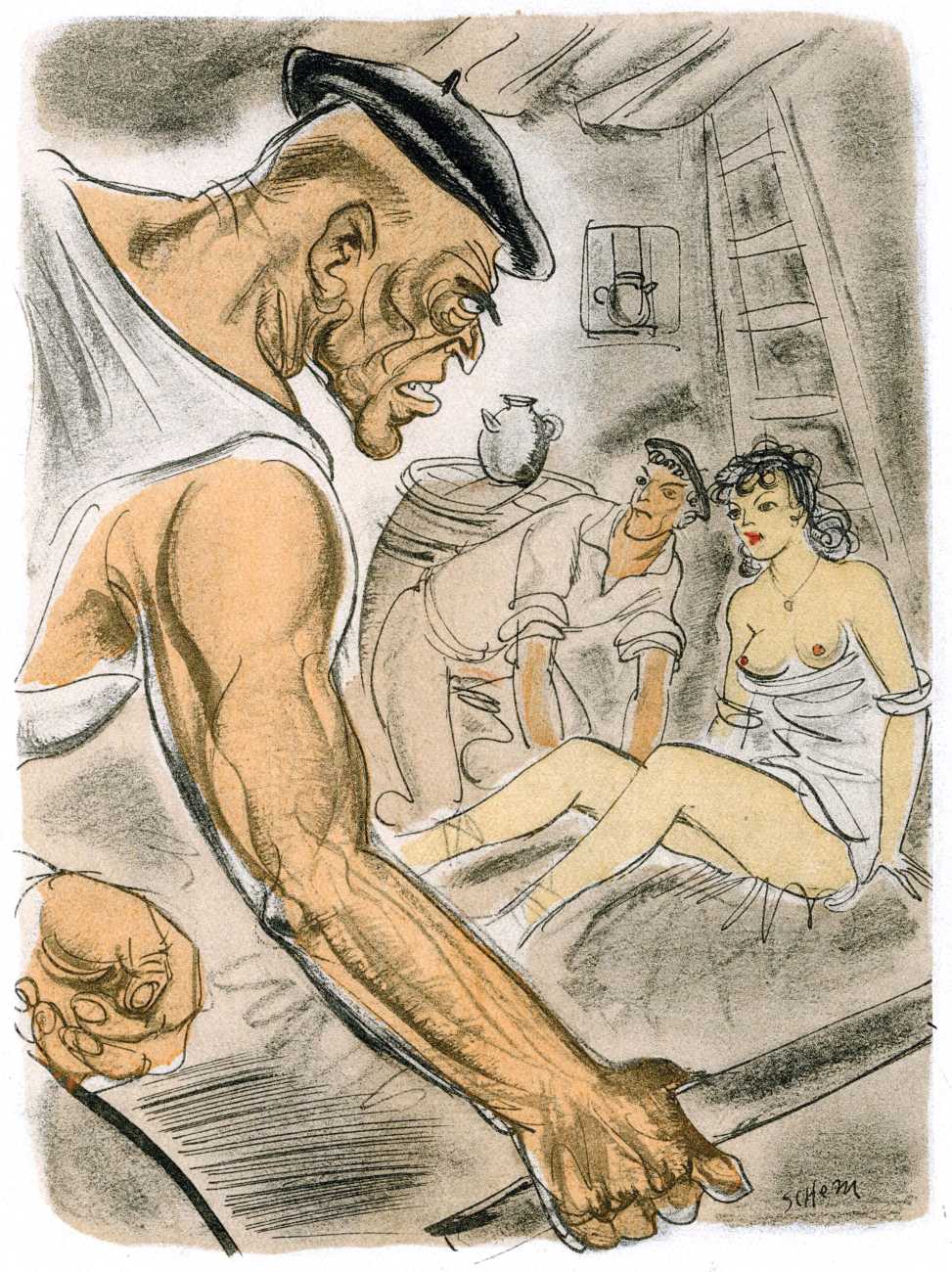 Among the mildly erotic titles illustrated by Schem are D.H. Lawrence’s Lady Chatterley (the French title for Lady Chatterley’s Lover), Le grant testament de Françoys Villon, Theophile Gautier’s Fortunio, and Paul Verlaine’s poetry. Apart from an edition of Pierre Louÿs’ Manuel de civilité, which may or may not be his work, we have only included here his illustrations for the 1936 L’histoire de Jérôme, the 1946 Le désir, the 1948 Petites cousines, Louÿs’ Roi Pausole, and Brantôme’s Les dames galantes, as his illustrations, while accomplished, tend to be very similar in style and rather characterless.