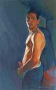 It was during his early years in New York that Nagano began experimenting with the shaped canvas format that has come to characterise his work. The unfolding tragedy of the AIDS crisis in the 1980s galvanised Shozo’s creativity into a new artistic genre, figurative painting, and he felt it important as an openly gay man to portray the power of the naked male body. In the paintings from this later period, very masculine male bodies draped in sheets or simply nude, bound and unbound, contorted in an agony of pain or in sexual bliss, populate his canvases.