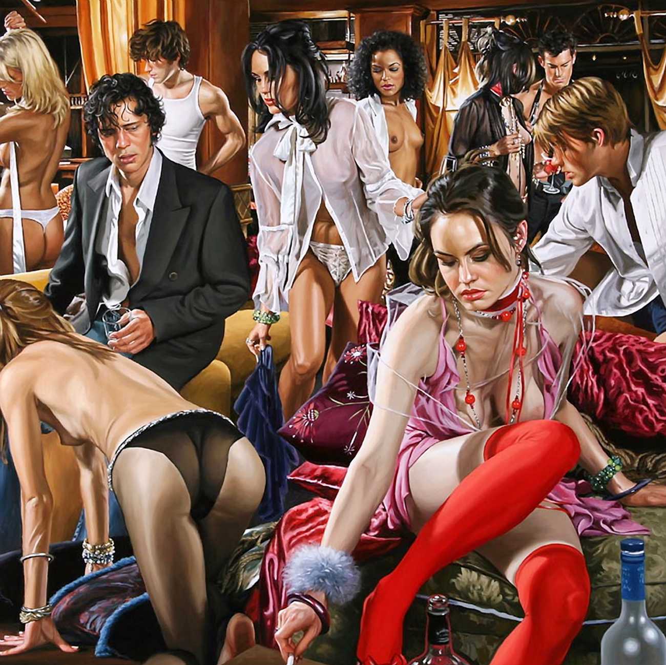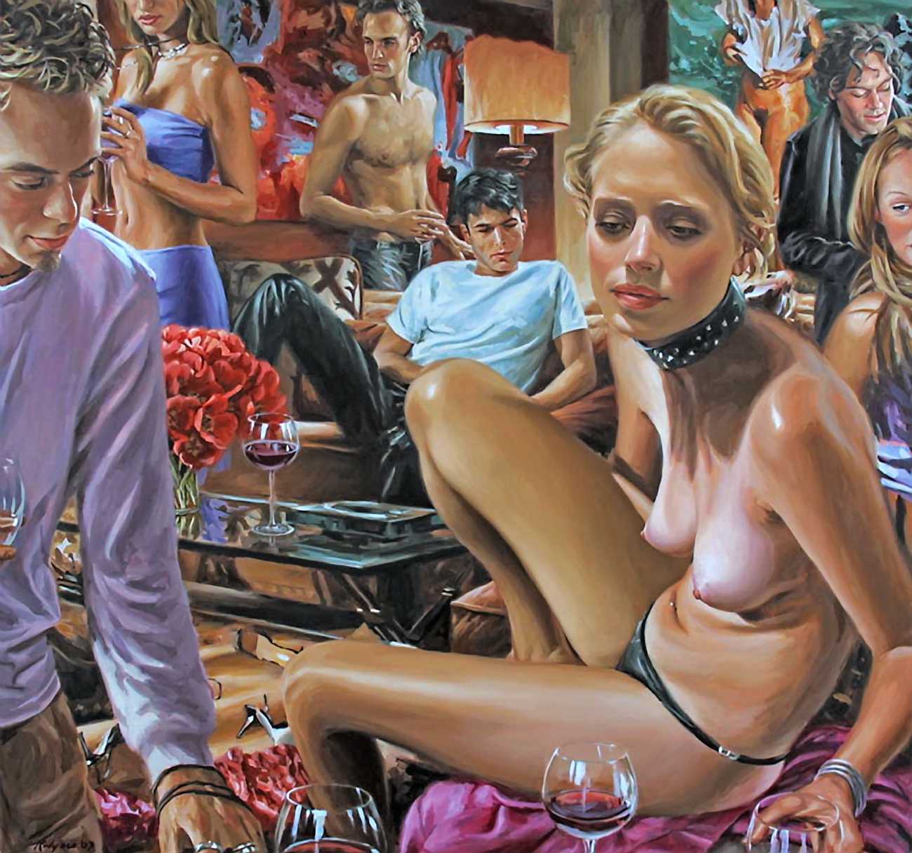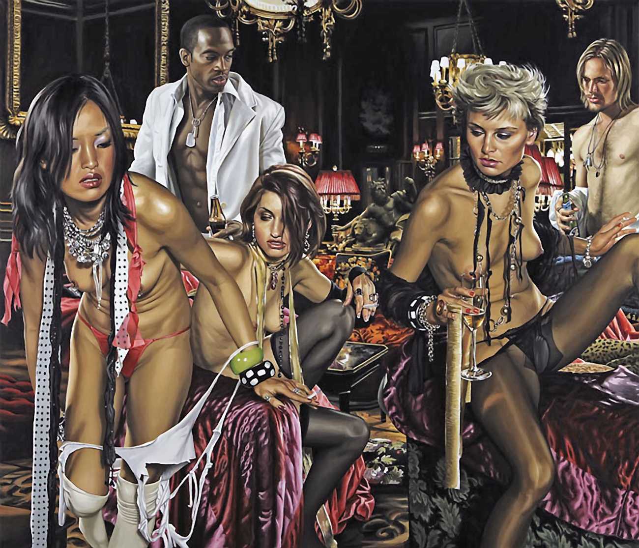 His earlier paintings often contemplated personal and family relationships in brightly-lit outdoor settings wrought with pale, intense, high-keyed colours, but most of his recent paintings conjure up a vision of the private nightlife of America’s privileged youth. Rodgers’ complex compositions emphasise the detachment of his characters: the eye can trace the angles and curves of their intersecting bodies on the painting’s surface, but their gazes almost all diverge from each other. There is a troubled insouciance in his characters living out a common fantasy – despite the clothes, the looks, the drinks, lounging in the midst of a quasi-orgy, there is something fragile and complex about his characters. The viewer is at the same time a voyeur and a guest at the party.