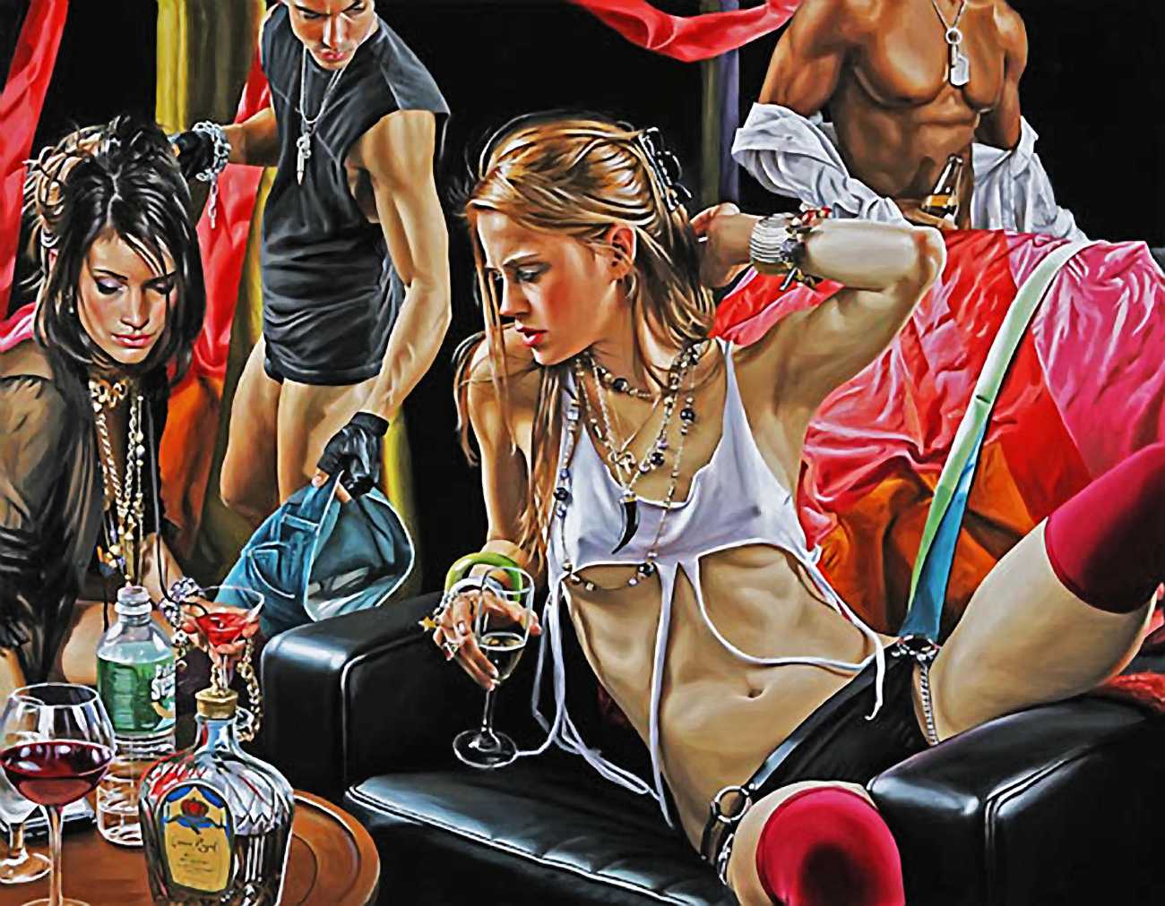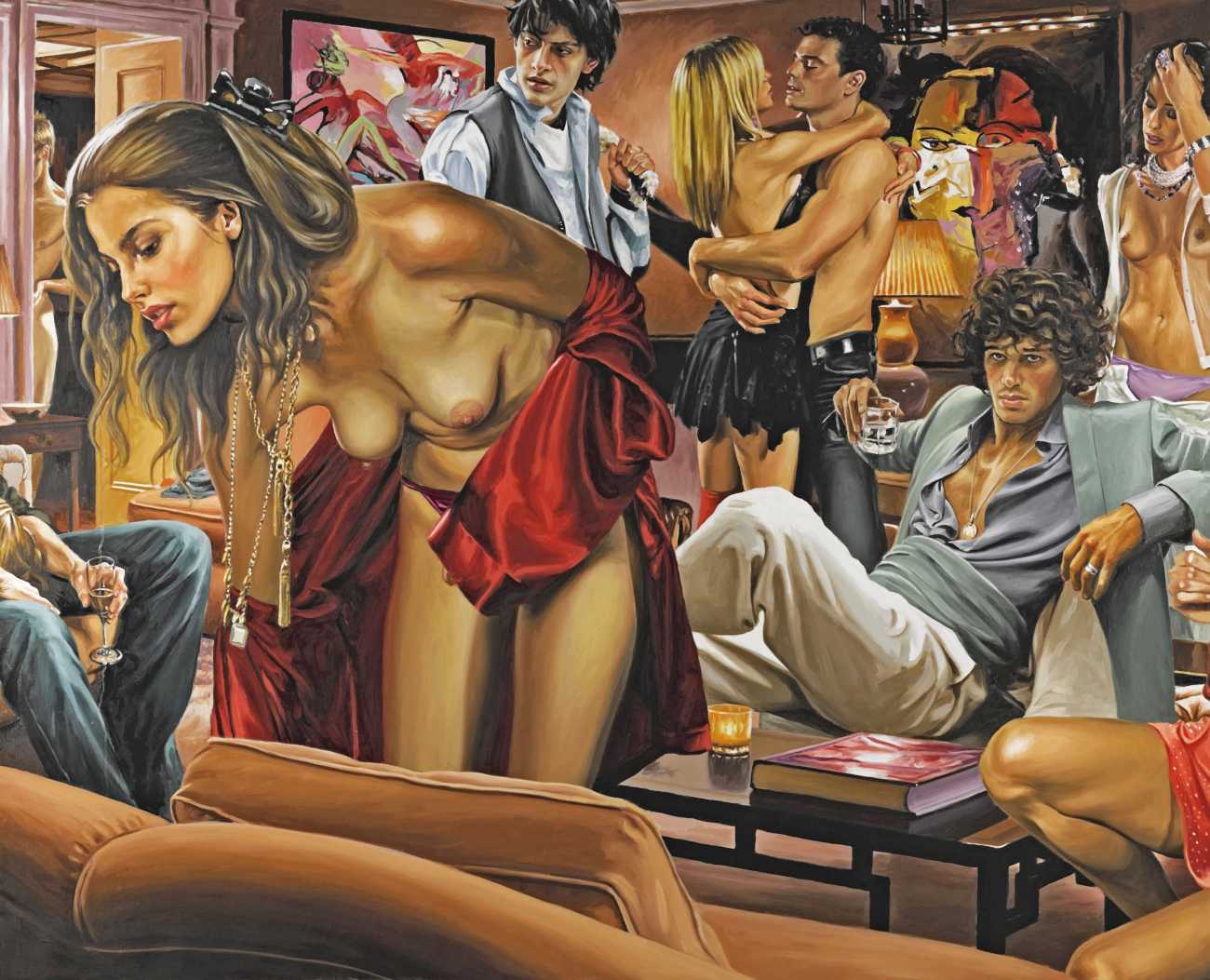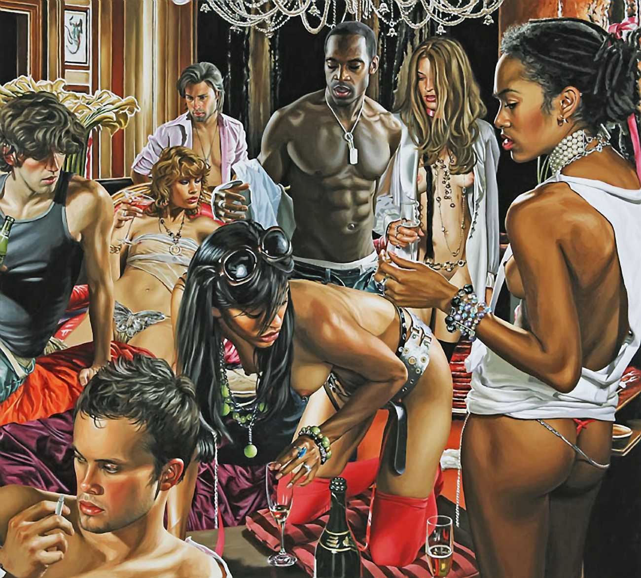 His earlier paintings often contemplated personal and family relationships in brightly-lit outdoor settings wrought with pale, intense, high-keyed colours, but most of his recent paintings conjure up a vision of the private nightlife of America’s privileged youth. Rodgers’ complex compositions emphasise the detachment of his characters: the eye can trace the angles and curves of their intersecting bodies on the painting’s surface, but their gazes almost all diverge from each other. There is a troubled insouciance in his characters living out a common fantasy – despite the clothes, the looks, the drinks, lounging in the midst of a quasi-orgy, there is something fragile and complex about his characters. The viewer is at the same time a voyeur and a guest at the party.