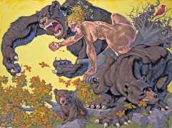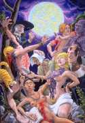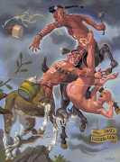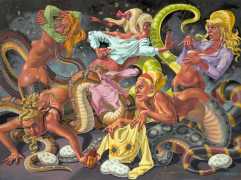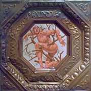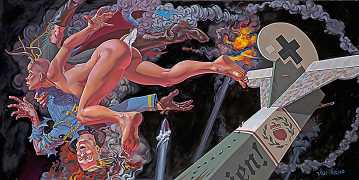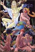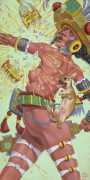 As a young illustrator his work appeared on album covers, video game box art, and nightclub posters, and in the late eighties he began producing large ‘cut-out’ paintings blending cartoon imagery with portraits of cultural and historical icons. These early paintings used black lines and luridly cartoon colour to depict characters ranging from John F. Kennedy to Herman Goering to Othello. To celebrate Christmas 1962 his guerrilla installation of a twelve-foot-tall angel hovered over Sunset Boulevard in Hollywood. Van Arno became fascinated with the calendar of the ancient Maya, and travelled to Yucatan to see the ruins at Chichen Itza, Coba and Tulum. During the early 1970s he began to create heroic figurative works featuring religious and folk heroes from Christian, Mayan and American history.