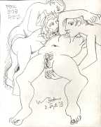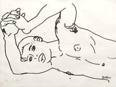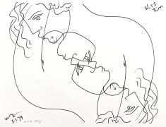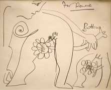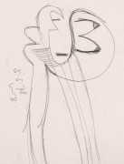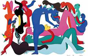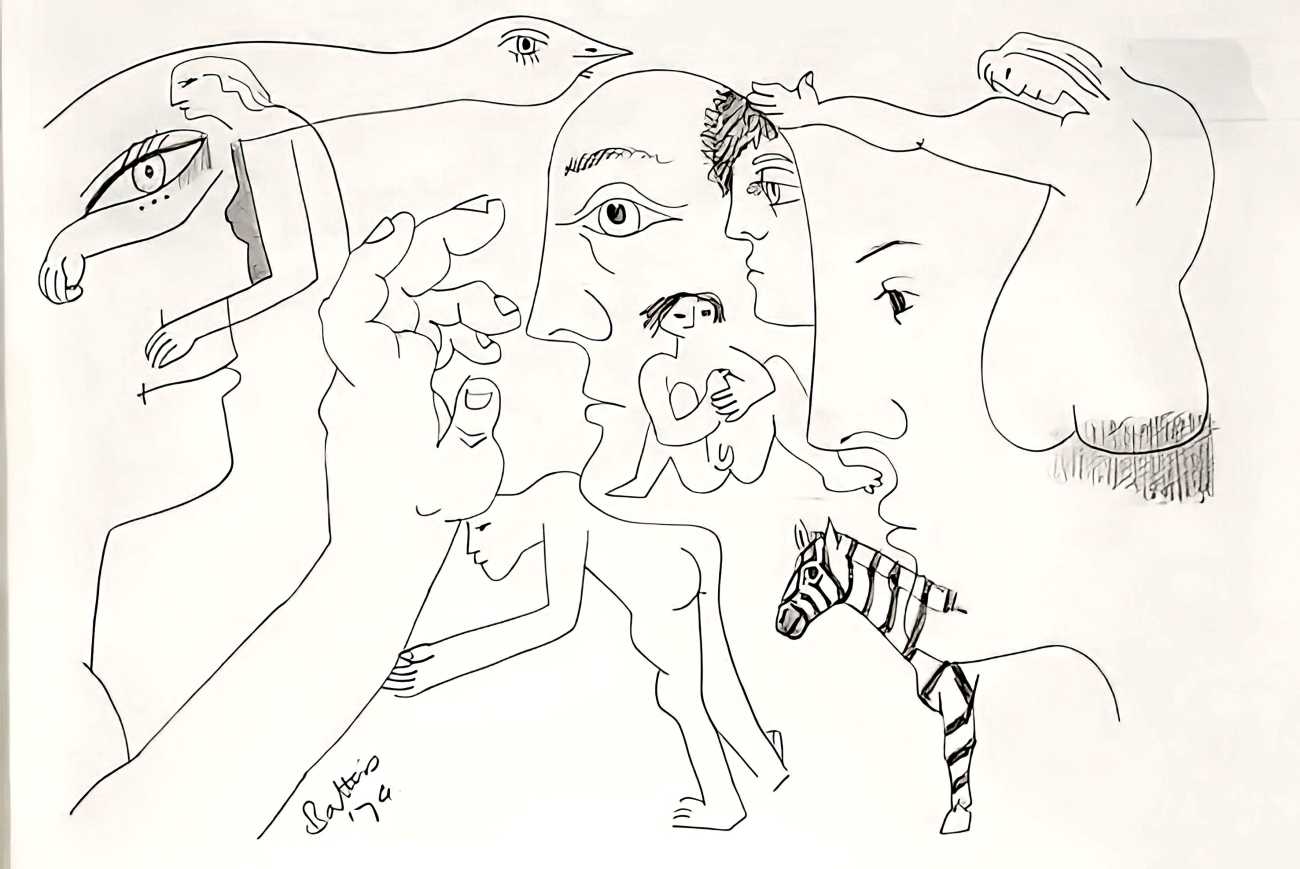 In 1938 he visited Europe for the first time and met the influential archaeologist, anthropologist, ethnologist and geologist Abbé Henri Breuil. He married Grace Anderson, a pioneering art educationalist, in 1940, and it was around this time that Battiss’ previously realistic style of painting began to take on a hieratic, symbolist character. While exhibiting a collection of South African art with the International Art Club in Italy in 1949, Battiss had his first meeting with Pablo Picasso and the futurist Gino Severini. Both artists made a strong impression on him, and the influence of their work can clearly be seen in his art.
