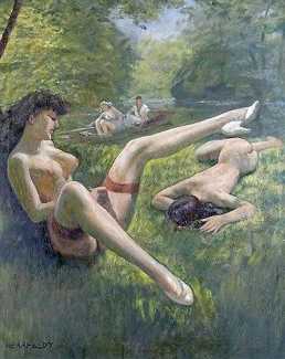 We could have included any number of large von Herrfeldt canvases of naked women in this section, but you can search the internet just as well as we can and build your own gallery if you find his paintings appealing. Rather than quantity we have opted for variety, so in addition to a few ‘standard beauties’ we offer you a walk on the beach with the dogs, some lesbian allusions, a rare male couple on the rocks, and one of Herrfeldt’s most complex paintings featuring human flesh, a classical scene painted around 1925.
