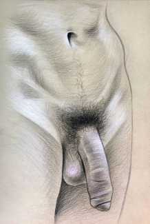 His website gallery of drawings, which you will find here, includes many close-up studies of cocks, vulvas, and tender sexual sharings, nearly all done in monochrome charcoal or pencil. It is very clear from his work that he is a strong advocate of natural pubic and underarrm hair, which he draws in profuse and loving detail.