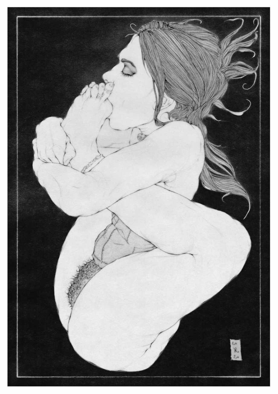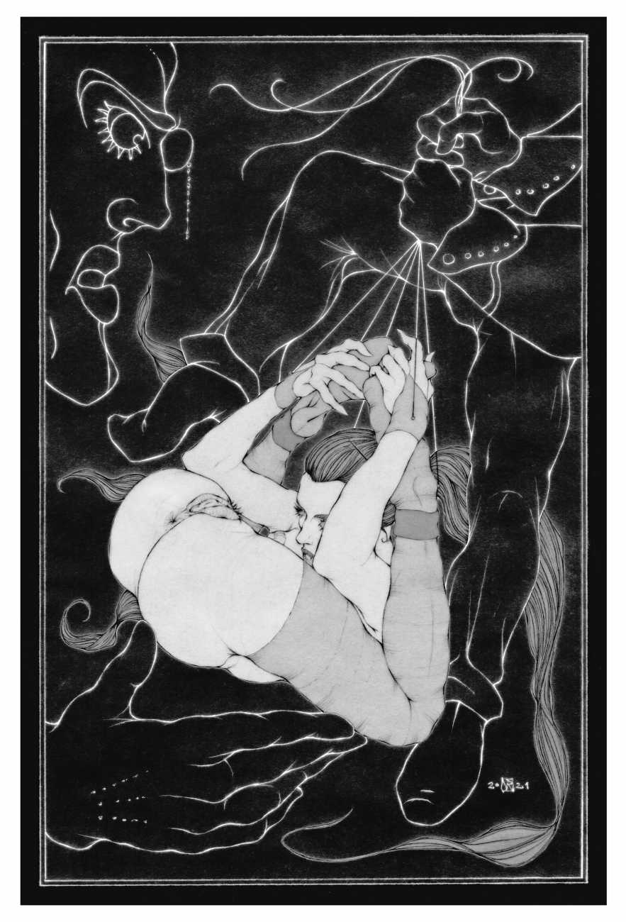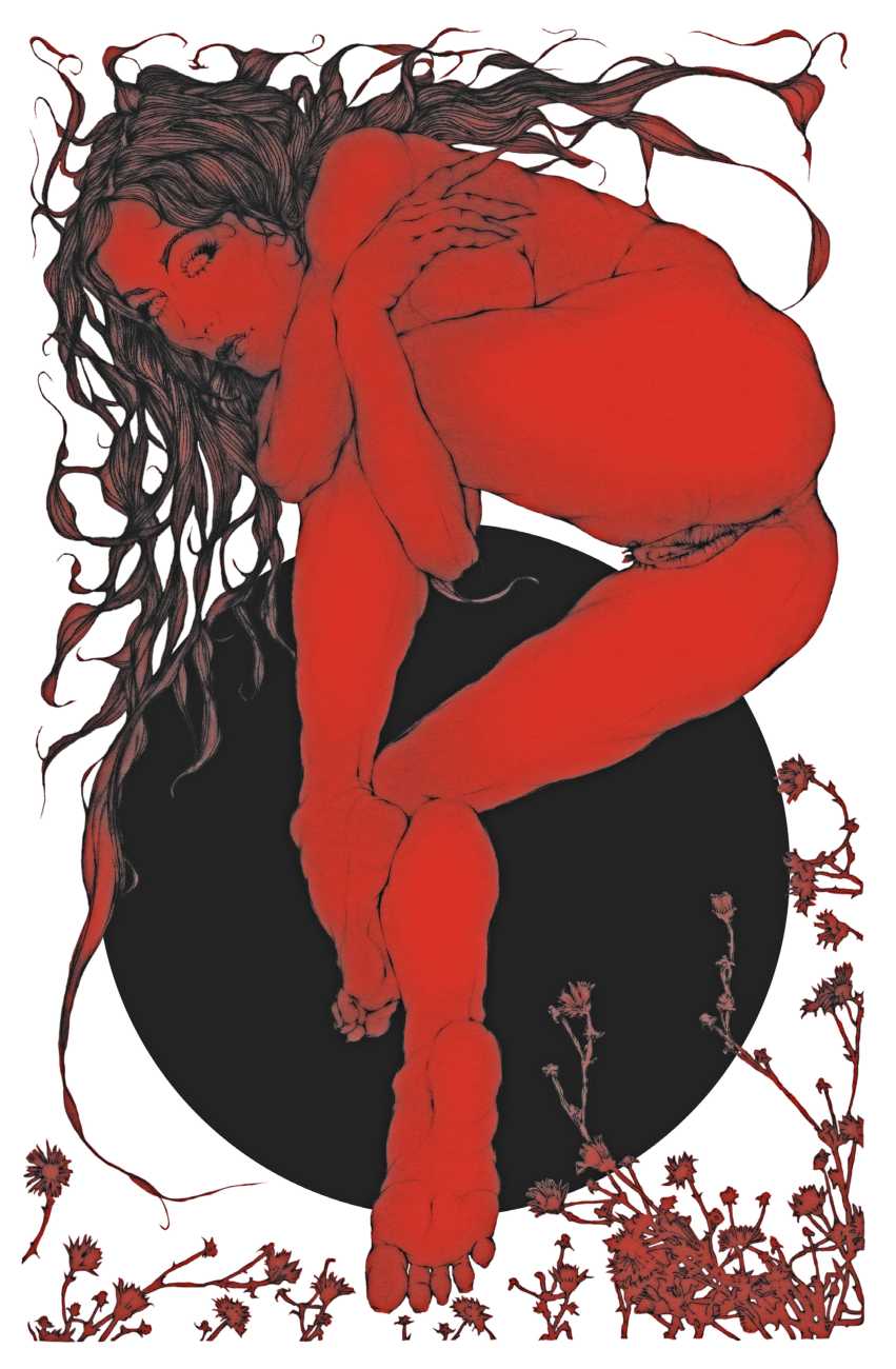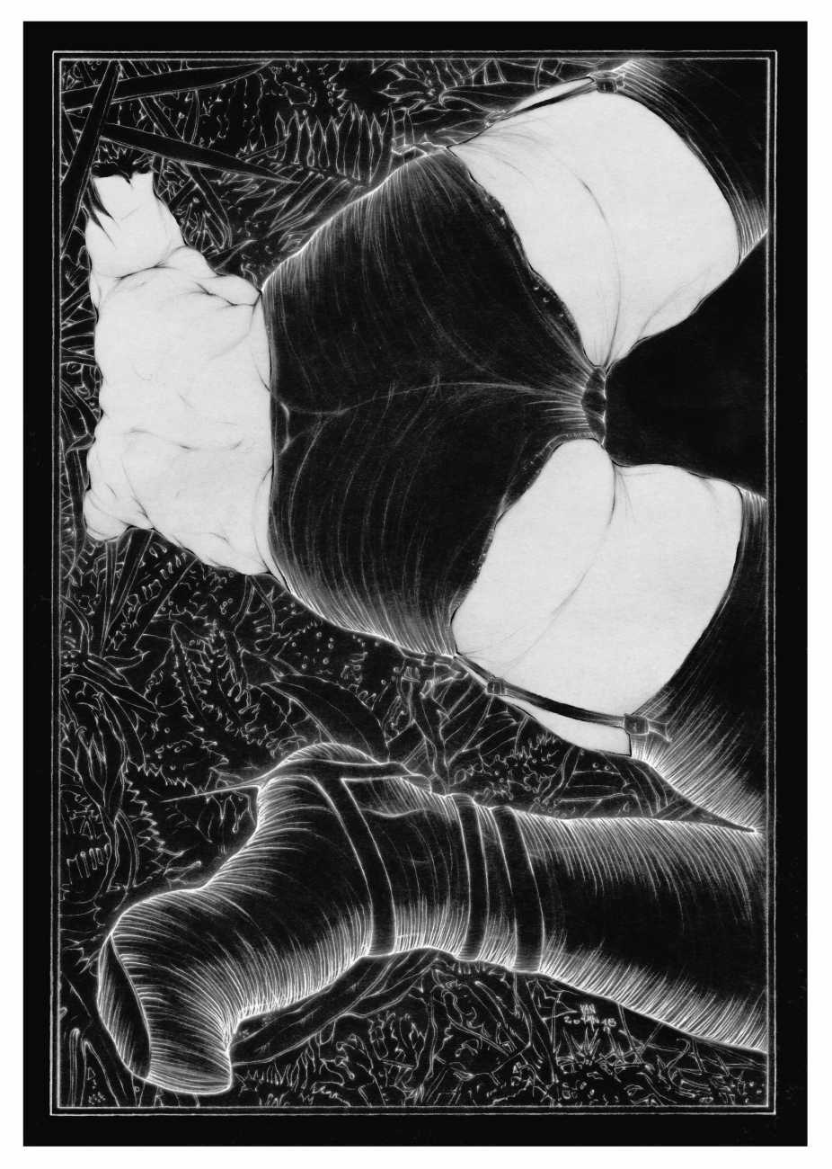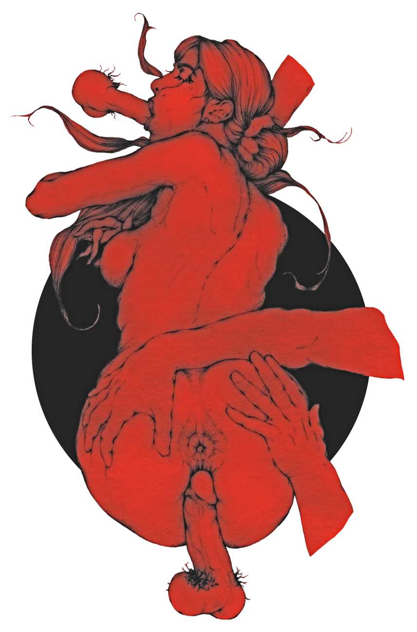 As well as the main text by Atanes, there are also text contributions by Madison Young, Xóchil Schülz, Annemarie Ryders, Hector Domaine and Carmine d’Acquaro. The van Rijn illustrations alternate between monochrome and vivid scarlet and black, another bold new experiment in erotic illustration.