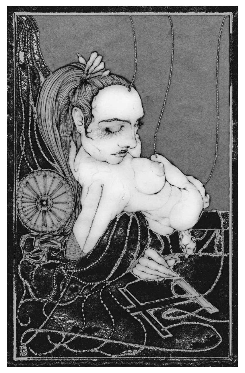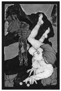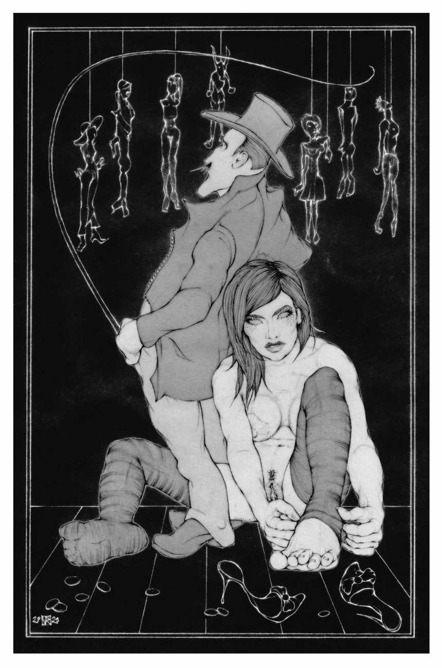 Querida, a collaboration between Jan van Rijn and the Spanish writer and filmmaker Carlos Atanes, is an illustrated narrative about a puppeteer who constructs a female puppet which he forces to act out erotic scenes. She is shaped in the likeness of his true love, a cousin who died too young. An exceptional piece of work, her limbs and eyes are masterpieces, crowned by locks made from the actual hair of the dead cousin. The puppet wakes to conscious and sensuality, and discovers that certain circumstances enable her to let her doll’s body come to life for limited periods of time. Soon she finds herself on a colourful and at times dangerous journey, leaving her naïve innocence and weakness behind, struggling for autonomy and self-determination. Ultimately her contempt for the hated puppeteer leads to a murderous showdown.