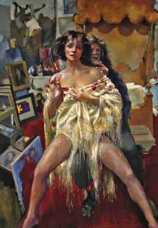 Though for Robert the distinction between model and lover was all-too-obviously not clear-cut, he nevertheless painted many women without there being sexual intimacy. He was just as interested in the quality of the artist-model relationship, to which end he included himself in many of his studies of women. This was frequently with the woman being naked or semi-naked and him in his trademark black smock and red scarf.