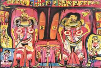 In the decade following the creation of the Wirklichkeiten group of artists, Franz Ringel concentrated on a series of paintings featuring naked bodies seen mostly face forward. His human figures are highly exaggerated and often have sexual connotations. They refer constantly to the artist himself; as he wrote, ‘I am actually incredibly locked up, trapped, bound in my own person. I have tried to free myself, but I cannot. The more I paint, the more I paint myself.’ In addition to Eros, Ringel was driven by fear, producing works which repeatedly show a split and multiplication of the subject, often through many eyes in one head or through figures that have grown together into a duality and often only have one torso. They are sometimes referred to as his Hermaphrodite Paintings.