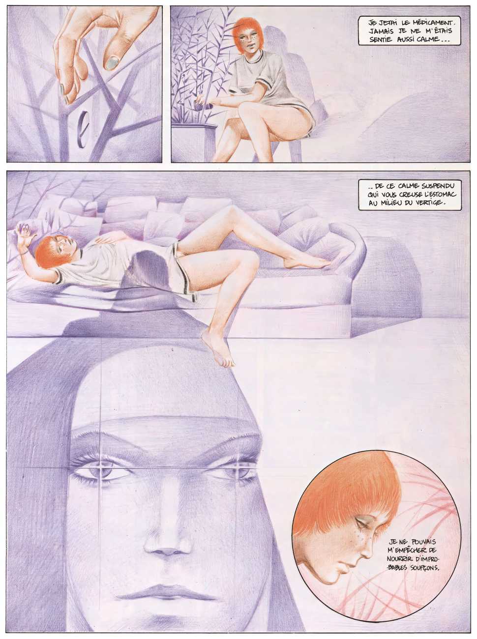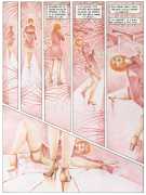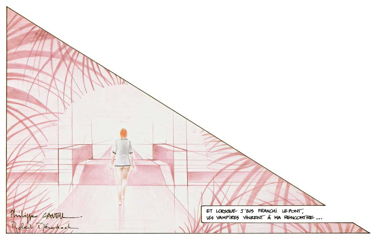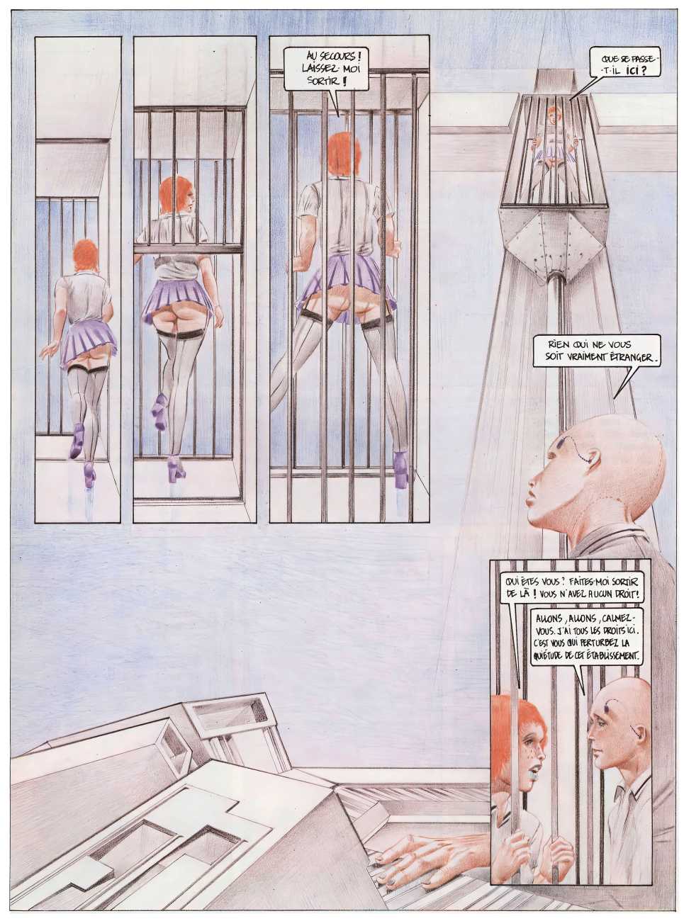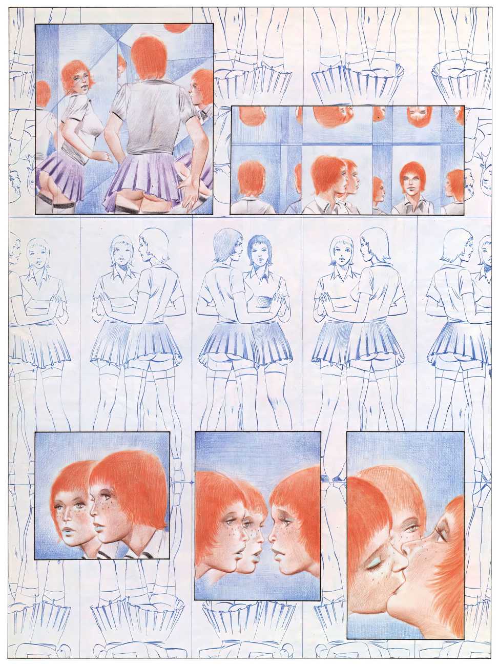 Jessica Ligari was Cavell’s first collaboration with the erotic novelist Robert Mérodack. Essentially it is a lesbian fantasy imagined by men, and as such can be criticised as stereotyped and formulaic. But Jessica Ligari manages to transcend most similar fantasy, introducing elements of trans-sexuality, religion, psychedelic drugs, sex robots and online erotica which are way ahead of their time. Philippe Cavell’s drawings are remarkable, using a limited palette of coloured pencils to explore perspective and comic composition in novel and genre-expanding ways.