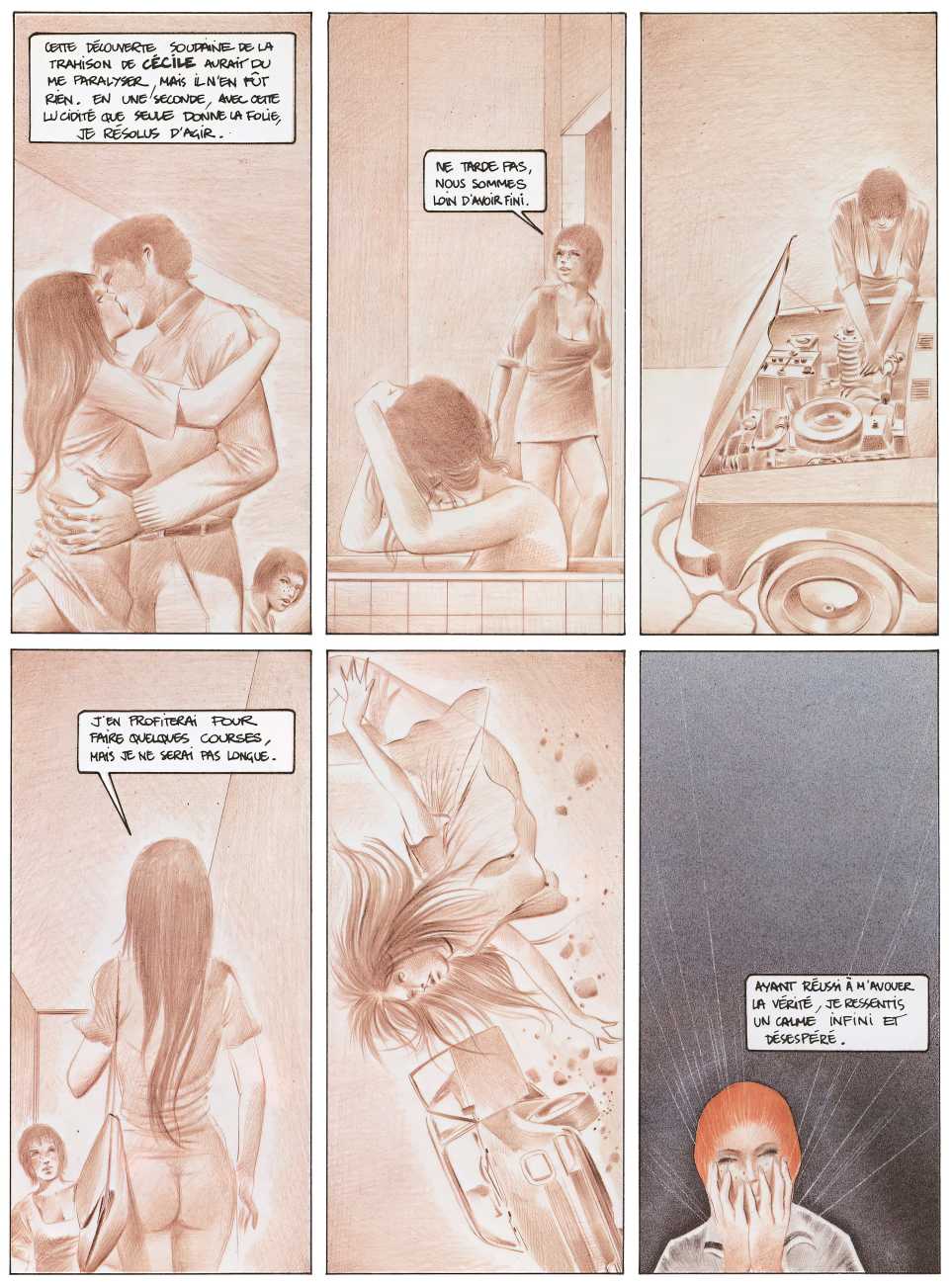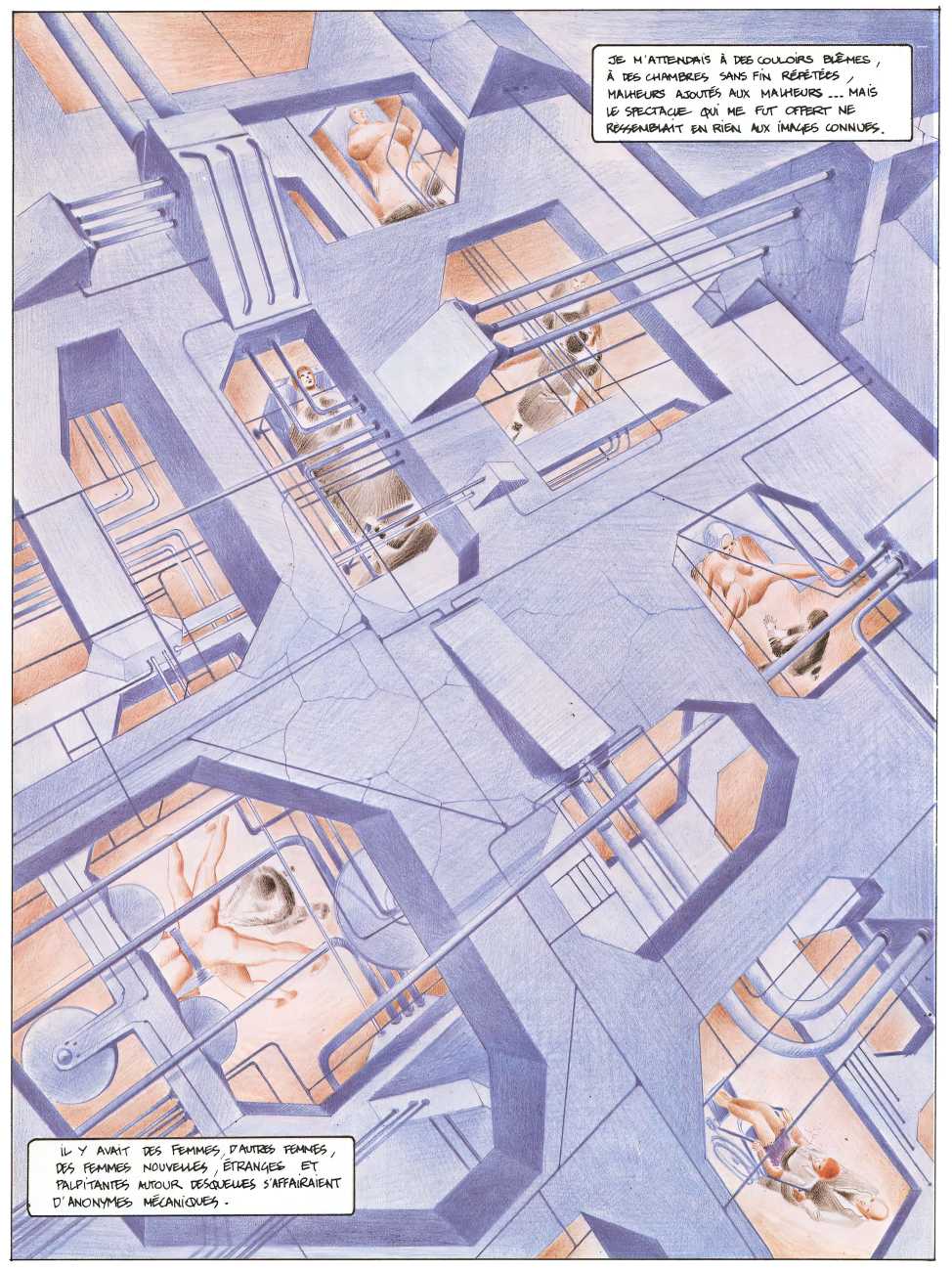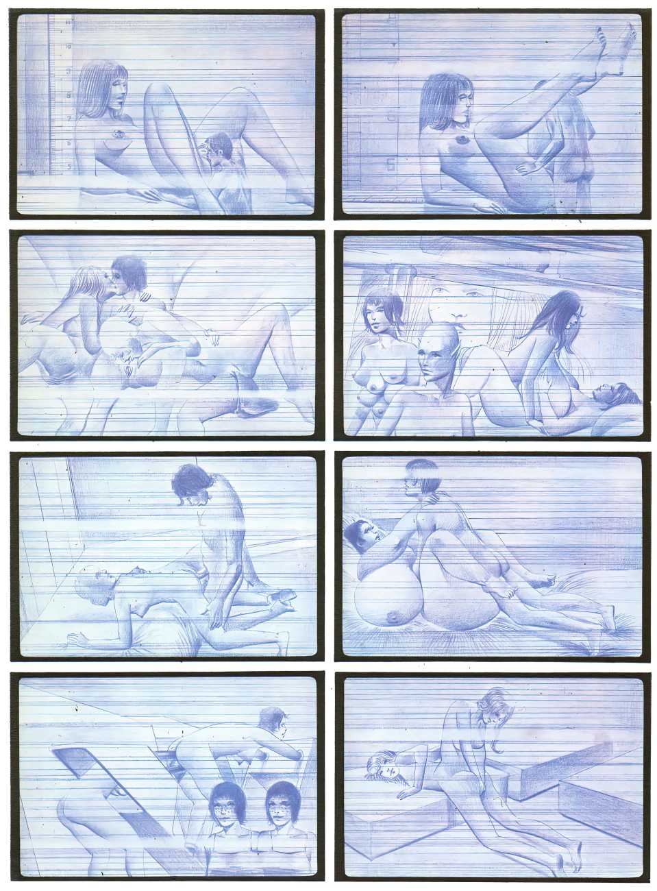 Jessica Ligari was Cavell’s first collaboration with the erotic novelist Robert Mérodack. Essentially it is a lesbian fantasy imagined by men, and as such can be criticised as stereotyped and formulaic. But Jessica Ligari manages to transcend most similar fantasy, introducing elements of trans-sexuality, religion, psychedelic drugs, sex robots and online erotica which are way ahead of their time. Philippe Cavell’s drawings are remarkable, using a limited palette of coloured pencils to explore perspective and comic composition in novel and genre-expanding ways.