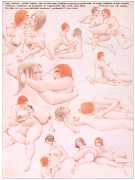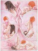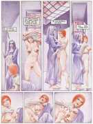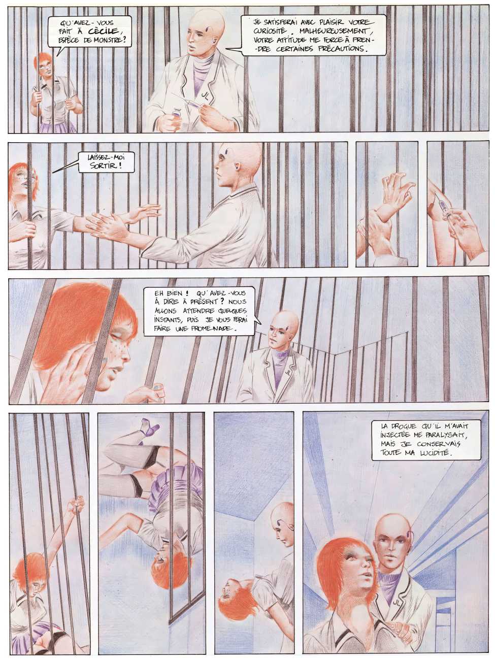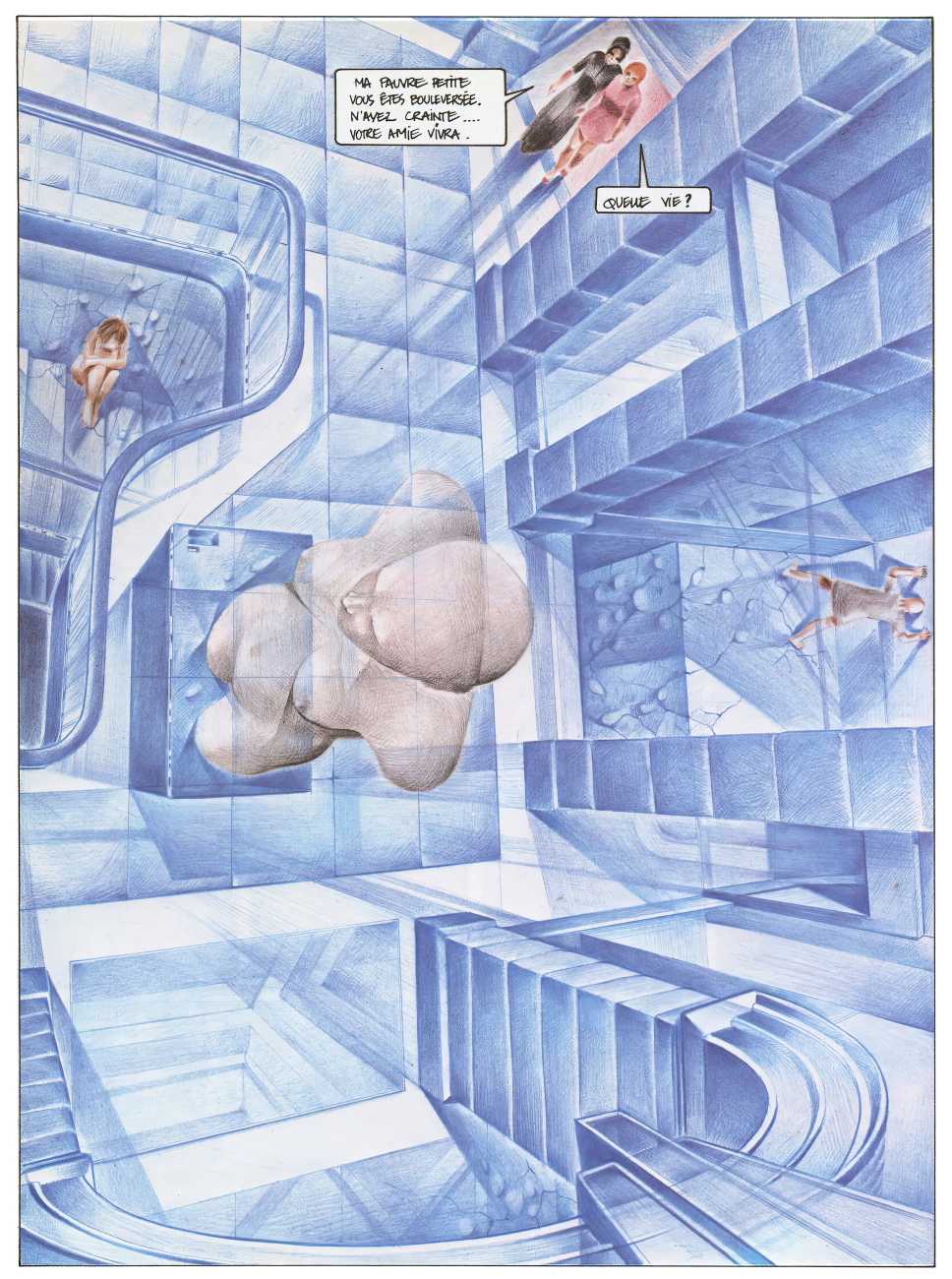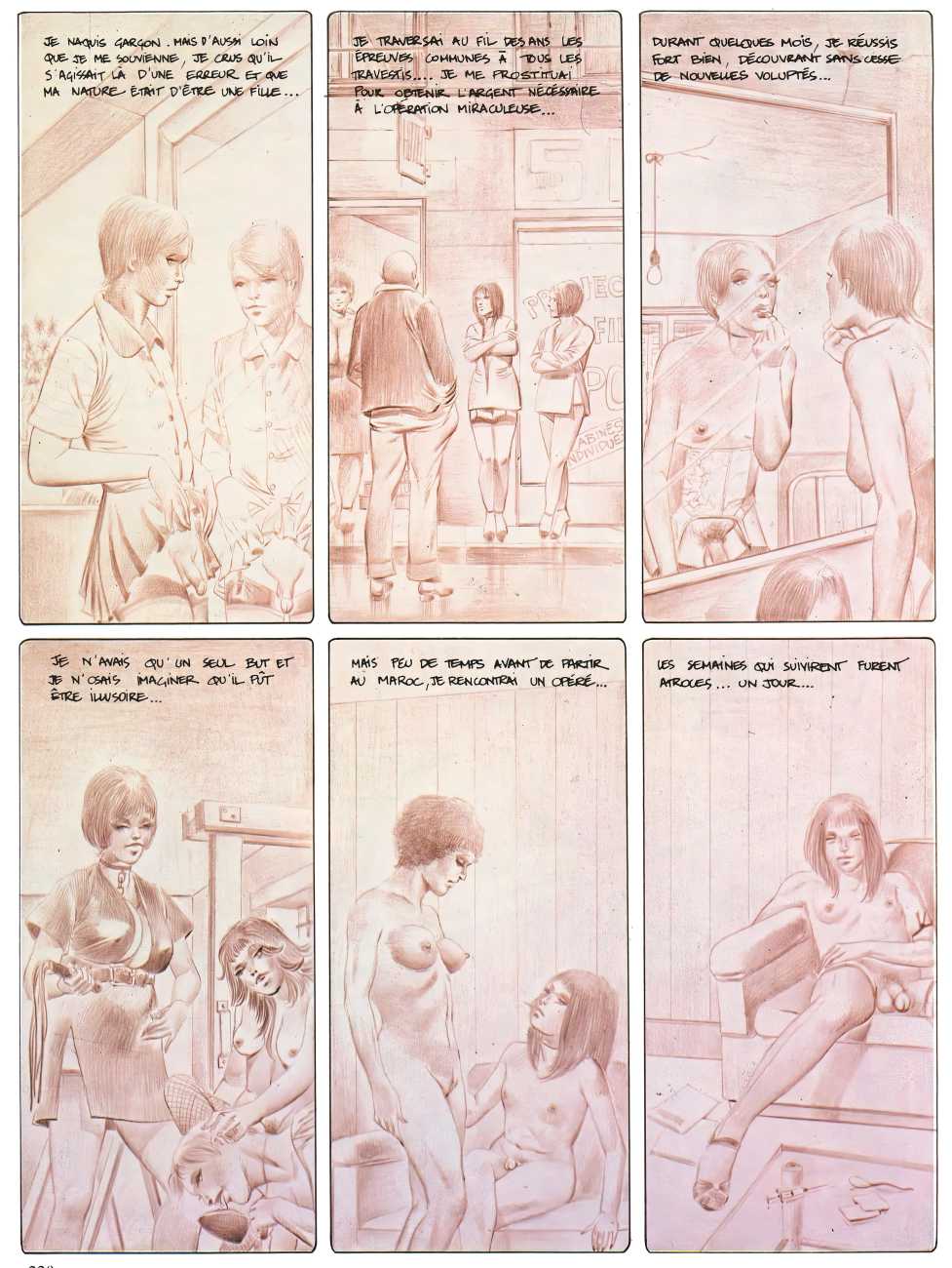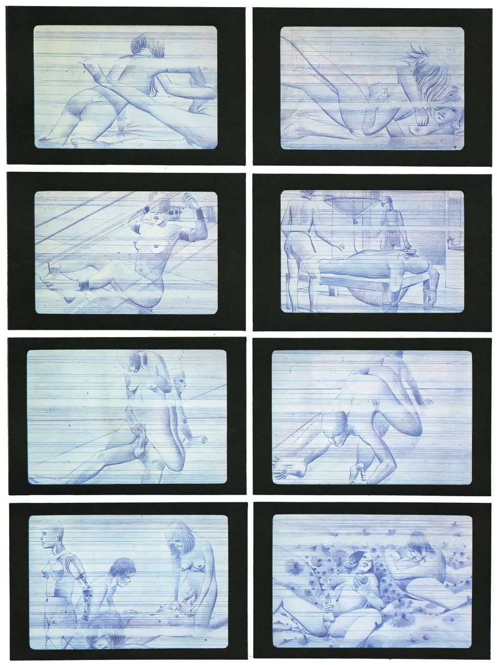 Jessica Ligari was Cavell’s first collaboration with the erotic novelist Robert Mérodack. Essentially it is a lesbian fantasy imagined by men, and as such can be criticised as stereotyped and formulaic. But Jessica Ligari manages to transcend most similar fantasy, introducing elements of trans-sexuality, religion, psychedelic drugs, sex robots and online erotica which are way ahead of their time. Philippe Cavell’s drawings are remarkable, using a limited palette of coloured pencils to explore perspective and comic composition in novel and genre-expanding ways.