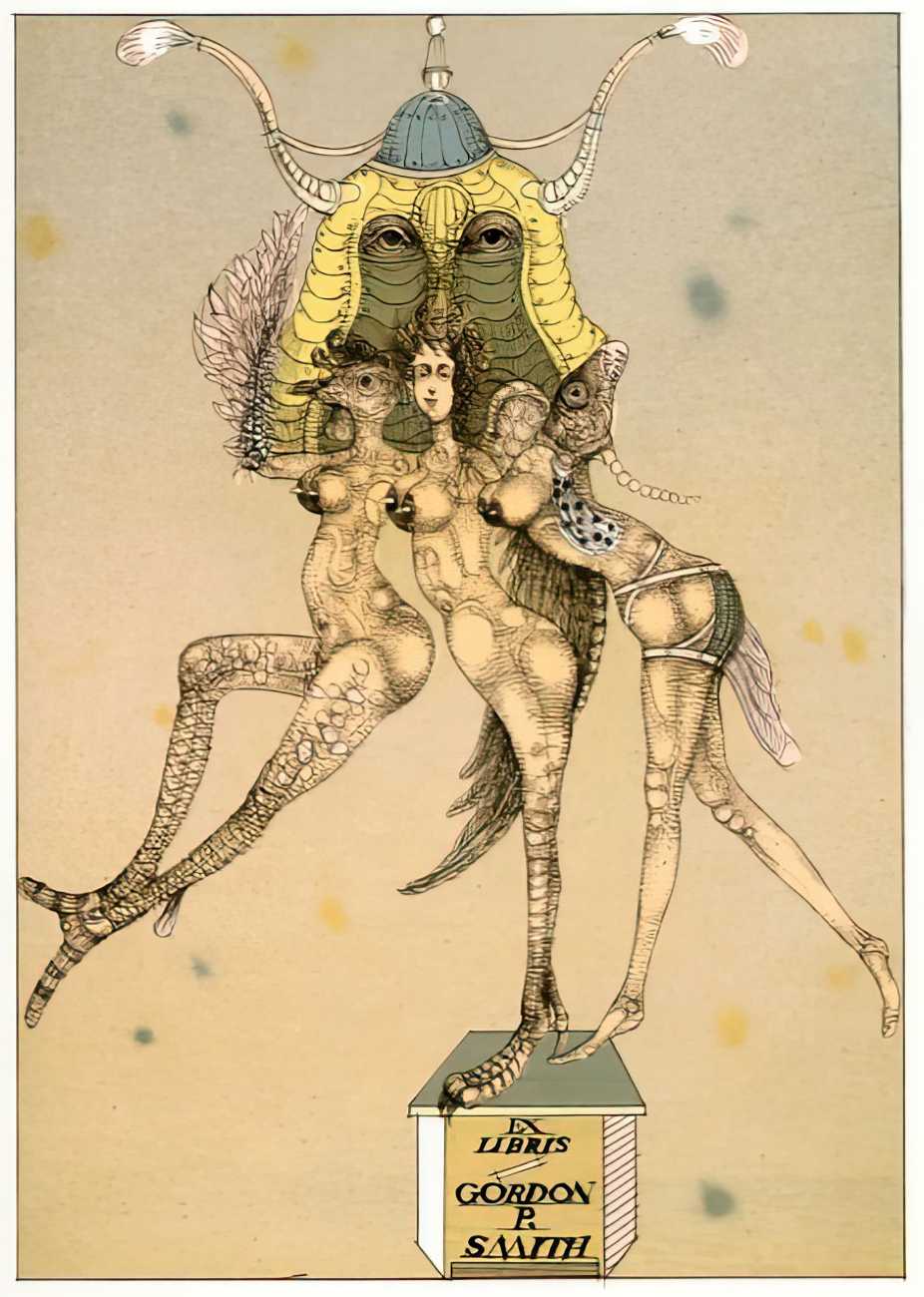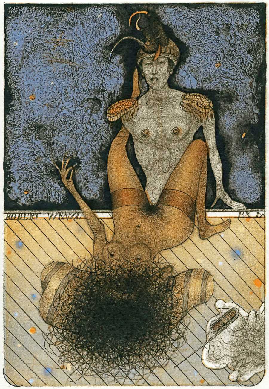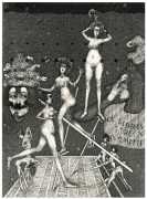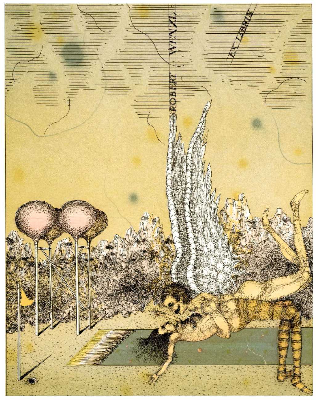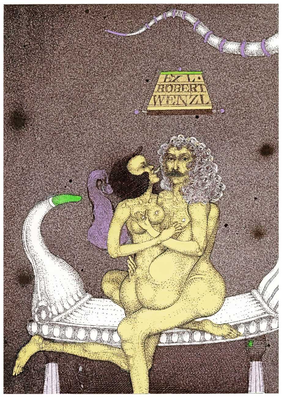 Like many eastern European artists, one of Vladimír Gažovič’s specialities is the ex libris or bookplate, which in Gažovič’s talented hands becomes a colourful jewel of miniature detail and imagination. Each of these small masterpieces displays a carefully thought out repertoire of characters and interactions, clearly interpreting the client’s brief and particular interests. Most include some witty and pertinent erotic element.