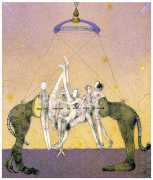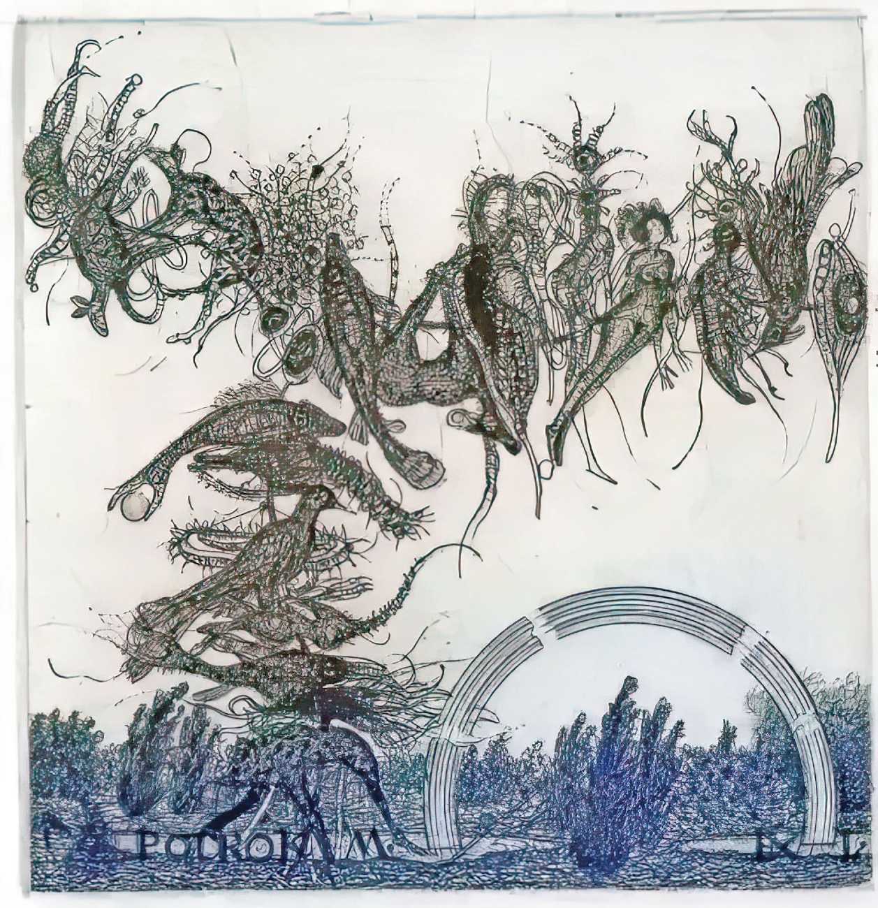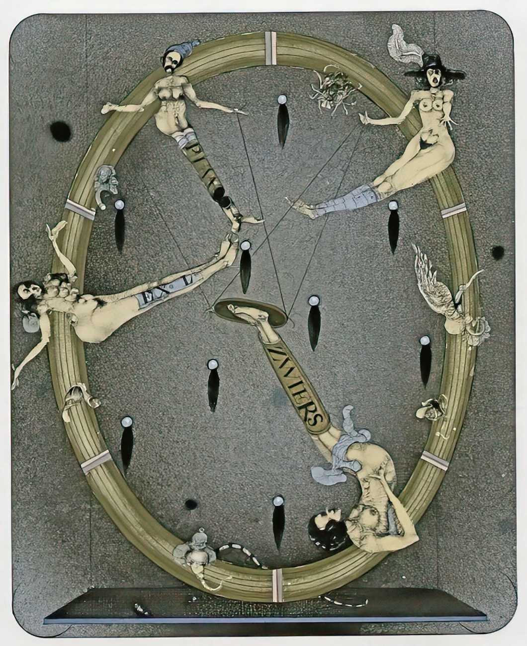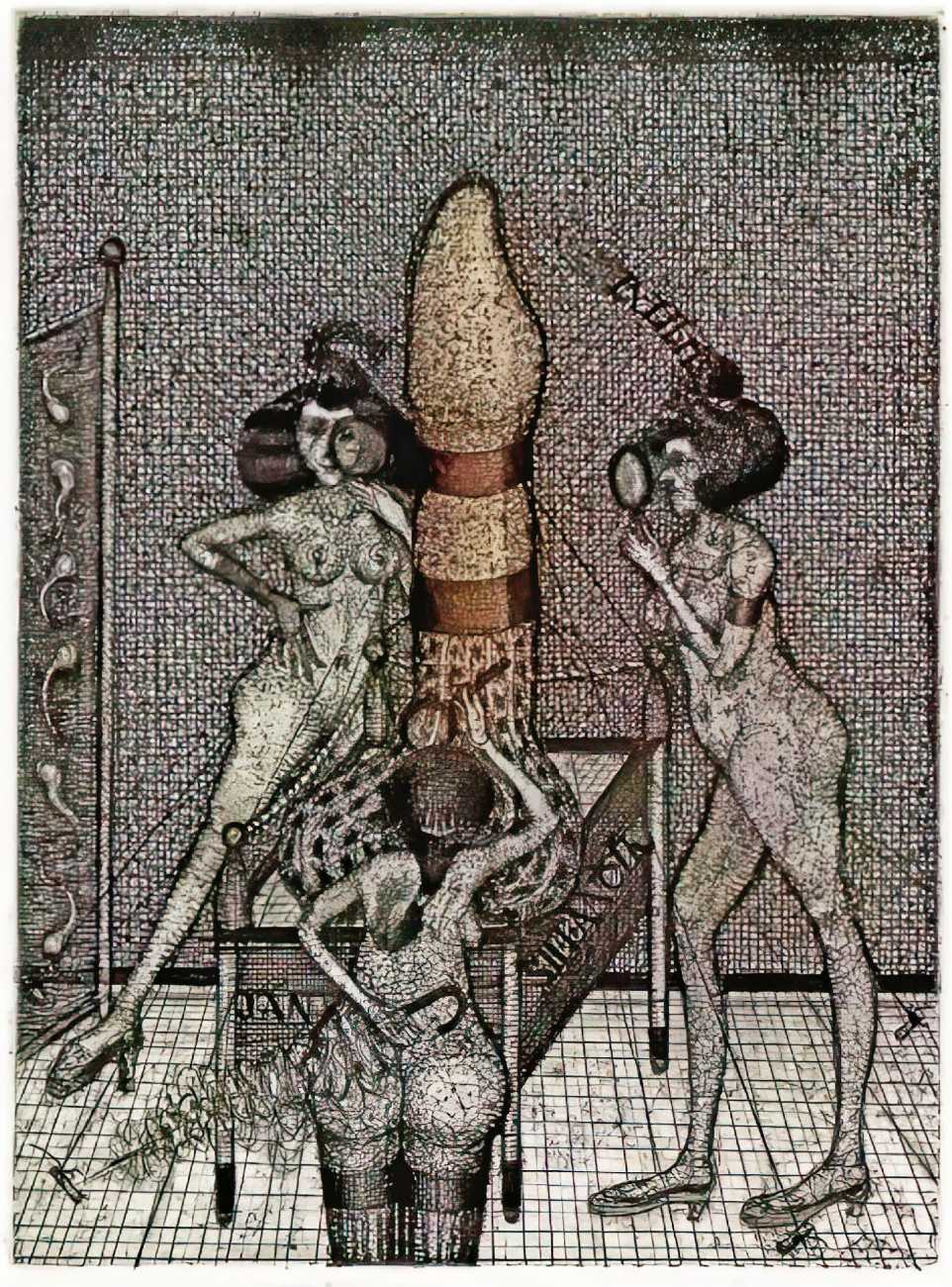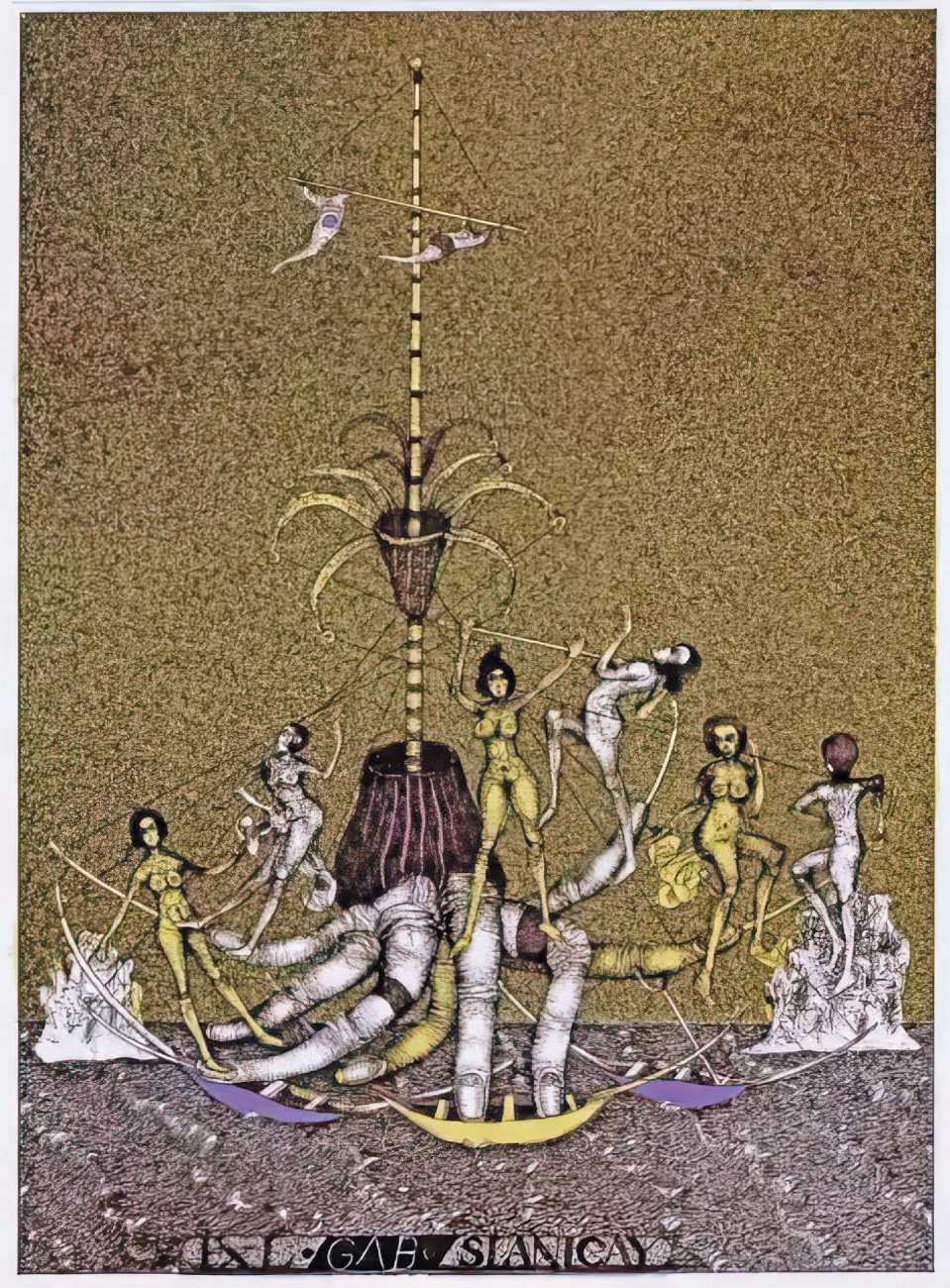 Like many eastern European artists, one of Vladimír Gažovič’s specialities is the ex libris or bookplate, which in Gažovič’s talented hands becomes a colourful jewel of miniature detail and imagination. Each of these small masterpieces displays a carefully thought out repertoire of characters and interactions, clearly interpreting the client’s brief and particular interests. Most include some witty and pertinent erotic element.