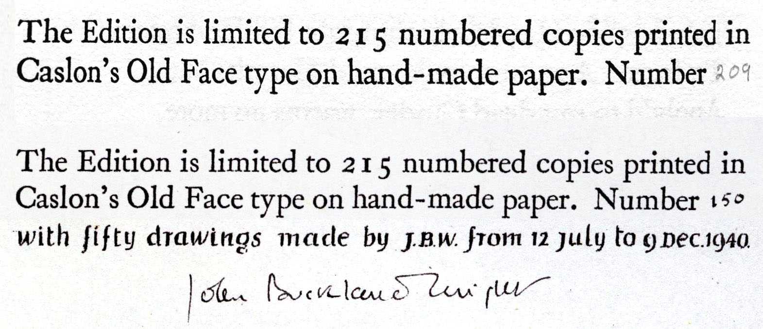 Fortunately, however, in 1940 one of the 215 limited edition copies, number 150, was given to John Buckland Wright, well known to the press’s co-owner Christopher Sandford, to add hand-drawn pencil illustrations for one of their (few) wealthy clients. Buckland Wright rose to the occasion, producing fifty drawings to fill all the available spaces in the book – two full-page, 21 half- or three-quarter page, and 27 vignettes and tailpieces.