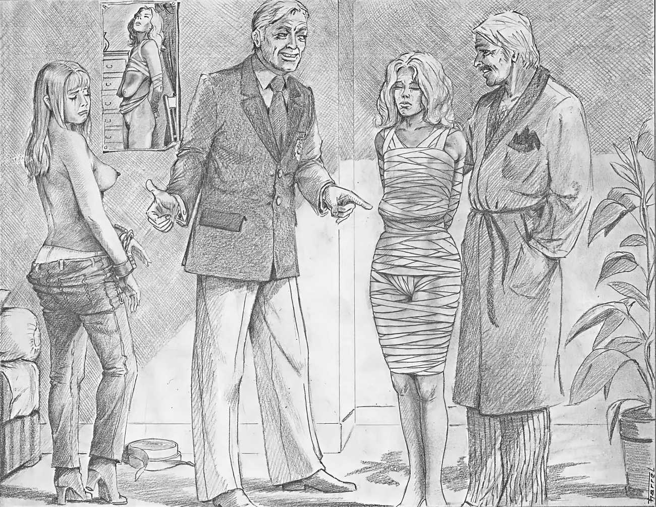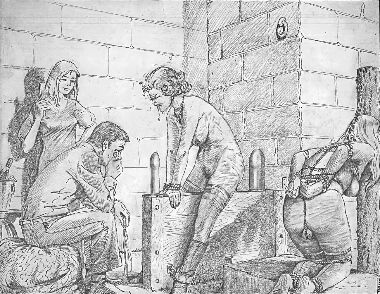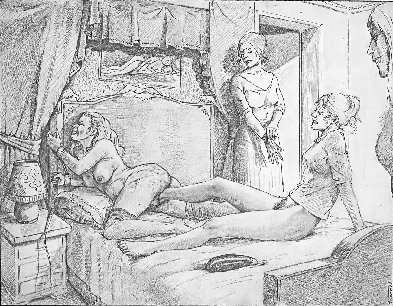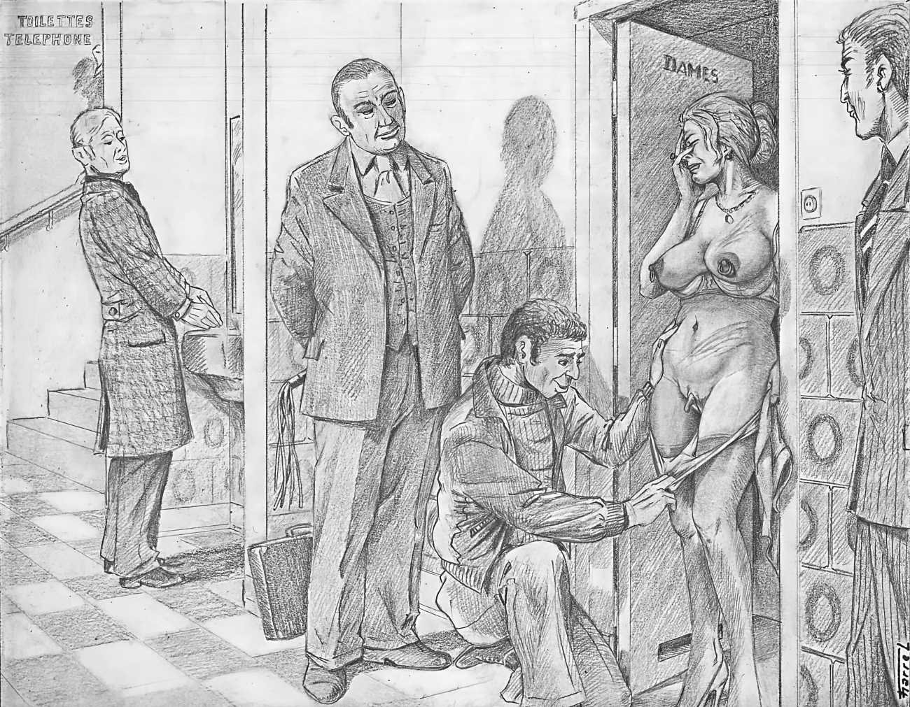 By the late 1970s Farrel had found his preferred style, detailed pencil drawings exploring extreme sado-masochism. But his is not the baroque setting of Sade’s castles, nunneries and dungeons, it is what Christophe Bier calls ‘The Formica Furniture’, the everyday settings of Farrel’s imaginings. In his conversation with Ayzad, Bier offers his understanding of the fascination of Farrel’s work: ‘The social criticism is inherently there, because Farrel is inspired only by what surrounds him. The characters look like the ordinary people he meets, his neighbours, his bosses. The settings are taken from direct experience. He doesn’t revel in fantasy or porno-chic. Farrel focuses on the world of the French middle classes. With his violent art he dismembers much of the niceness of the standard French social model. He likes to depict even the most violent erotic cruelty in a relatable way, in “normal” surroundings. We often see jubilant torturers but also placid voyeurs, all of them callous toward the pain they cause; they are the archetypal sadists. It all trivialises violence and makes it even more unbearable. In the texts accompanying some drawings we are struck by the joking tone of the dialogues. Sadism becomes almost banal.’
