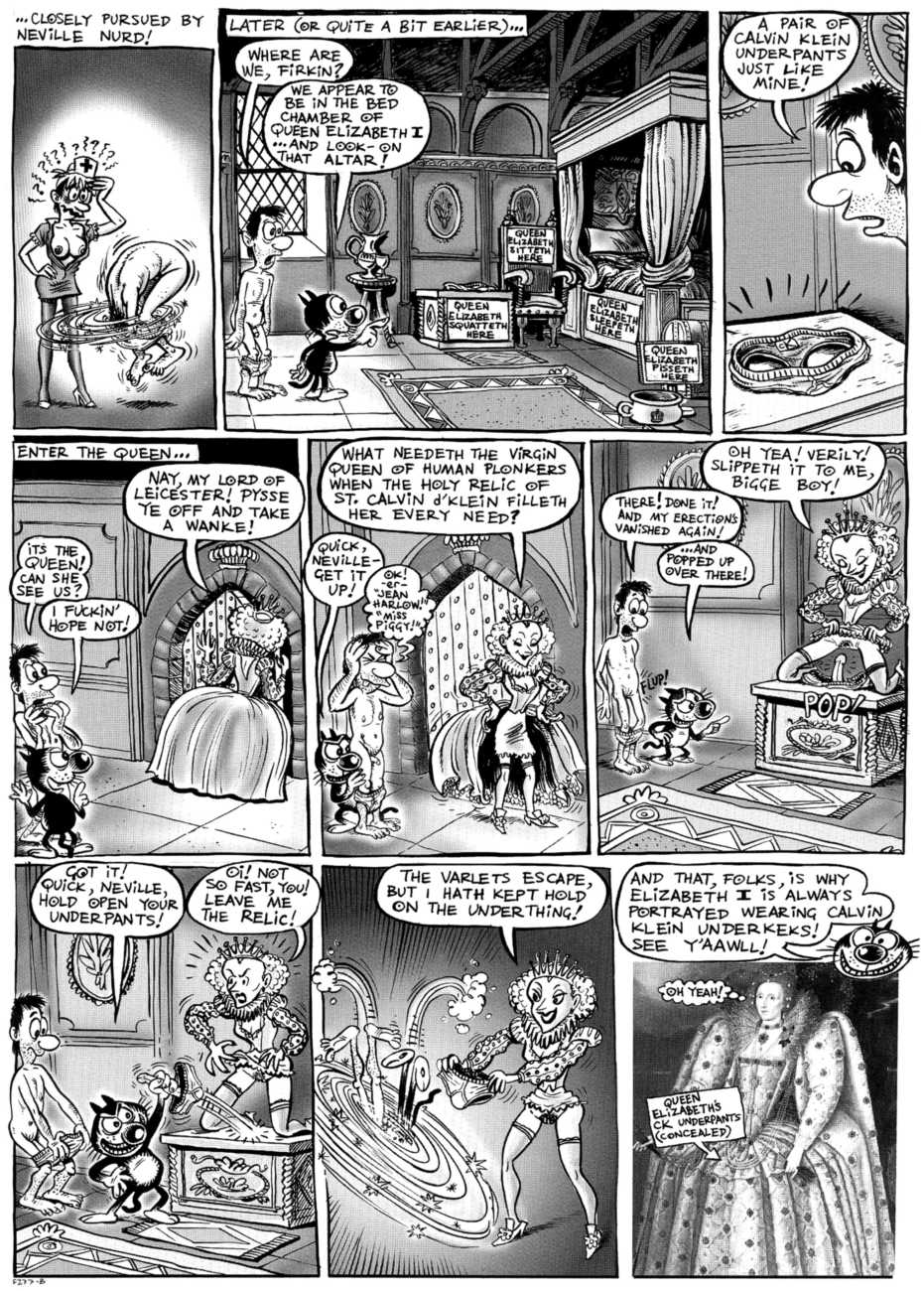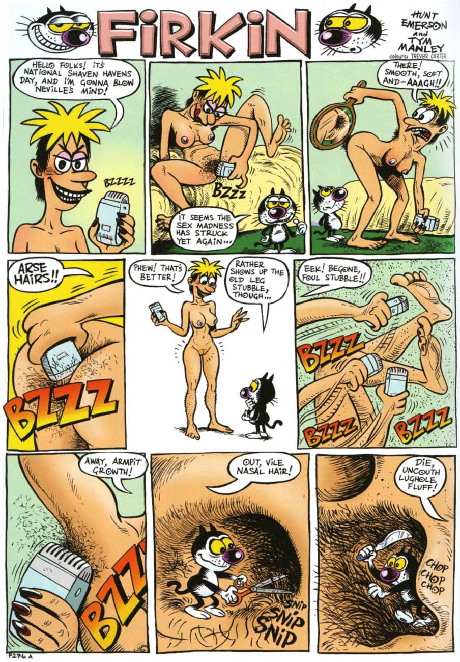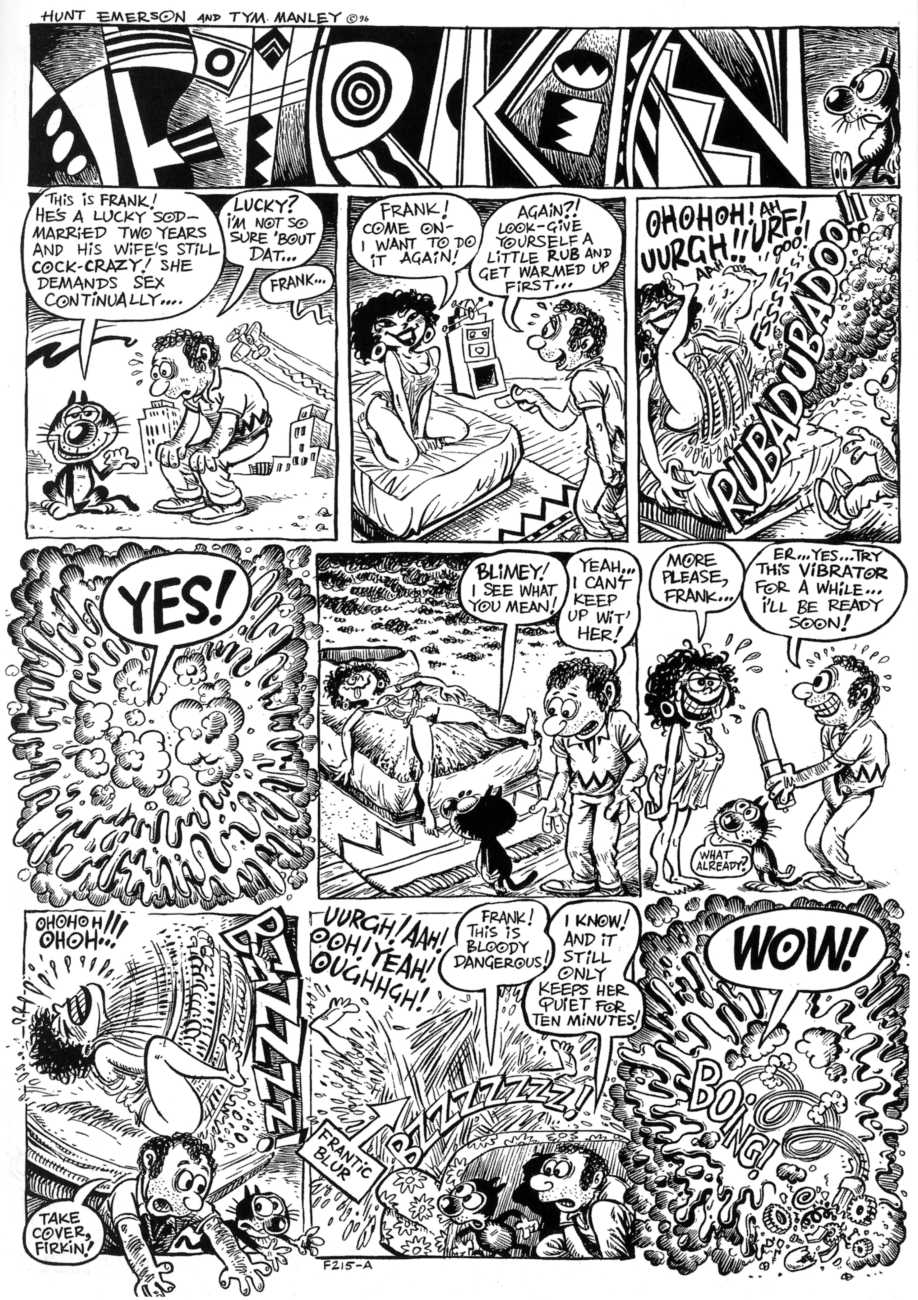 Hunt Emerson’s Firkin is a cat who, for nearly forty years in the pages of the UK-based Fiesta magazine, offered a humorous, anarchic, no-holds-barred commentary on the weirdness of human sexuality in all its tastelessness. Firkin’s adventures often involved absurd situations, satirical takes on sex and relationships, and playful jabs at societal norms. The strip blends traditional cartooning with adult content, risqué and irreverent. Firkin became one of Emerson's best-known characters, and the strip contributed to his reputation as one of the UK’s top underground cartoonists.
