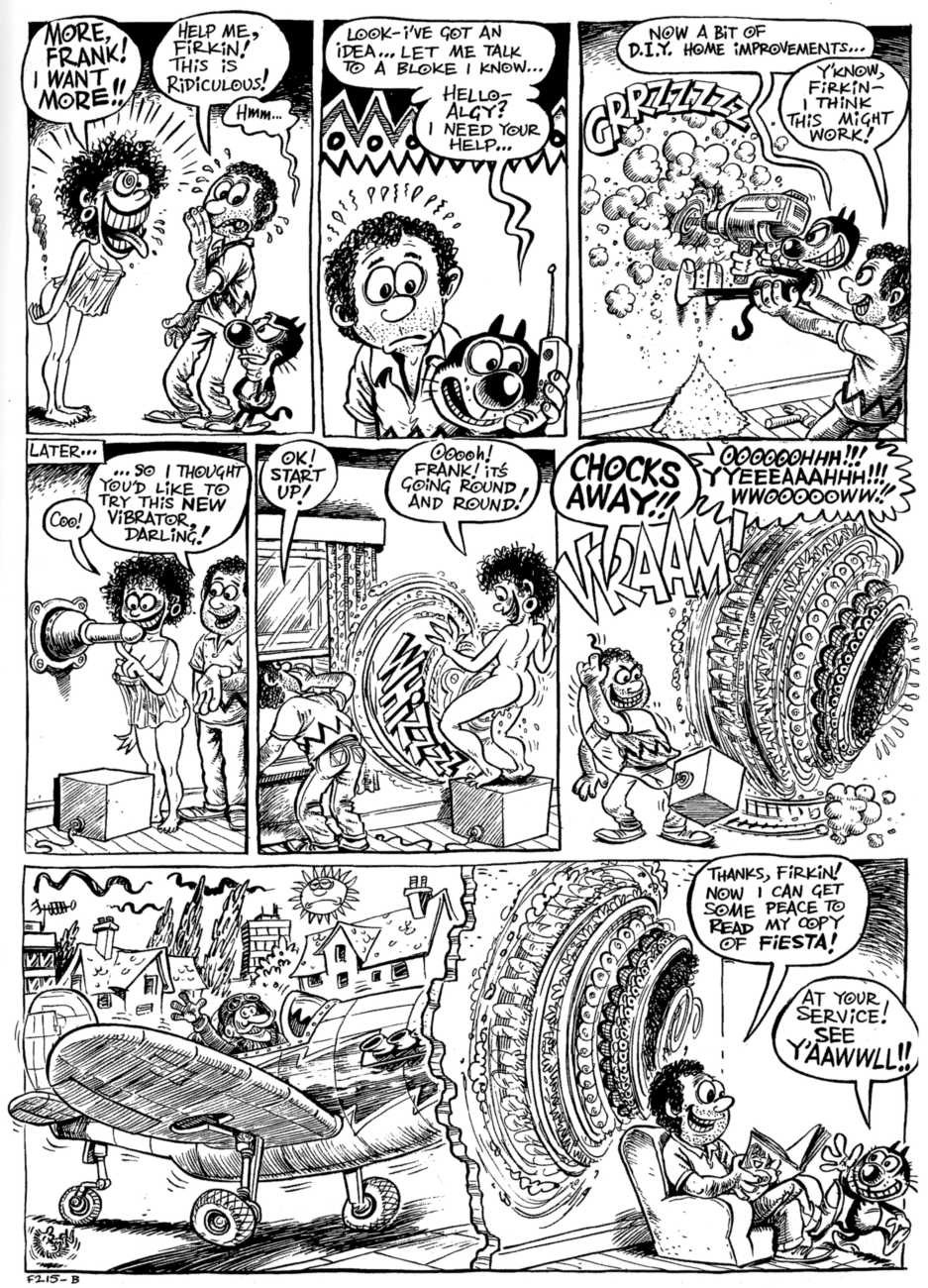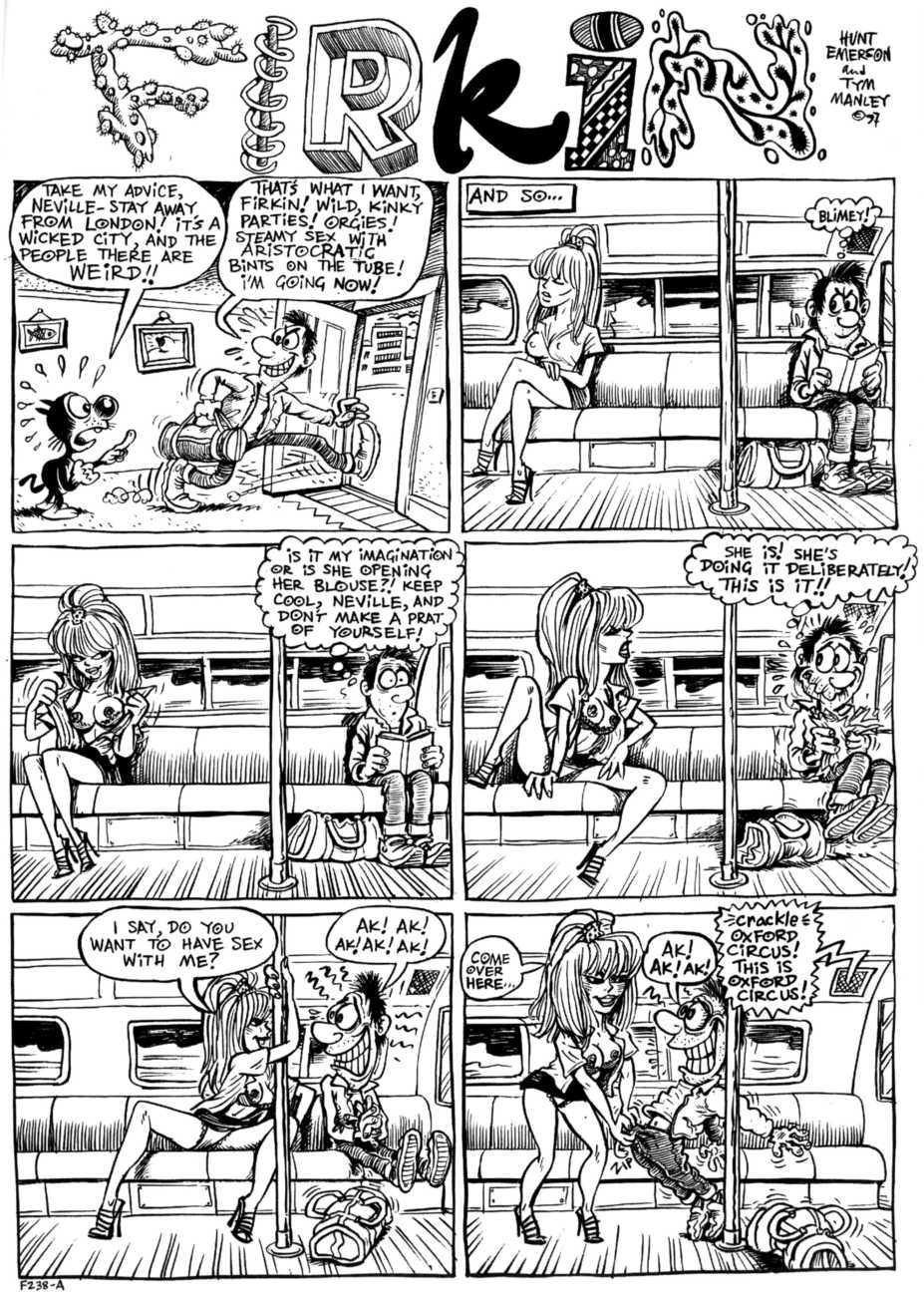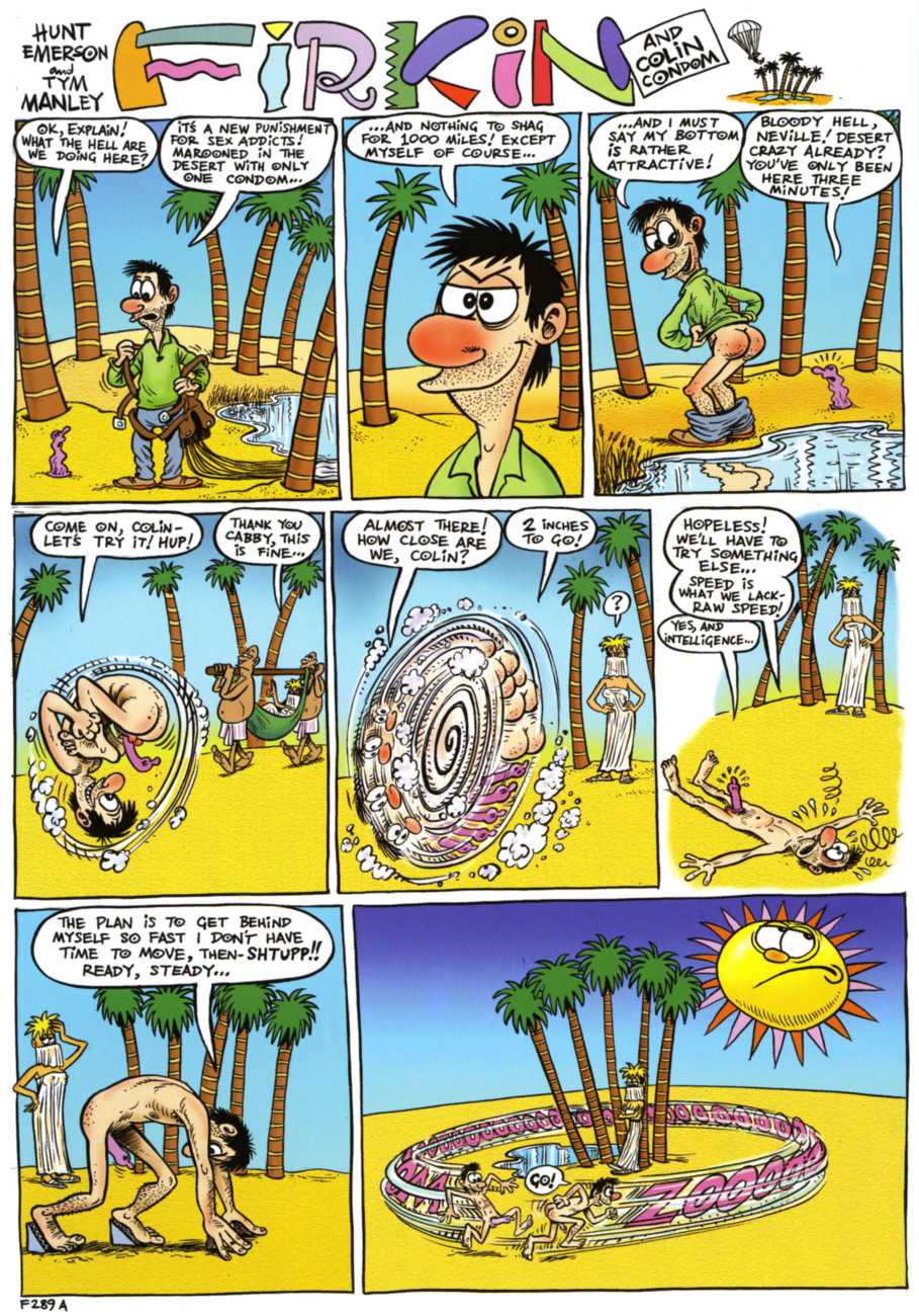 One of the great things about Firkin is that sex is generally so unglamorous in it. I go back and read them and I find myself roaring with laughter to be honest. I don’t know how Tym Manly managed to write them all, all those years. Tym was originally an editor of the magazine, but that was back in about 1968. He was a freelance writer for most of his life. He edited a mountain biking magazine and somehow or other he found himself writing Firkin. He doesn’t write any other comics. But just as I’ve done all those years, forty years of them, he was writing them. Incredible. I mean drawing them is basically sitting down and getting on with it. But writing them you have to come up with the ideas as well. God help us.