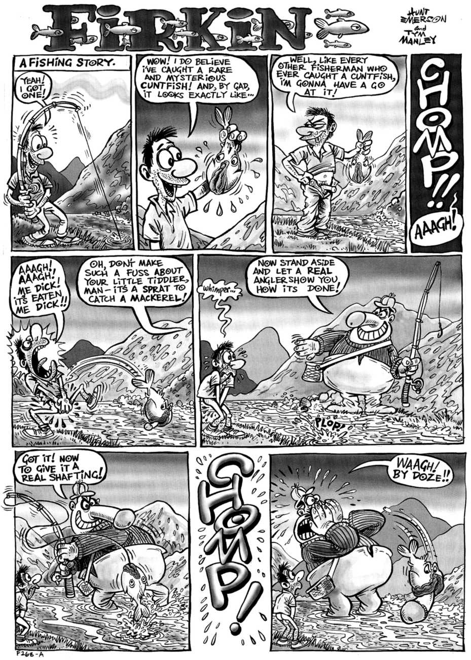 In 2002 Knockabout published an anthology of Firkin stories, from which we’ve selected fourteen typical double-page examples – if you want more you’ll have to go and buy the book (if you can find it). It was the intention that it should just be Volume 1, but whether there will ever be further volumes only Firkin knows.