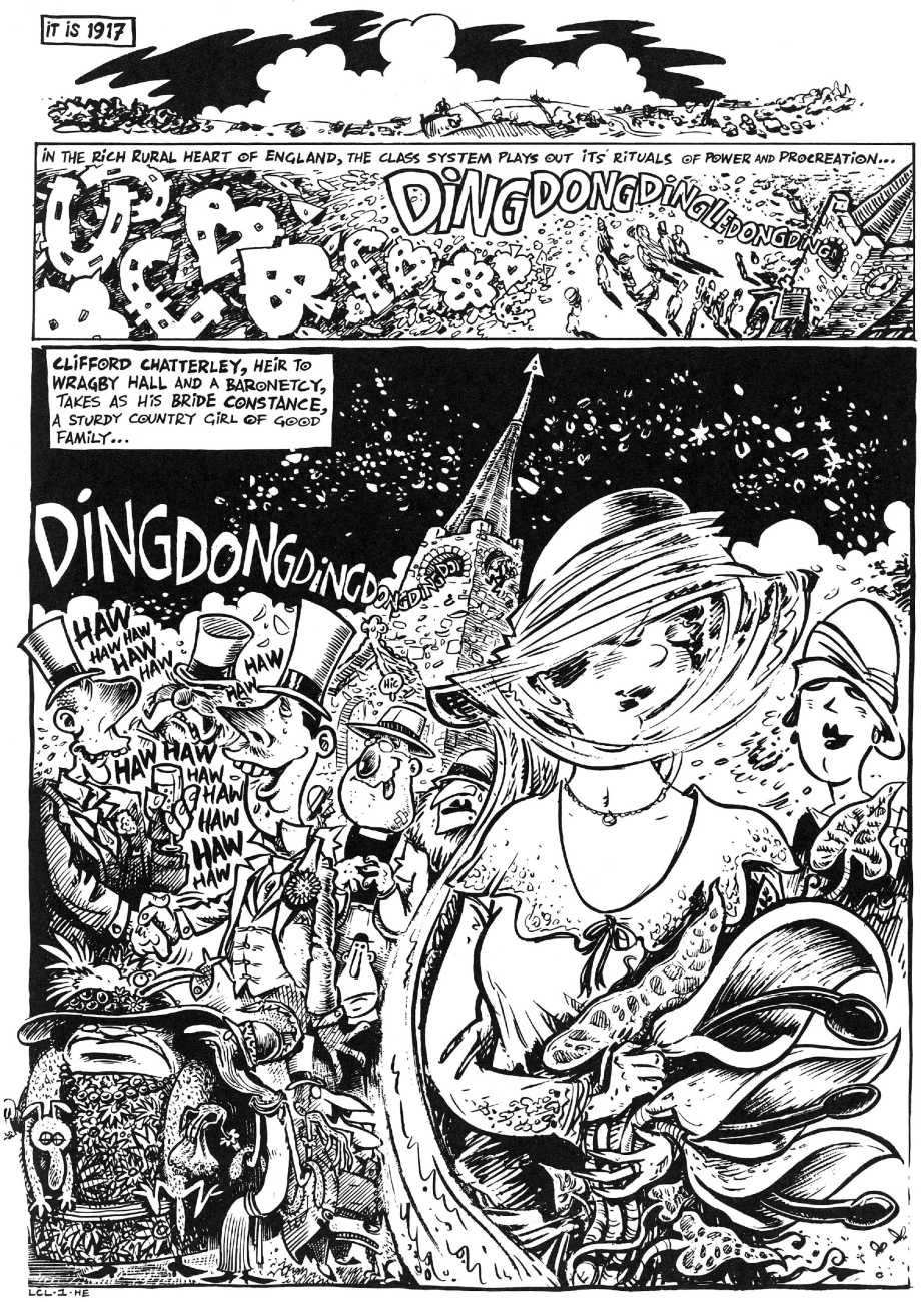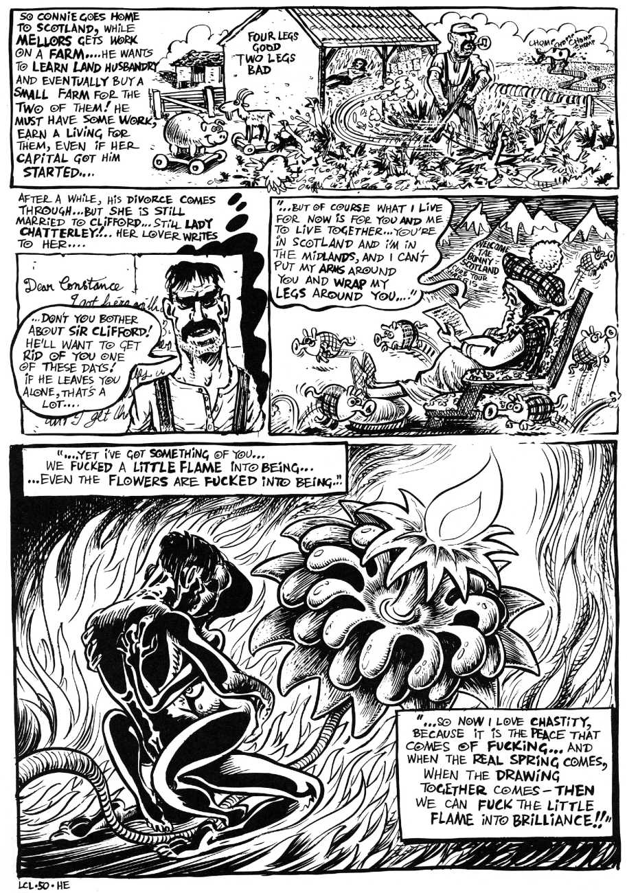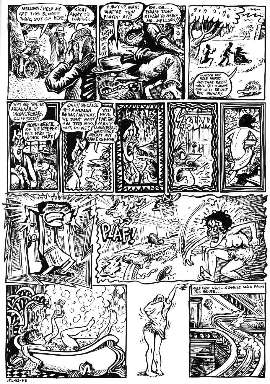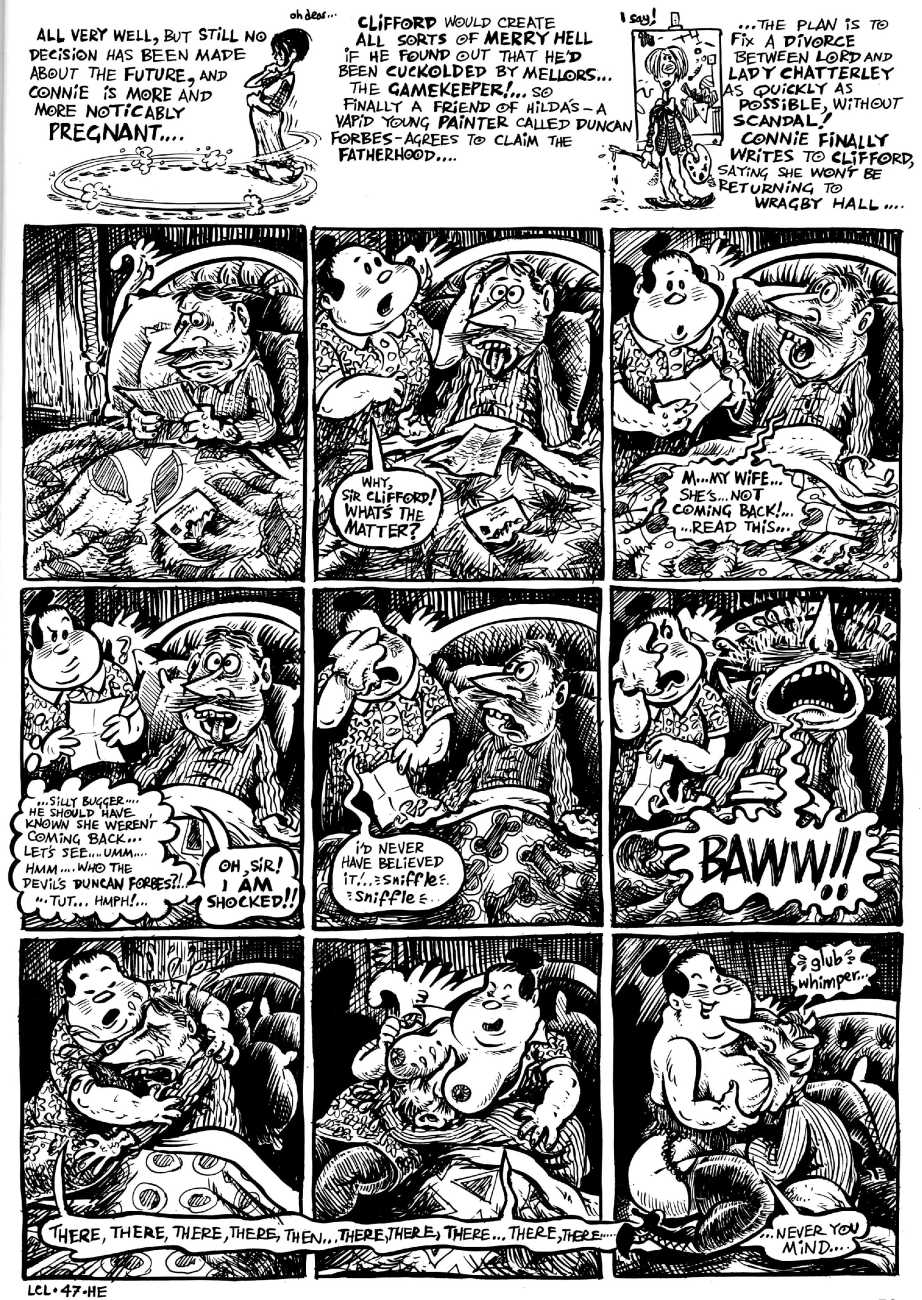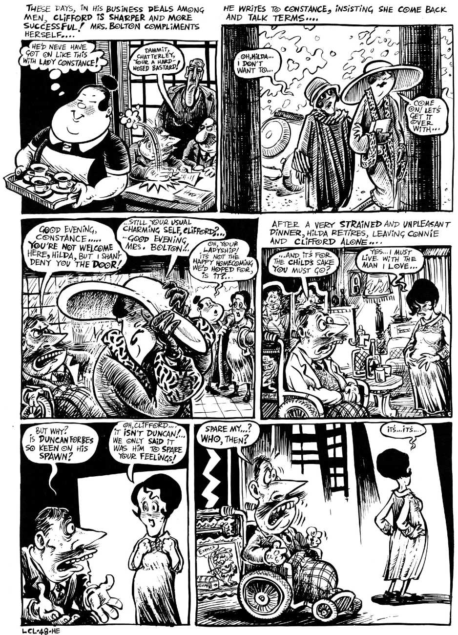 Emerson’s long association with Knockabout Comics resulted in some of the best adaptations of classic narratives in the history of comic books, producing such wonders as Dante’s Inferno and the three volume Bloke’s Progress, based on the works of John Ruskin. His witty and audacious adaptation of Lady Chatterley, however, stands out as the pinnacle of the collaboration, gaining widespread attention and positive feedback.