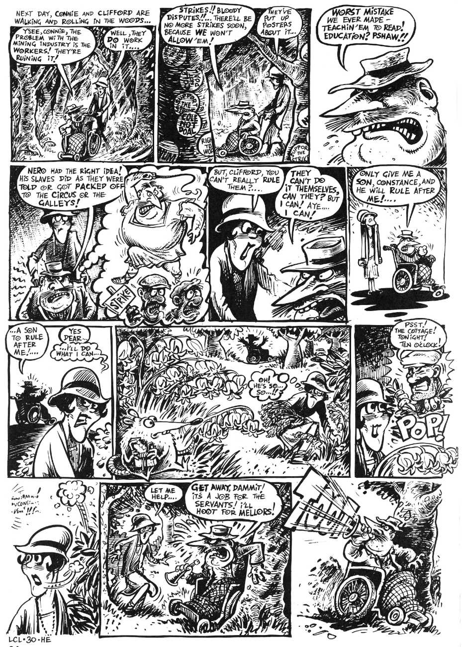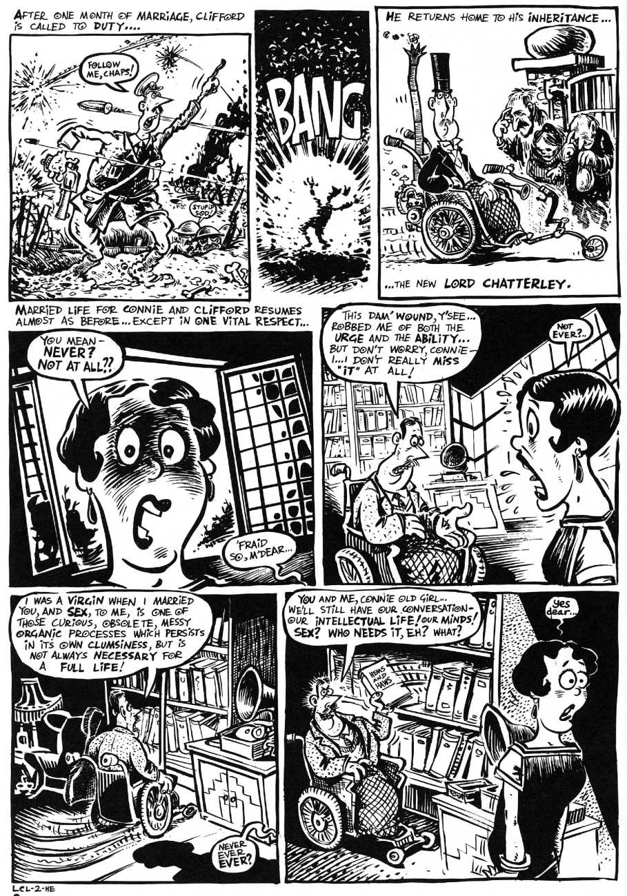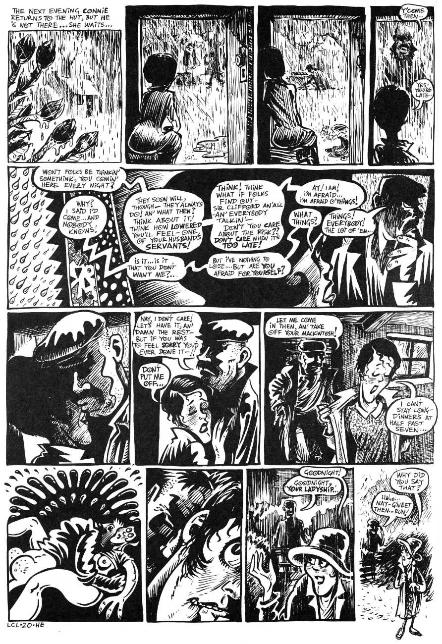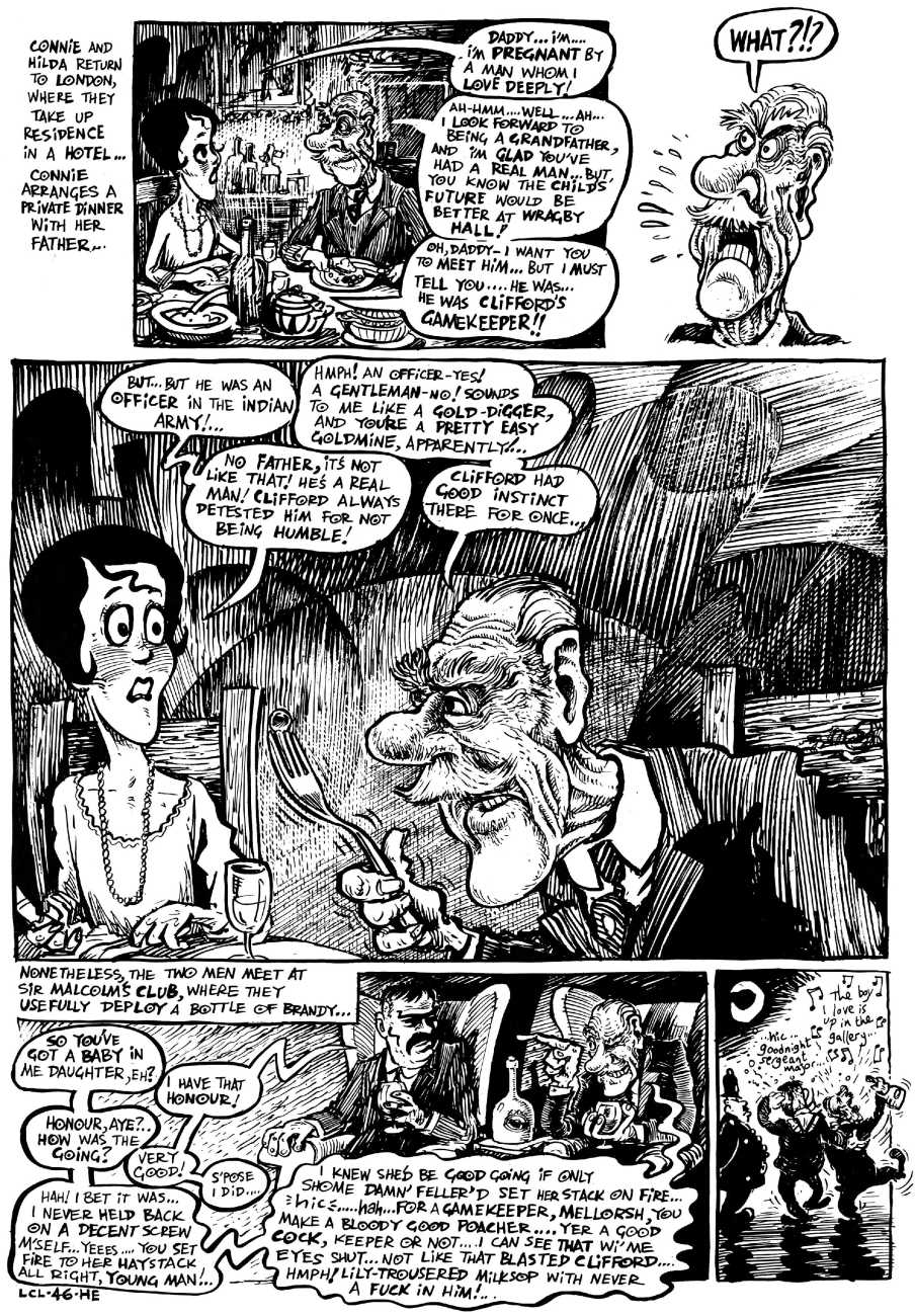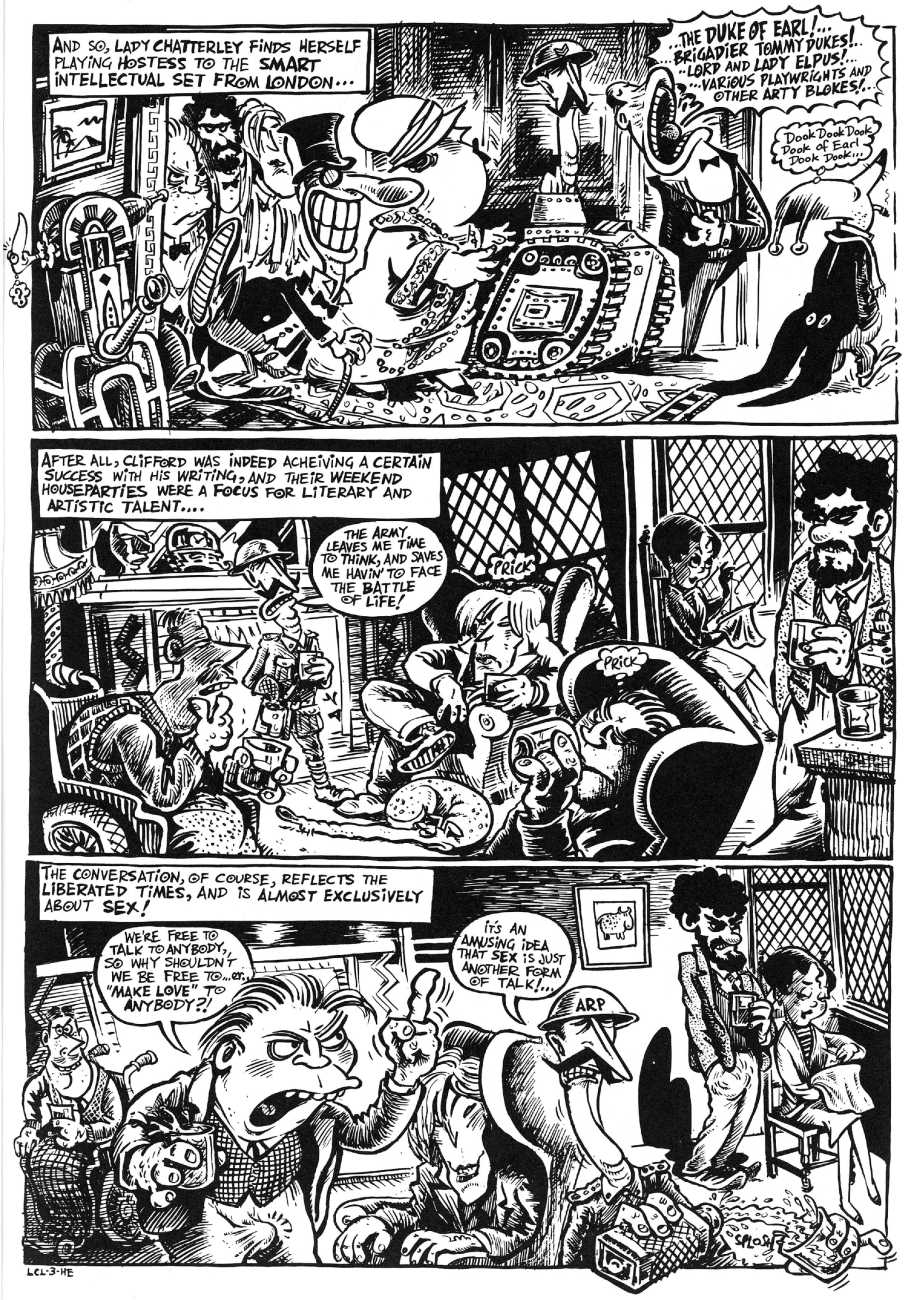 Emerson’s long association with Knockabout Comics resulted in some of the best adaptations of classic narratives in the history of comic books, producing such wonders as Dante’s Inferno and the three volume Bloke’s Progress, based on the works of John Ruskin. His witty and audacious adaptation of Lady Chatterley, however, stands out as the pinnacle of the collaboration, gaining widespread attention and positive feedback.