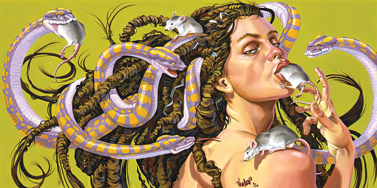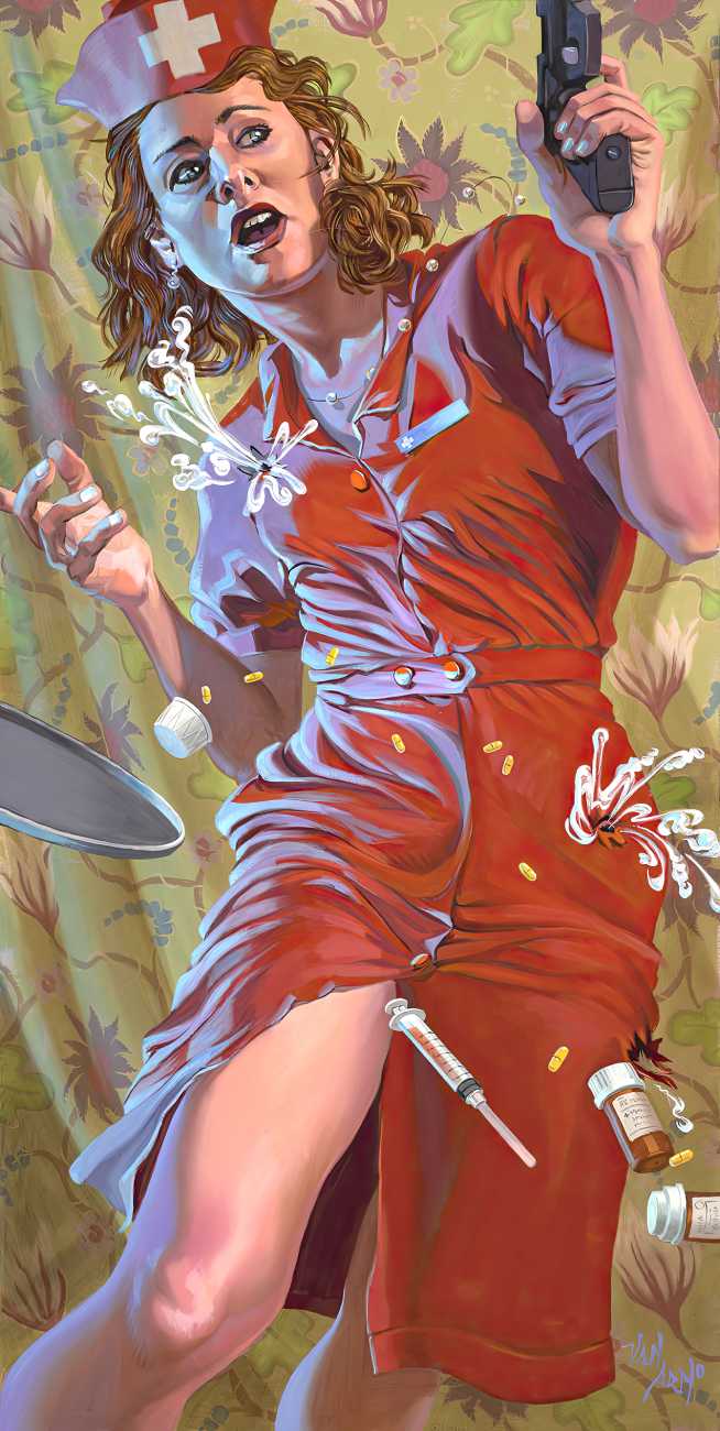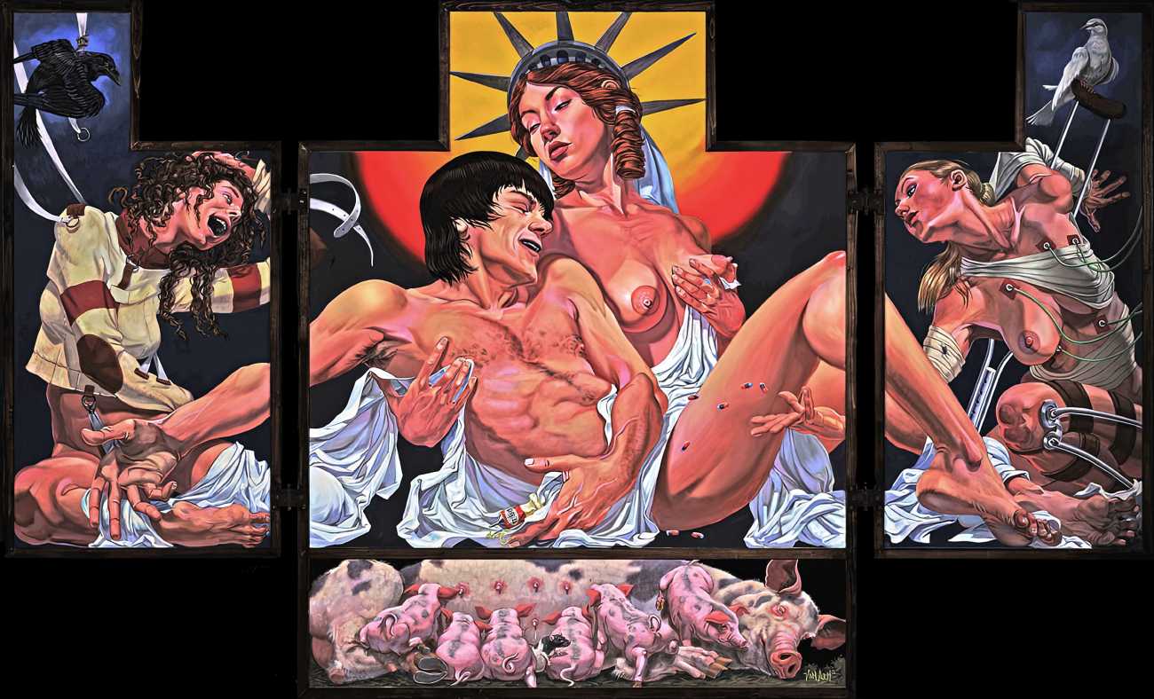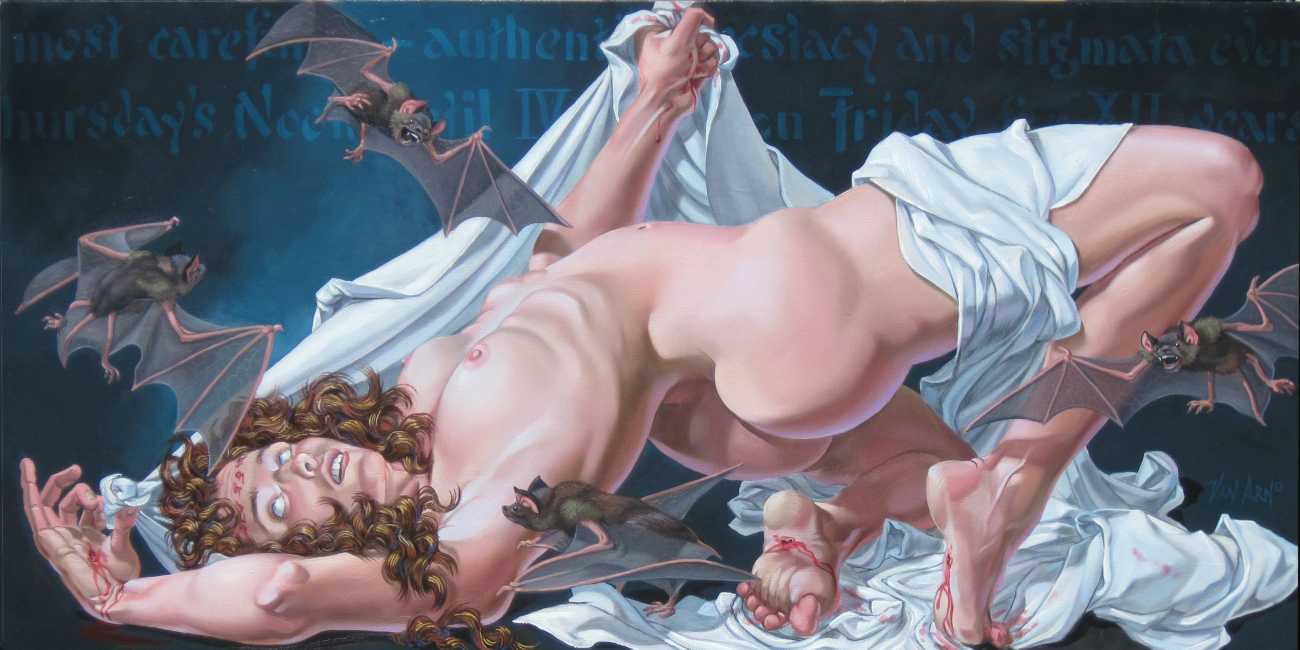 ‘I strive to make pictures no one has ever seen before – including or perhaps especially myself. Sometimes I do this by using subject matter that is stubbornly disjointed. Sometimes I build from a foundation of common knowledge from the collective subconscious to create something that has never been depicted visually. Sometimes an image that has been interpreted by artists for centuries seems ripe for a renovation. I attempt to paint the archetypical moment of clarity and passion, but above all else imagery must be made exciting and alive. The rules of lighting, anatomy, gravity and physics must be bent or broken to make the picture loud. That is the ultimate goal of my work.’