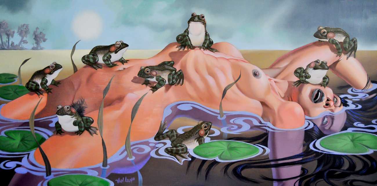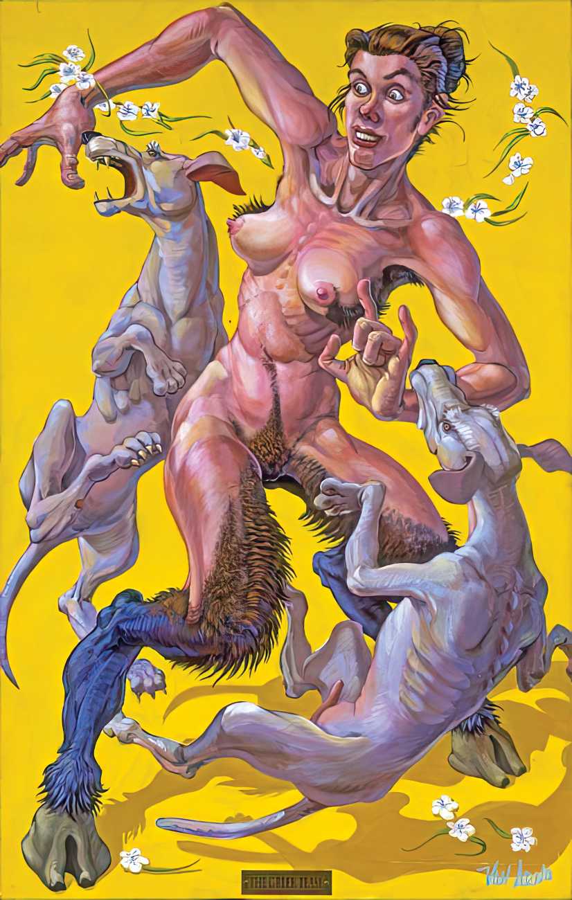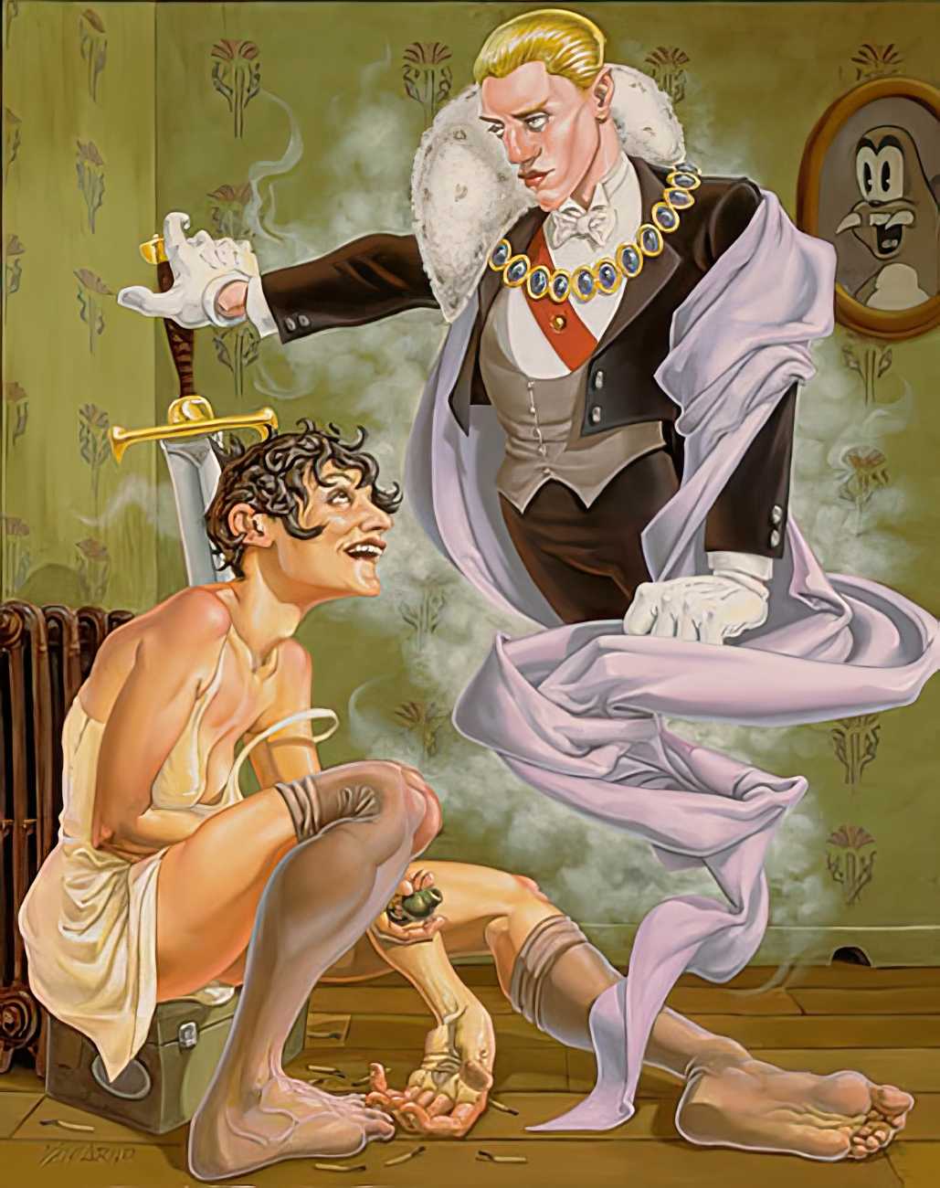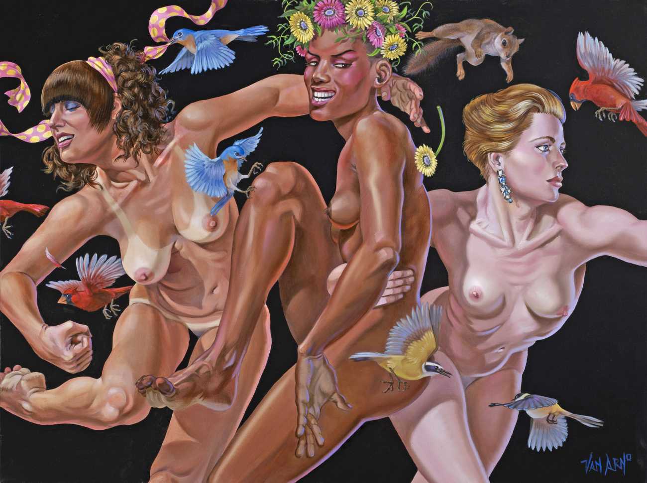 This is how Van Arno describes his paintings in the introduction to the 2008 collection of his work, Volume, which includes many of the paintings we have chosen to showcase his work, starting with a selection of the 1990s Olive Oyl series and moving through mythical and historical subjects to large-scale artworks inspired by well-known painters of historical scenes.