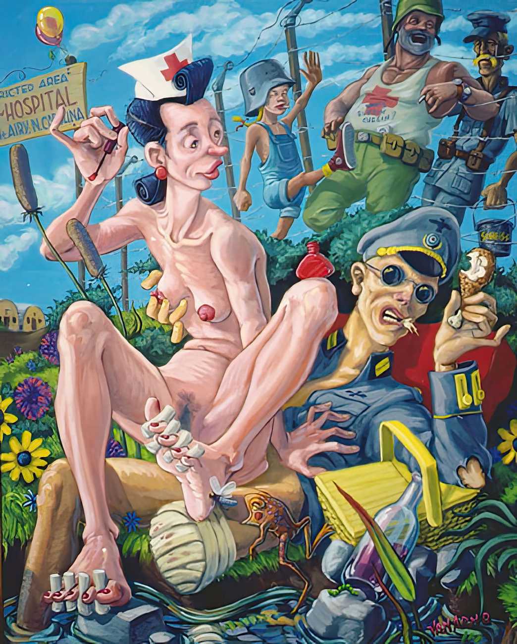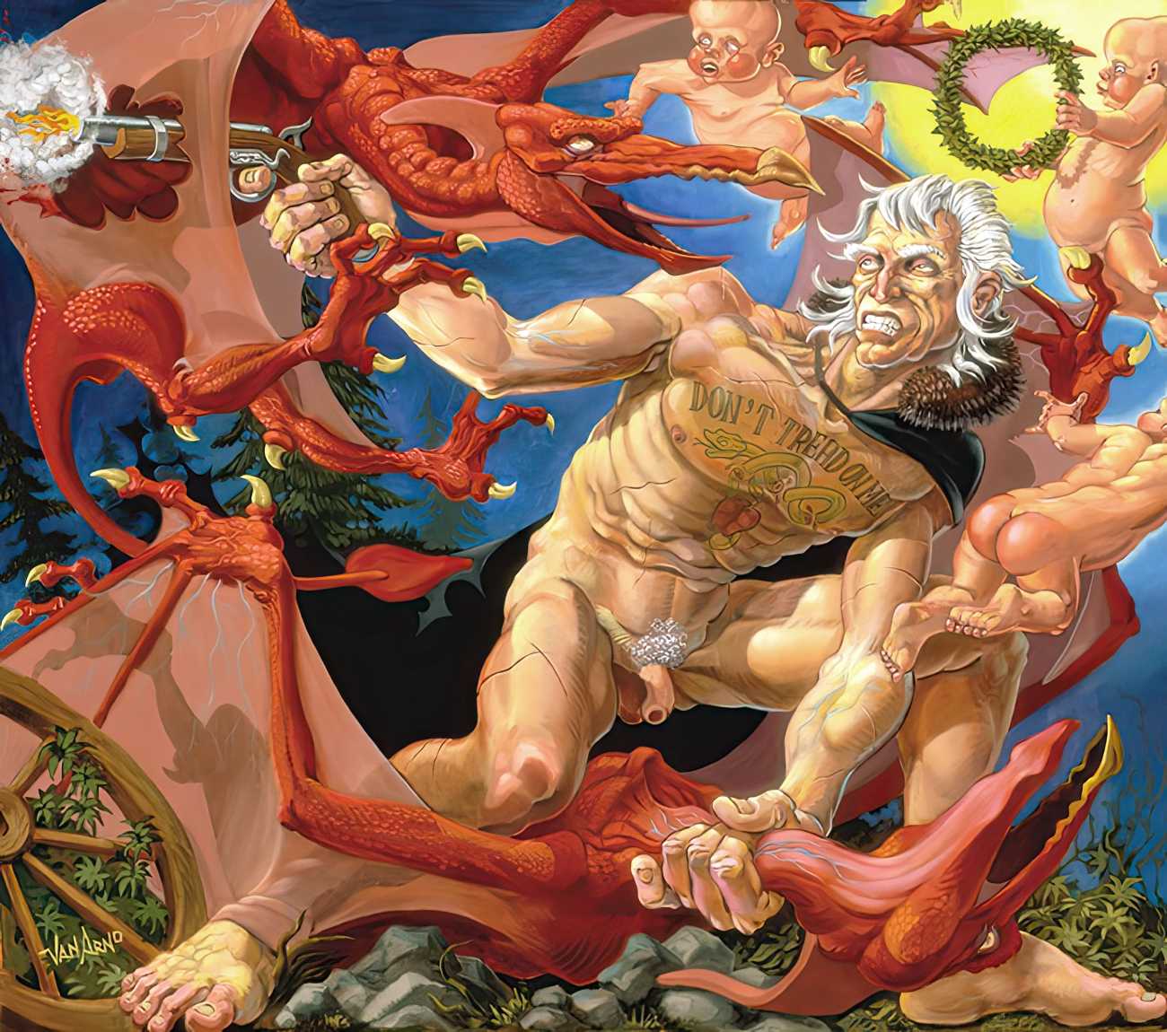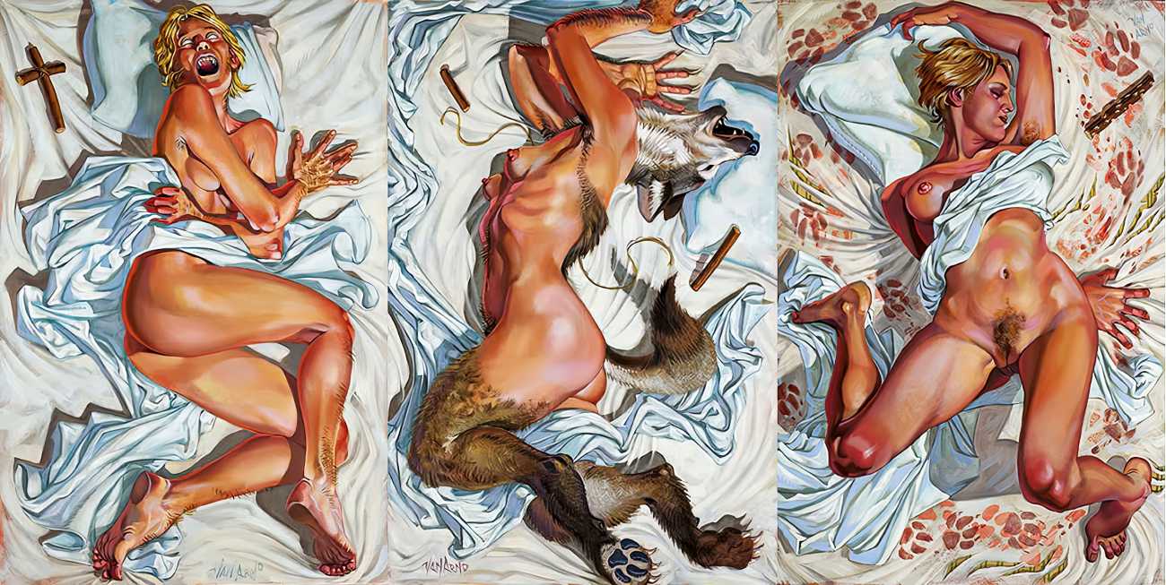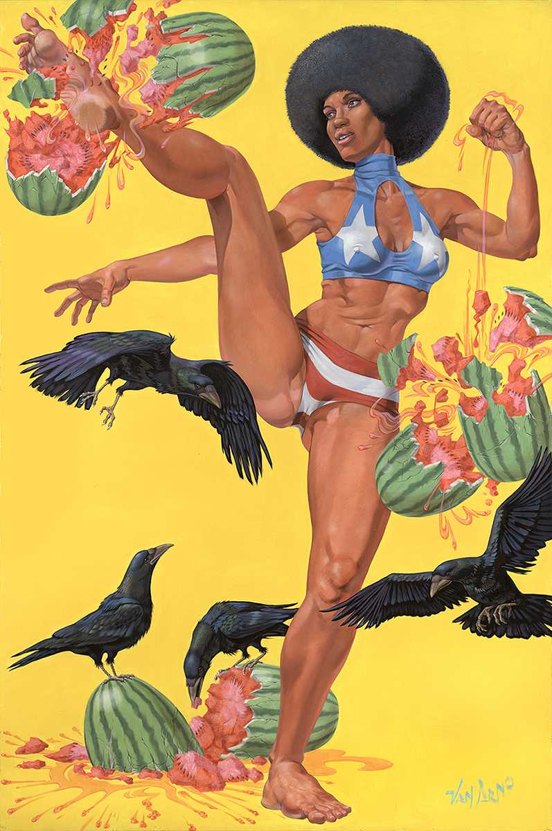 This is how Van Arno describes his paintings in the introduction to the 2008 collection of his work, Volume, which includes many of the paintings we have chosen to showcase his work, starting with a selection of the 1990s Olive Oyl series and moving through mythical and historical subjects to large-scale artworks inspired by well-known painters of historical scenes.