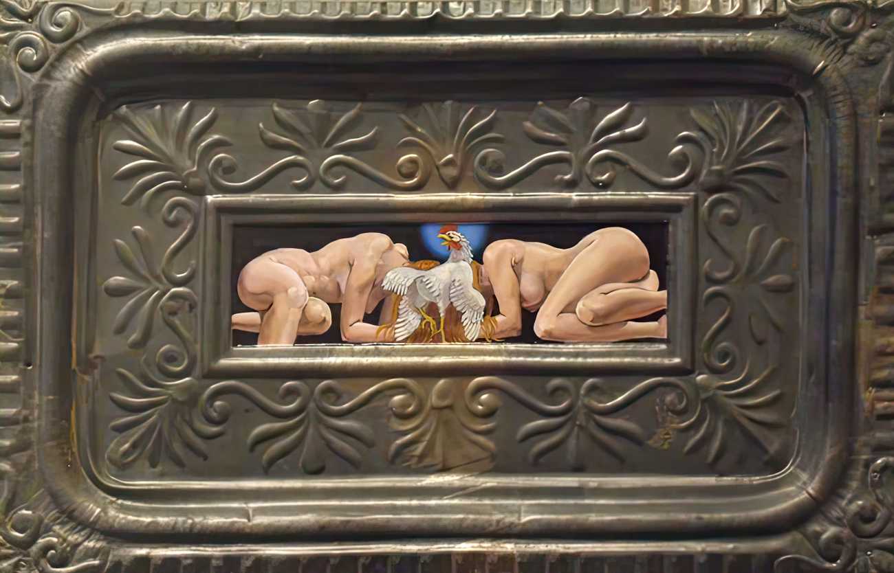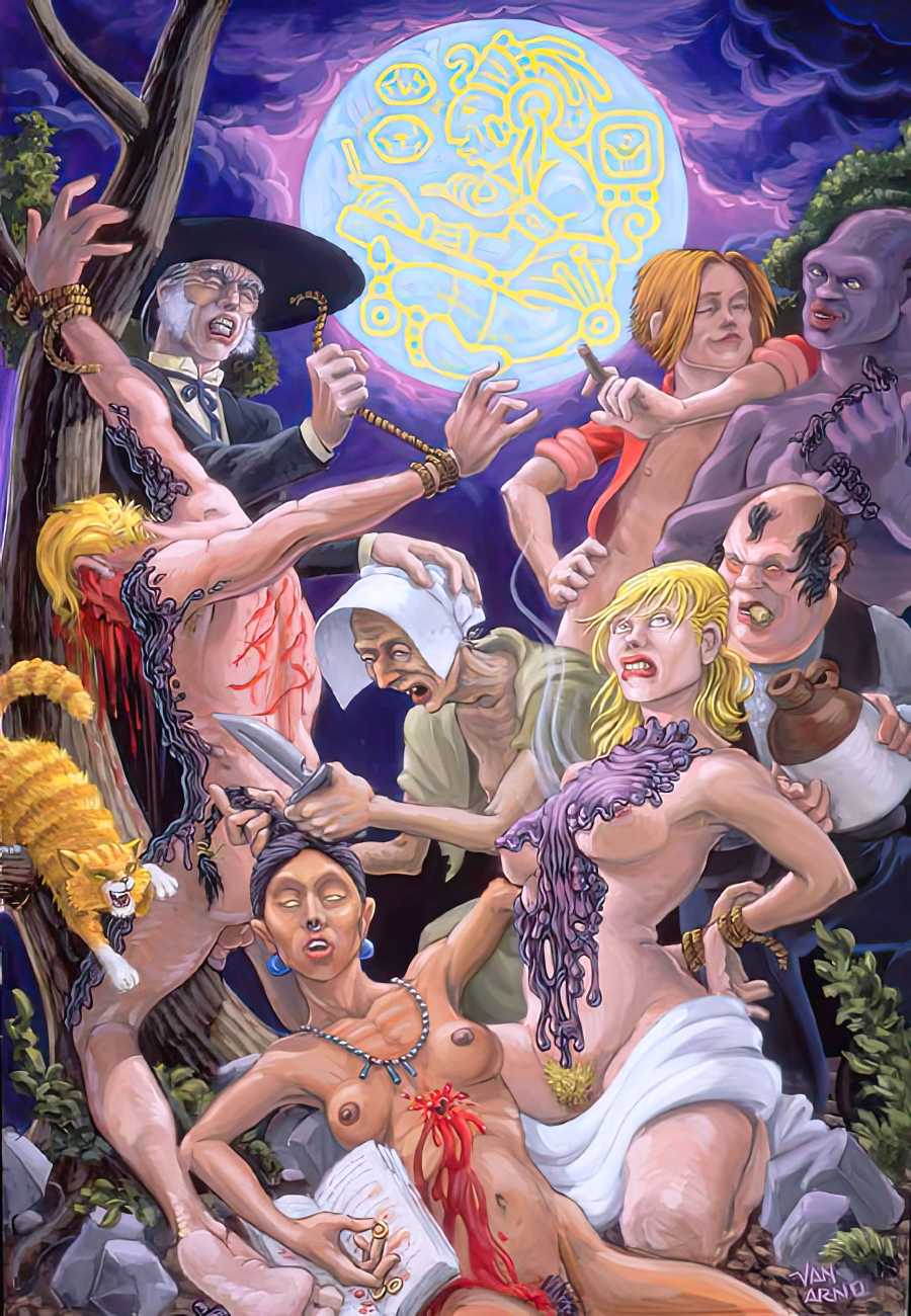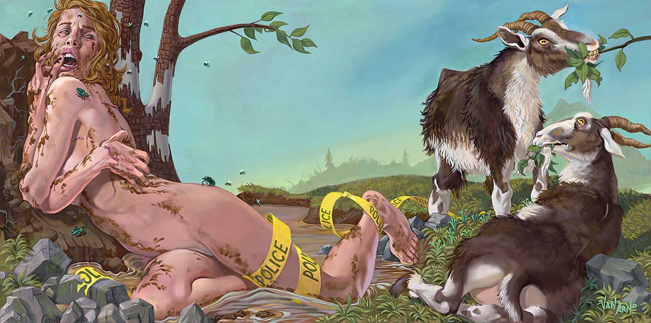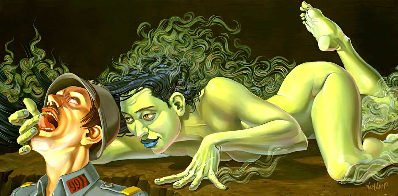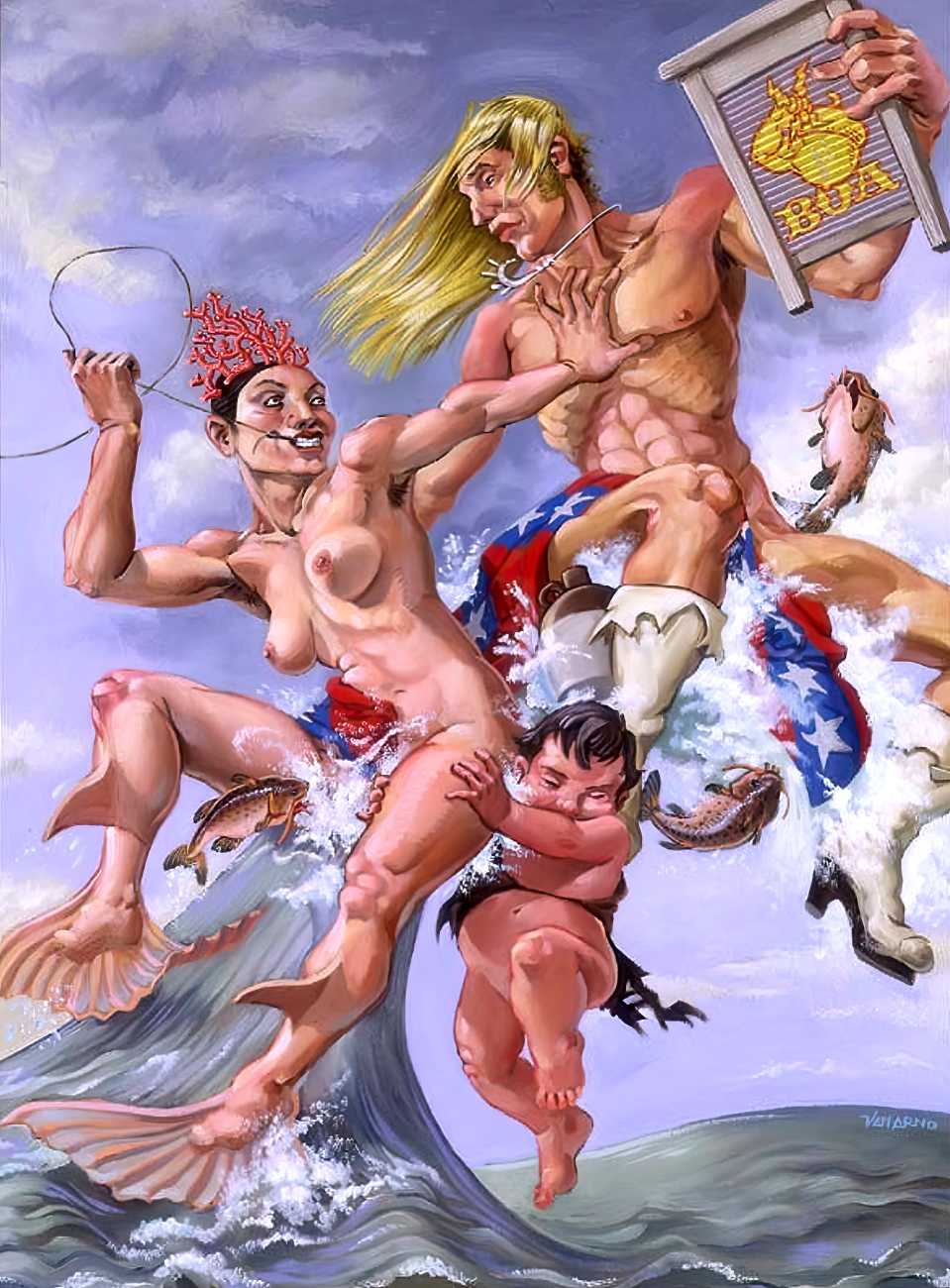 This is how Van Arno describes his paintings in the introduction to the 2008 collection of his work, Volume, which includes many of the paintings we have chosen to showcase his work, starting with a selection of the 1990s Olive Oyl series and moving through mythical and historical subjects to large-scale artworks inspired by well-known painters of historical scenes.