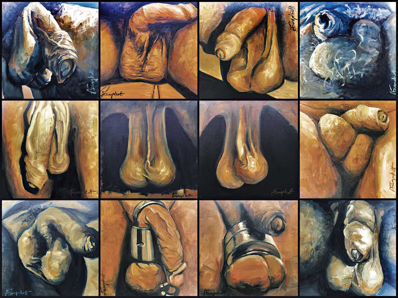 ‘Two Dozen Eggs’ is a witty, close-up study of twelve different men’s dangly bits, painted in bold colourful oils. That’s it. Click images to see full-size versions