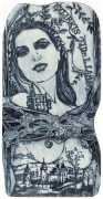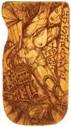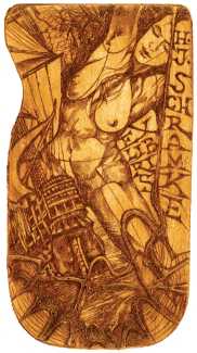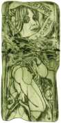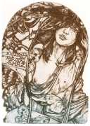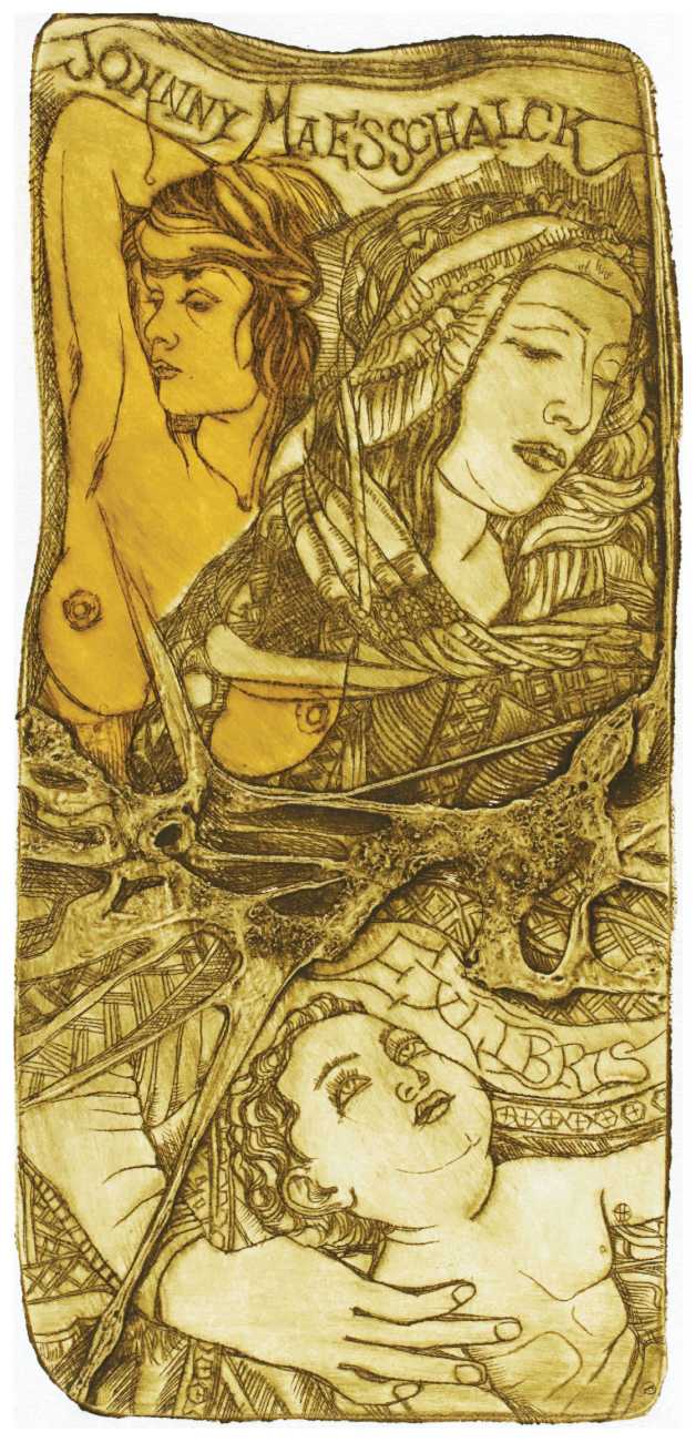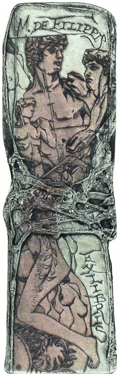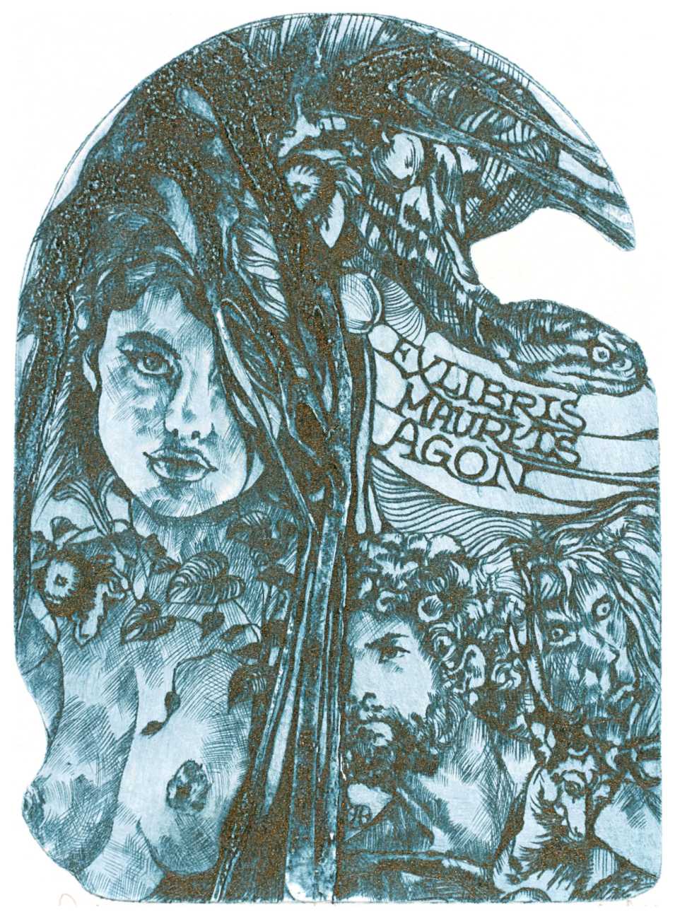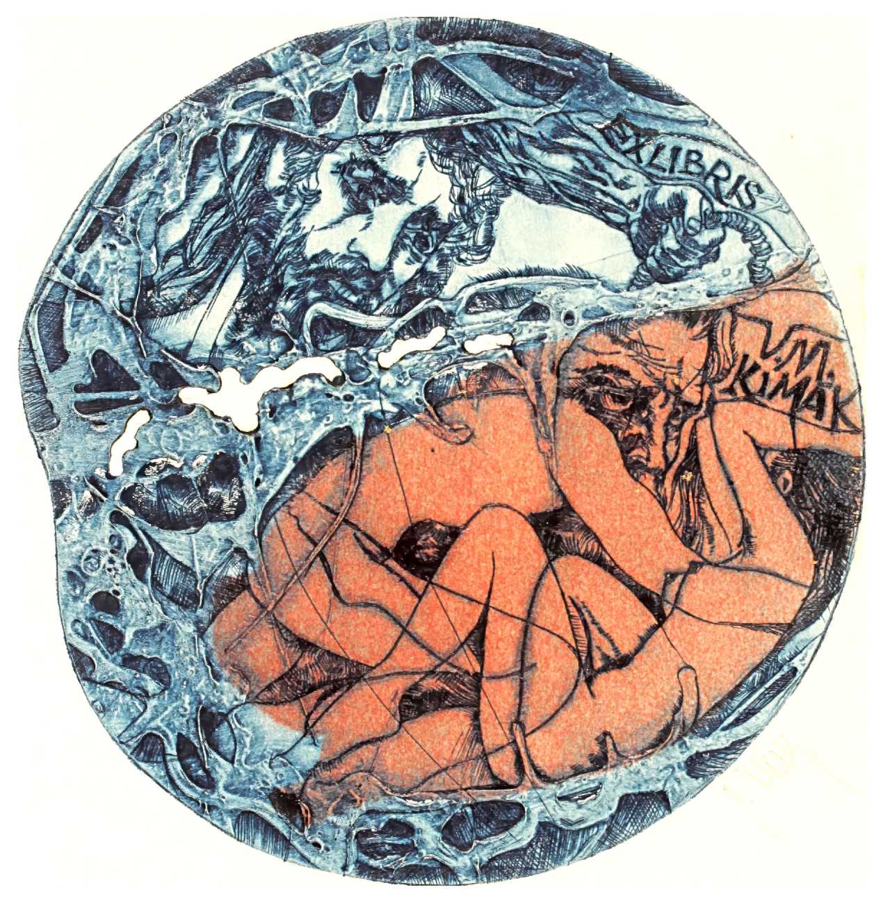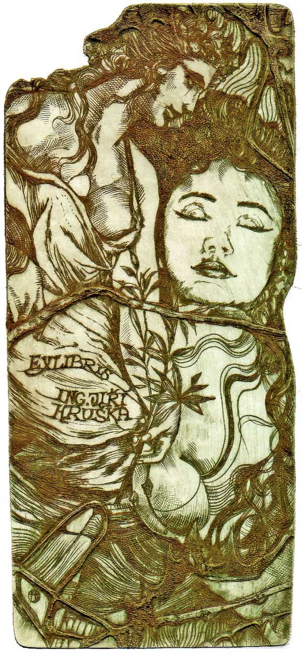 Like many eastern European artists, one of Pavel Hlavatý’s specialities is the ex libris or bookplate, which in Hlavatý’s talented hands becomes a colourful jewel of miniature detail and imagination. Each of these small masterpieces, of which he has already created more than eight hundred, displays a carefully thought out repertoire of characters and interactions, clearly interpreting the client’s brief and particular interests. Most include some witty and pertinent erotic element, and a particular feature of many of Pavel Hlavatý’s bookplates is that he experiments with shapes and outlines, unlike the uniformly rectangular designs of most ex libris. Thus we have circular bookplates, tall thin bookplates, bookplates with cutouts at the edges.