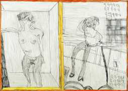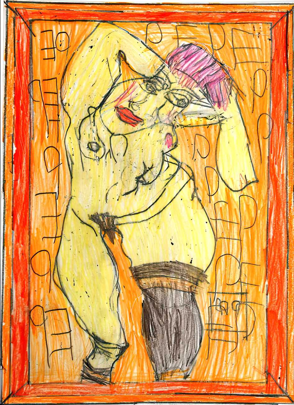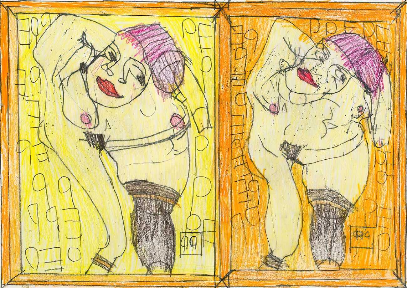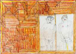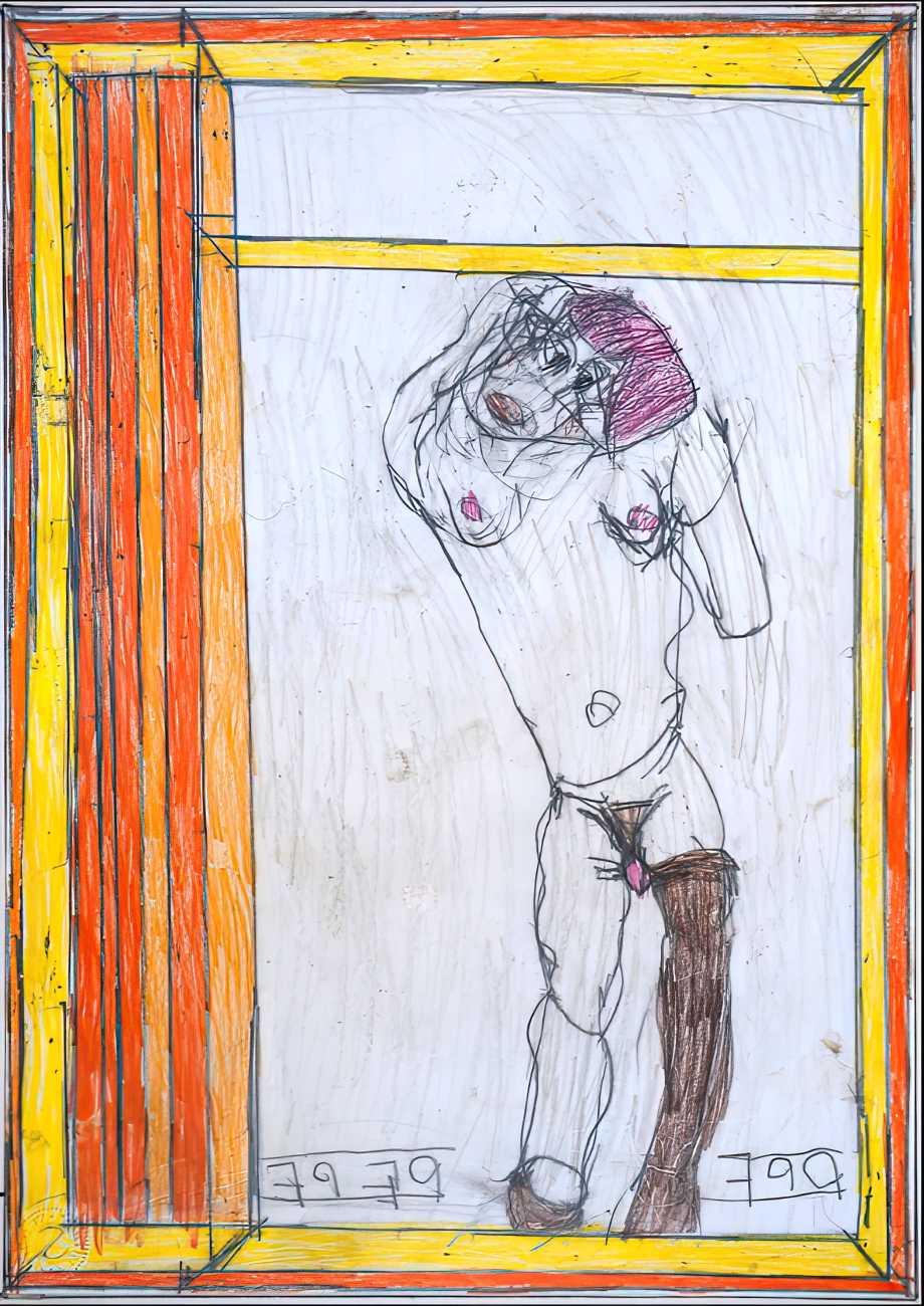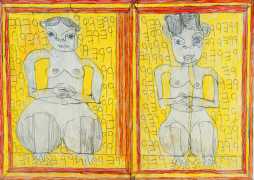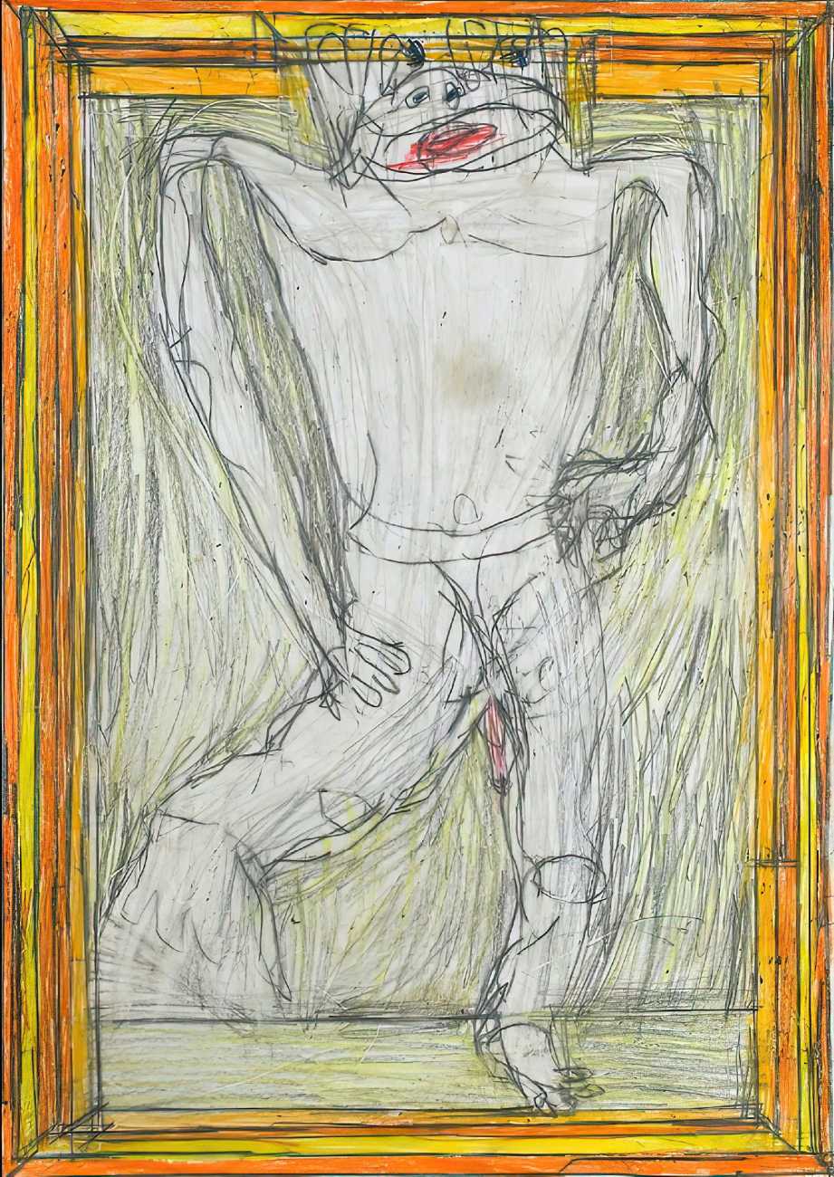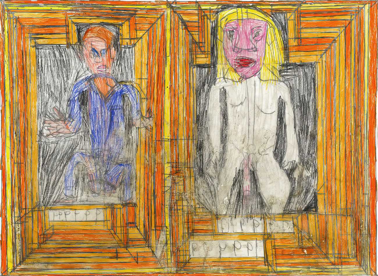 Often signed Pepi, Hofer’s works are essentially observations and narrations of his own life. His drawings can be seen as a kind of mirror, reflecting both Hofer and the spectator while also expressing the hypnotic innocence of art. As Michel Thévoz writes, ‘Josef Hofer is in a state of grace – an erotic, untrammelled form of grace where the body strives to break free from the prison of the frame.’