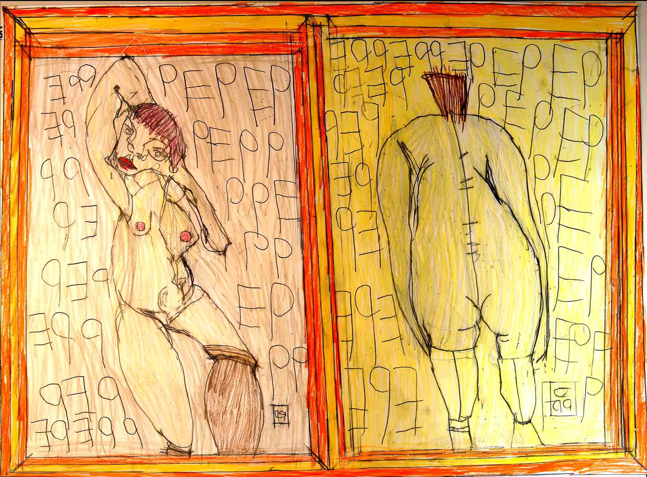 In 2013 the Collection de l’Art Brut/Infolio in Lausanne published a study of Hofer’s work, with 29 representative illustrations and an introduction by Lucienne Peiry. The book, titled simply Josef Hofer, includes a piece by art historian Michel Thévoz exploring the work of Hofer and providing a wide-ranging analysis, considering many of the characteristics of his ‘art brut’ works. Thévoz looks at various aspects of the history of the mirror, developing concepts intrinsically linked with it – image and reflection, illusion and reality, identity and otherness. He examines the importance of the mirror in Hofer’s work, and concludes that ‘in seeking to reach the object of his desire, Hofer experiences the mirror as a kind of birth’. Thévoz’s essay is followed by the perspective of neuroscientist Olaf Blanke, who specialises in bodily self-perception and self-awareness. Blanke, who views the mirror as an way to selfd-knowledge, argues that ‘it was perhaps by looking at himself from the outside that Hofer began to draw himself from the inside’.