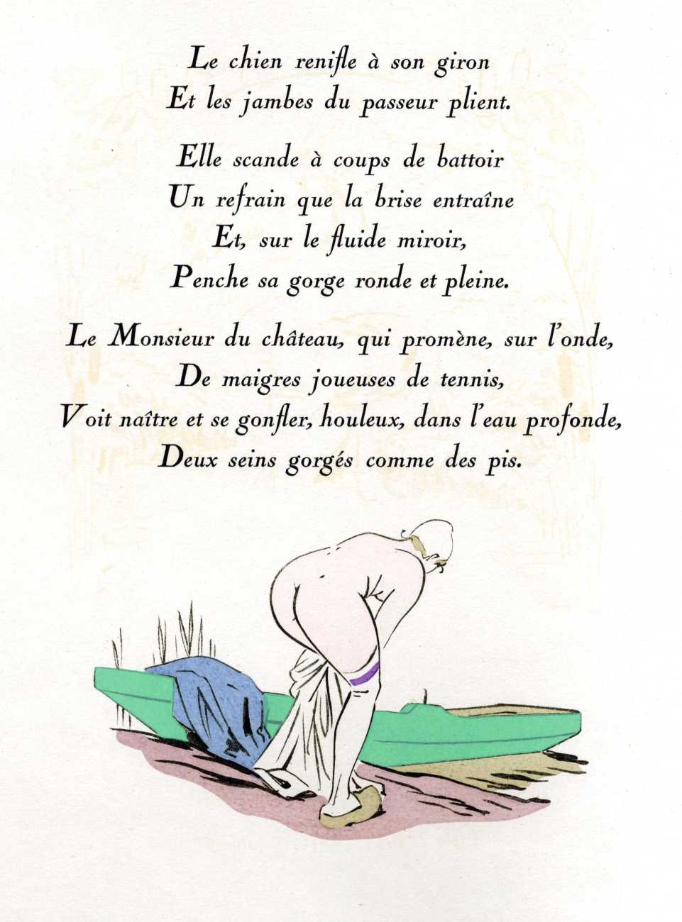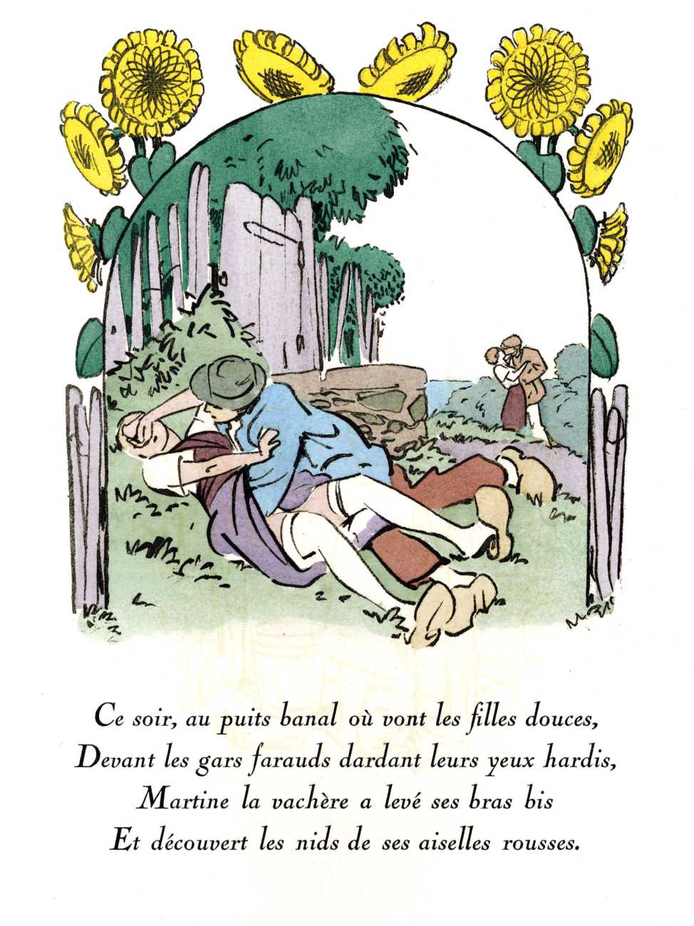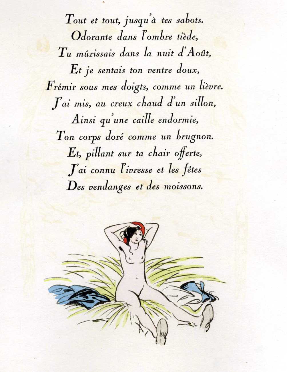 La fermière nu (The Naked Farmgirl) is the only known poetry collection by Louis-Charles Royer (1885–1970), a Parisian writer who specialised in popular erotic literature with titles like Love Camp, La maîtresse noire, Unrepentant Sinners, L’amour en Allemagne, The Redhead from Chicago, The Harem, La danseuse de Singapour, African Mistress, and L’amour chez les Soviets. On average he churned out one or two a year, from 1928 to the early 1960s, and some were regularly reprinted in both French and English.