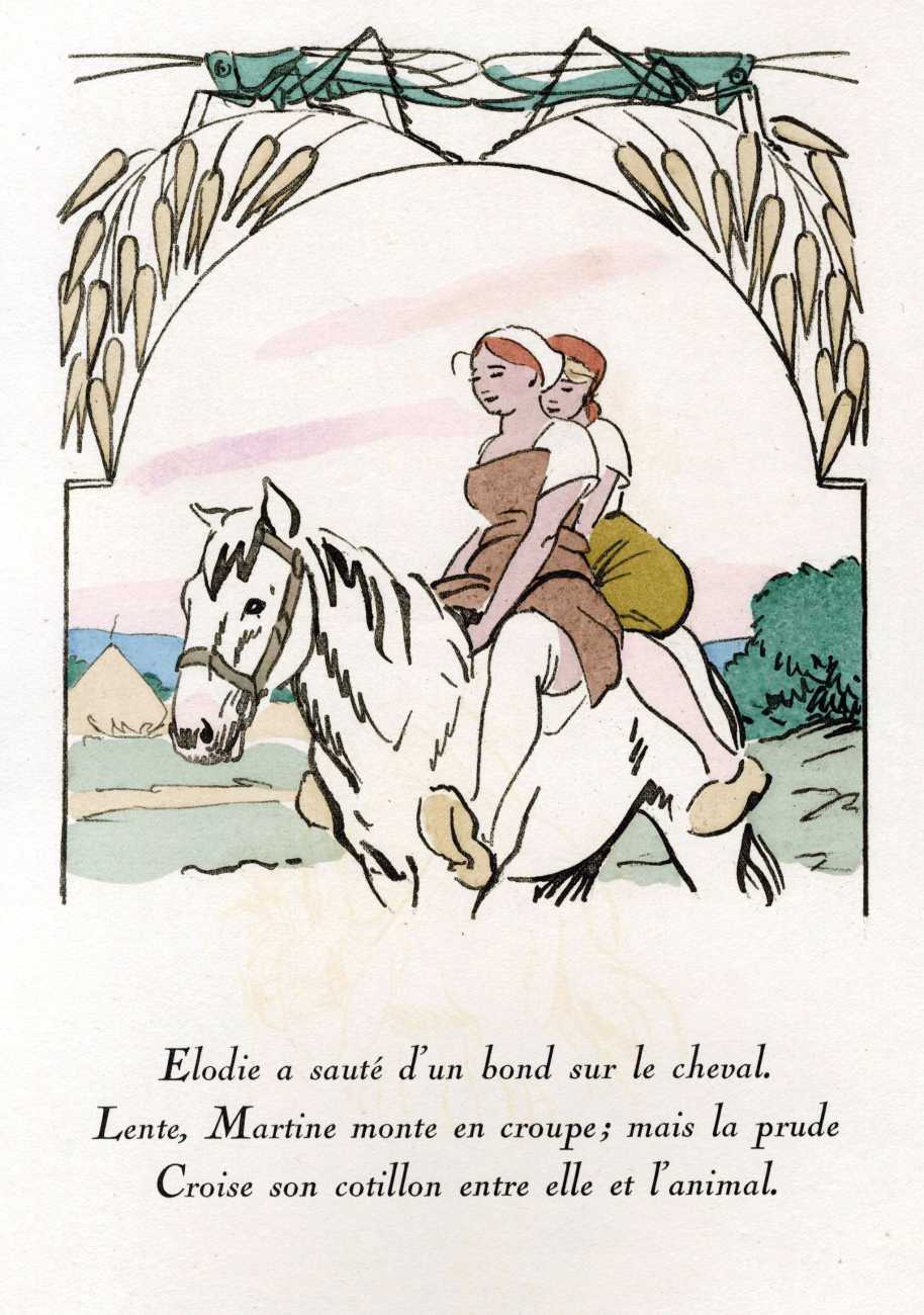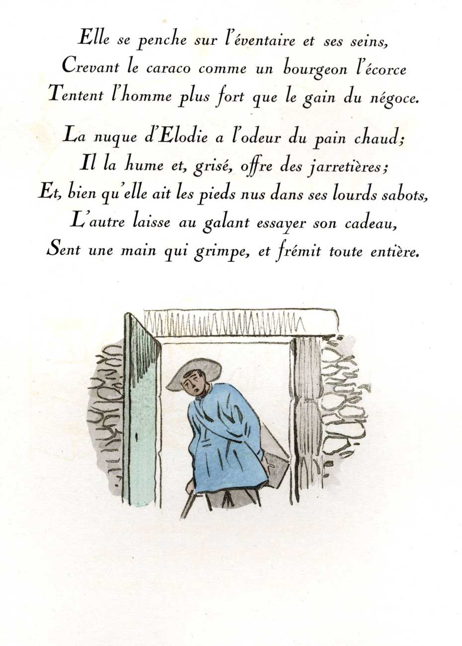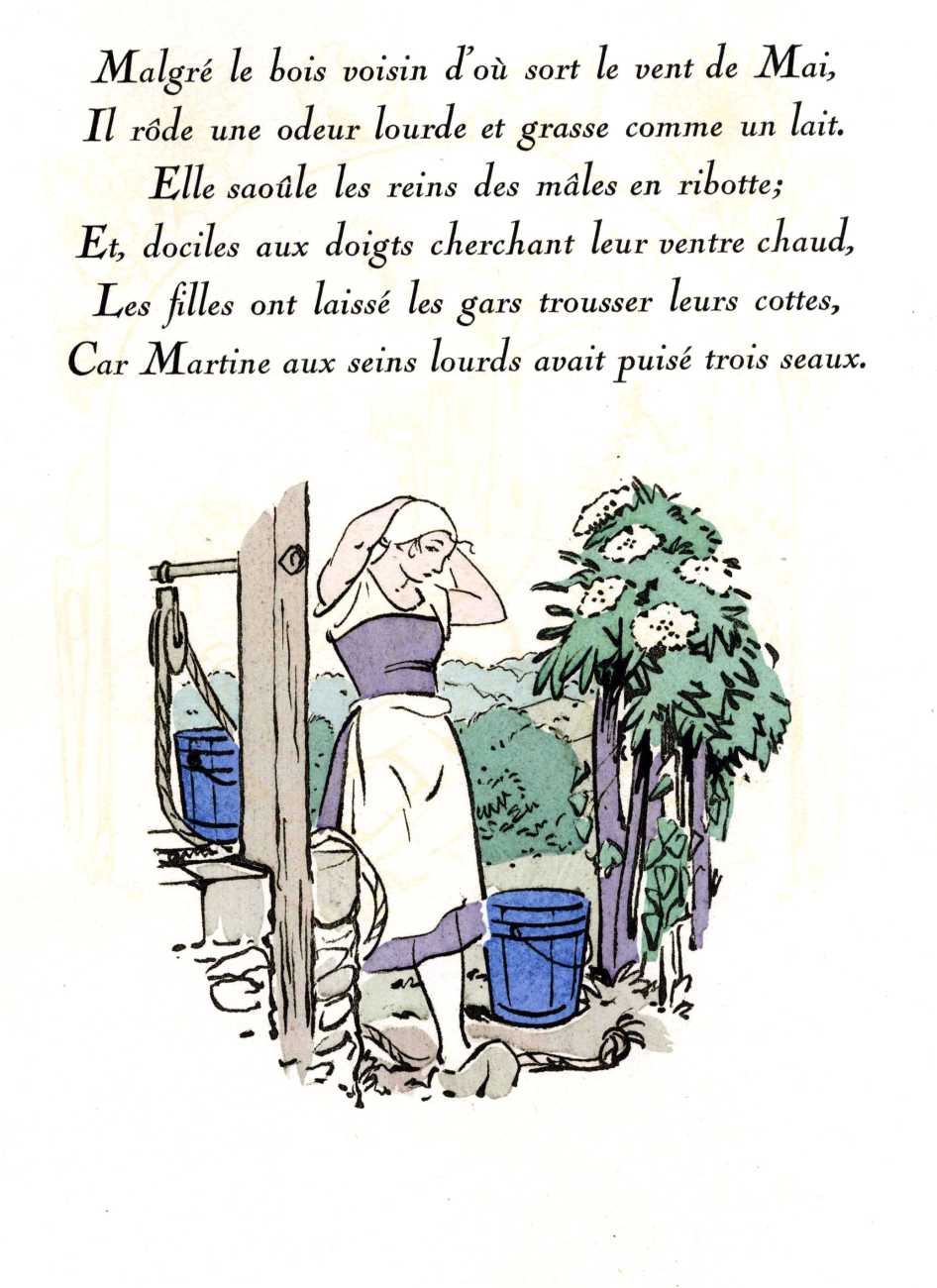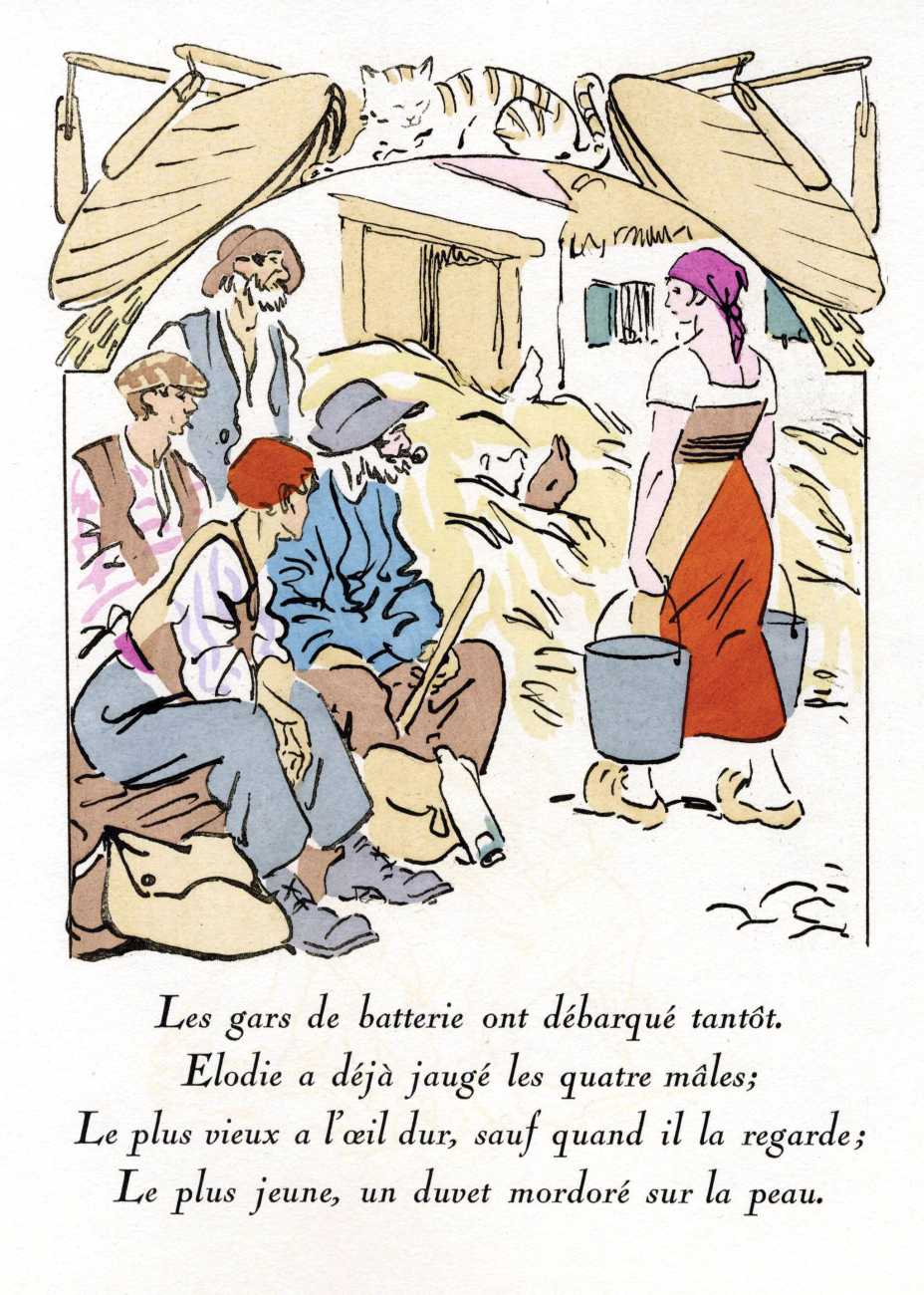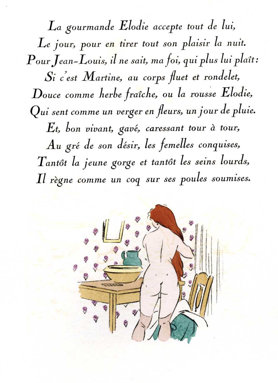 In this cycle of fourteen linked poems, ‘ardent Elodie’ and her friend Martine appear first very innocently on a swing in the orchard, but as their farmyard experience expands to an awareness of eligible farmhand Jean-Louis so the clothes gradually become detached from the nubile bodies. Carlègle’s pastel illustrations are a perfect match for Royer’s text.