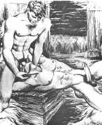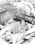 The Barn is a groundbreaking sequence of twelve homoerotic drawings, the graphic narrative depicting a sexual encounter between a farmboy hitchhiker and a motorcyclist seeking shelter in a barn from the rain. The drawings are notable for their explicit detail and storytelling, capturing a moment of rural Americana infused with raw eroticism. Bate’s art often featured working-class men – farmboys, truckers and sailors – engaged in passionate encounters. His figures are characterised by their lean, elongated forms and expressive eyes, conveying physical desire and emotional depth.